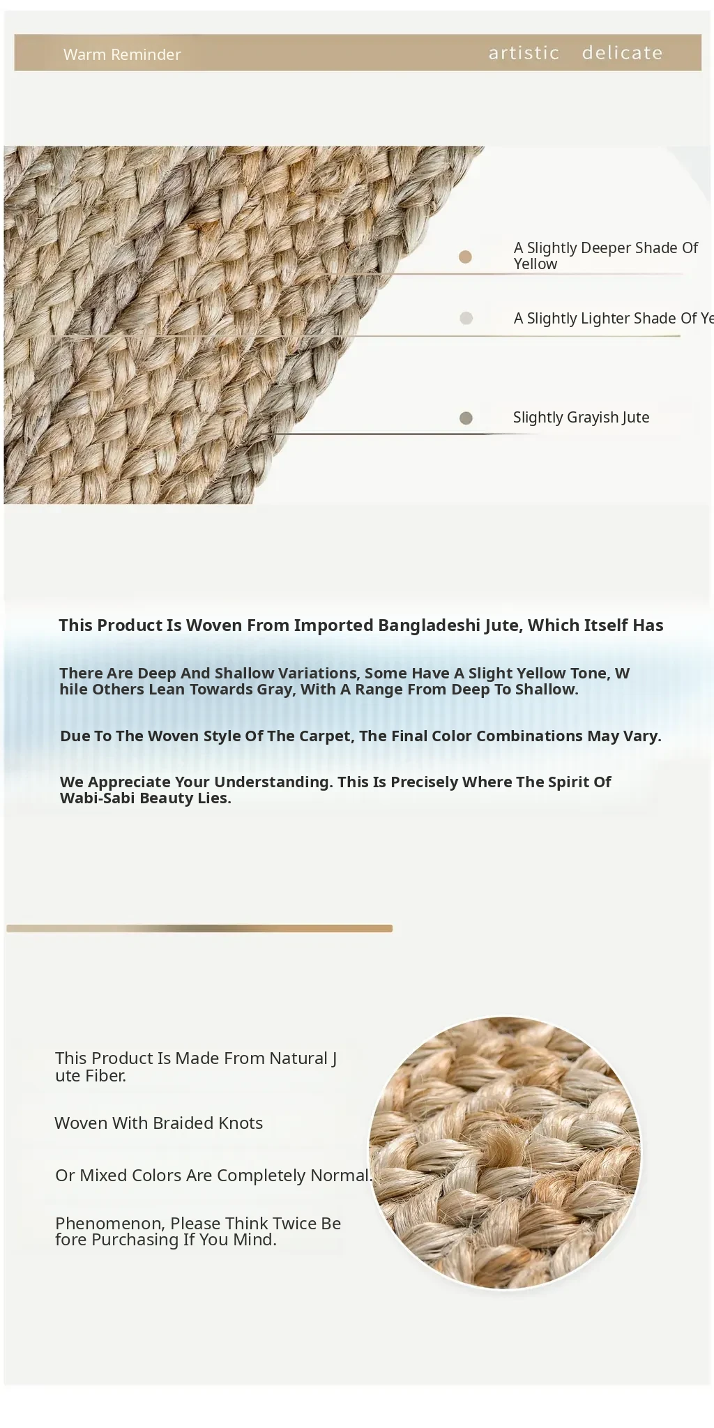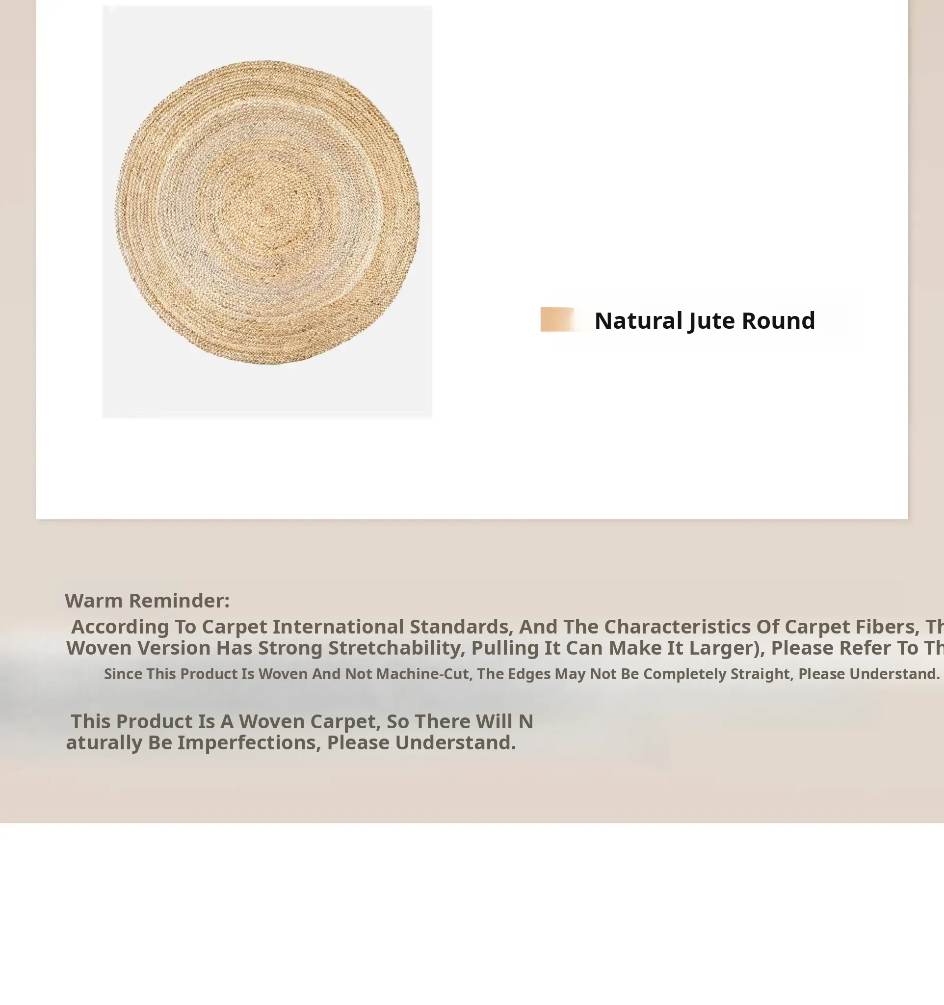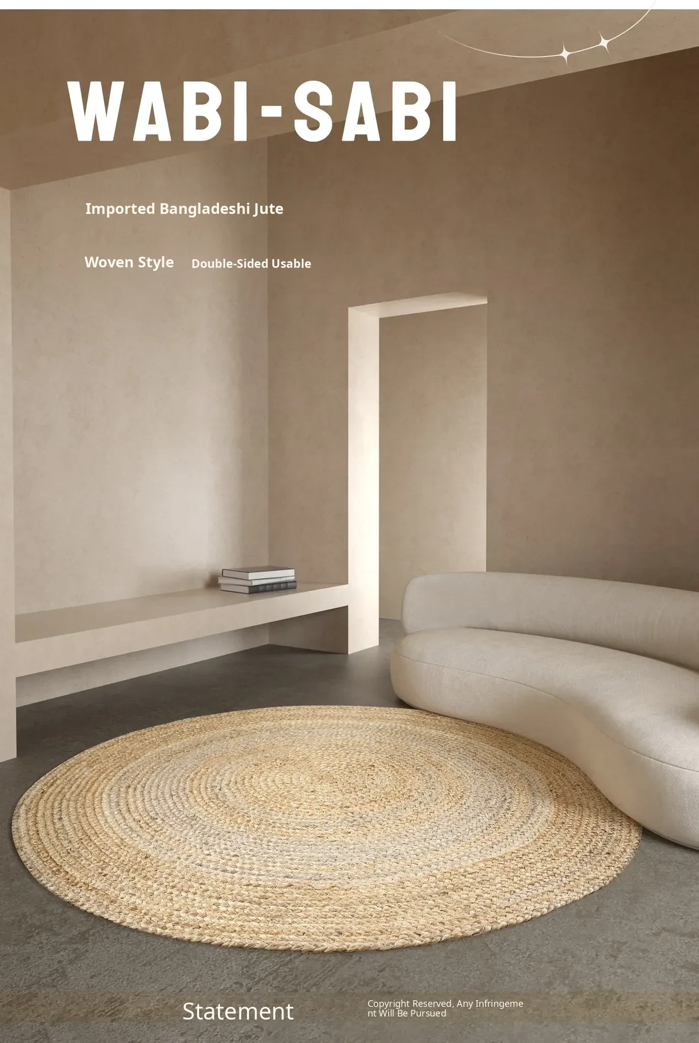 KENZAKI Natural Handmade Wabi-Sabi Style Round Double-Sided Jute Carpet - Glue-Free, Perfect for Bedroom and Living Room Decor