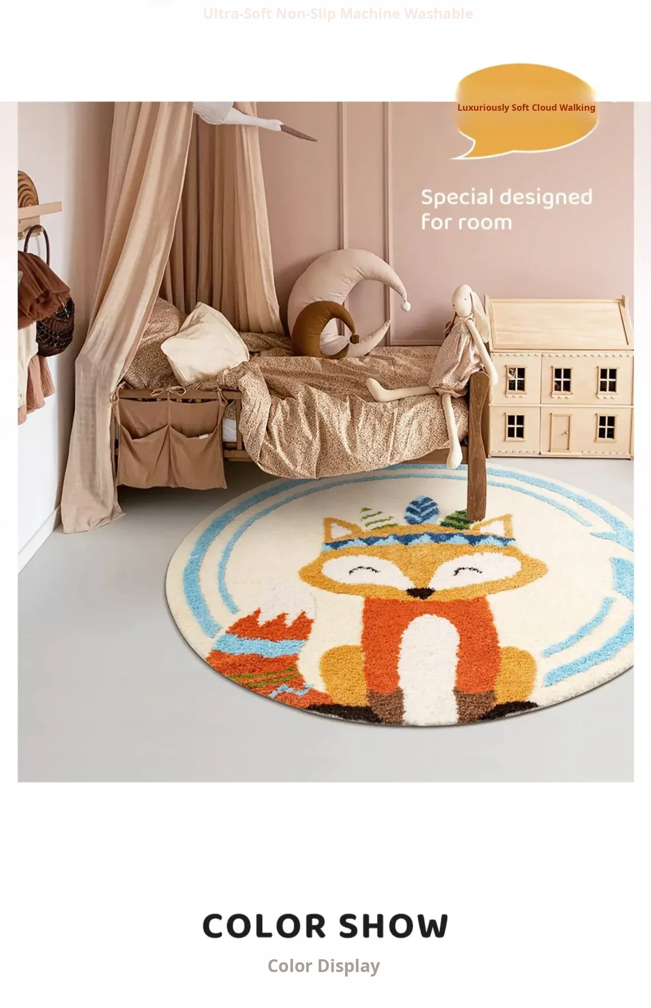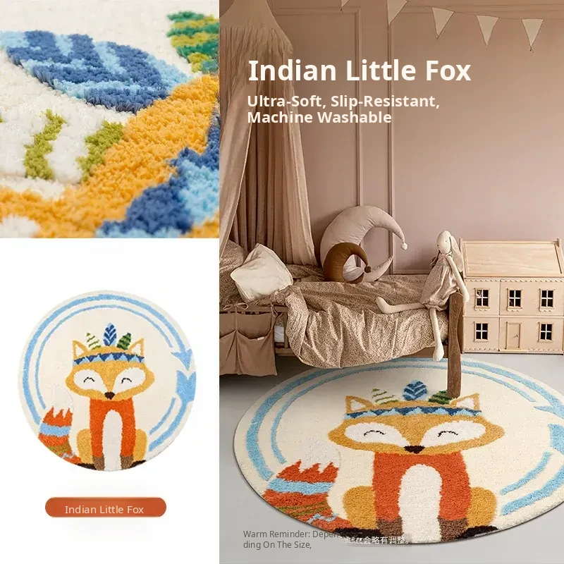 Kids Round Carpet for Bedroom - Soft Anti-Fall Area Rug for Boys and Girls, Perfect for Reading Nook, Adorable Dopamine Fox Design, Machine Washable