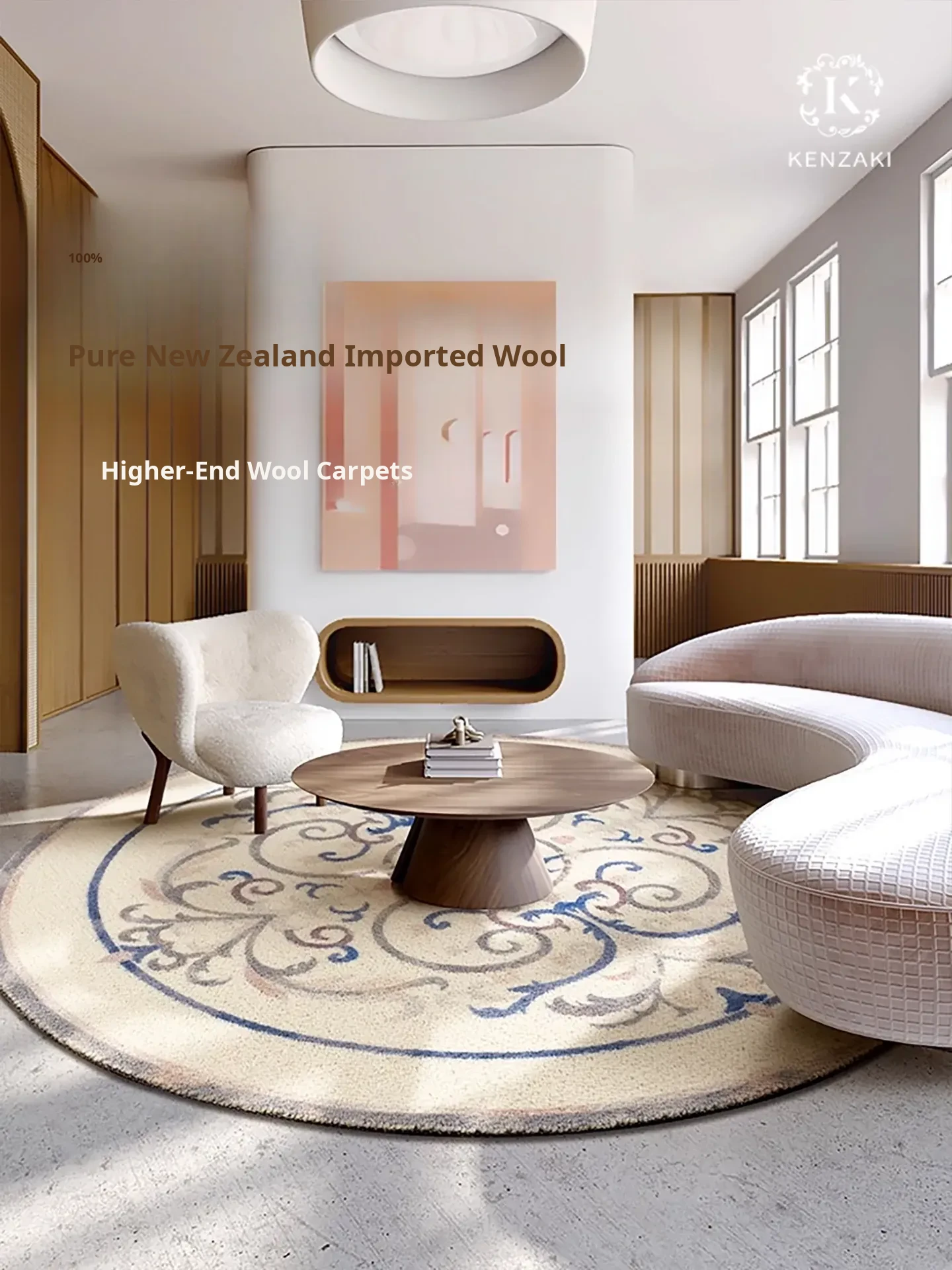 100% Pure New Zealand Wool Round Carpet - Vintage French Style for Living Room & Bedroom, Perfect for Bedside Use, Embrace Modern Chinese Aesthetics