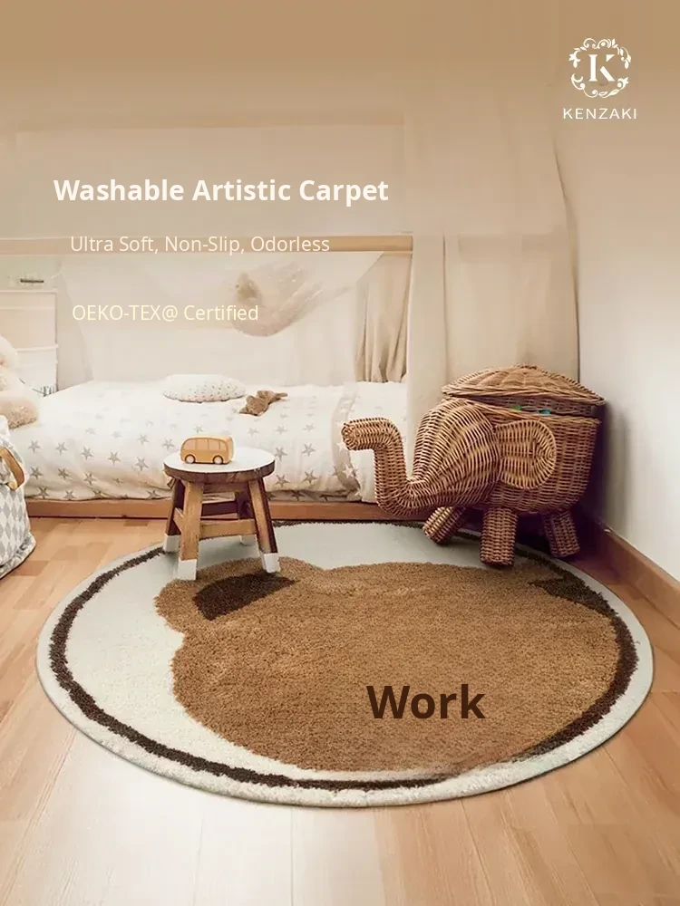 Round Plush Rug for Kids' Room - Adorable Bear Design, Perfect for Boys and Girls, Cozy Bedroom Bedside Mat, Machine Washable, Ideal for Computer Chair.