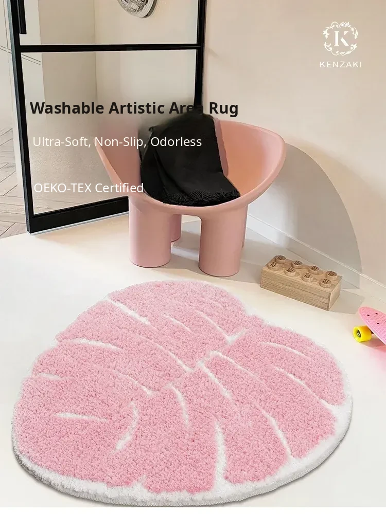 Pink Leaf Shaped Non-Slip Area Rug for Bedroom and Bathroom - Thick, Washable, Perfect for Kids' Reading Nook and Bedside Use