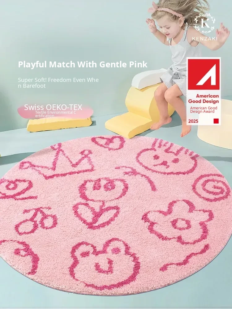 Pink Cute Princess-Style Round Area Rug for Girls' Bedroom - Non-Slip, Machine Washable Carpet Perfect for Kids' Playroom and Bedside Decor