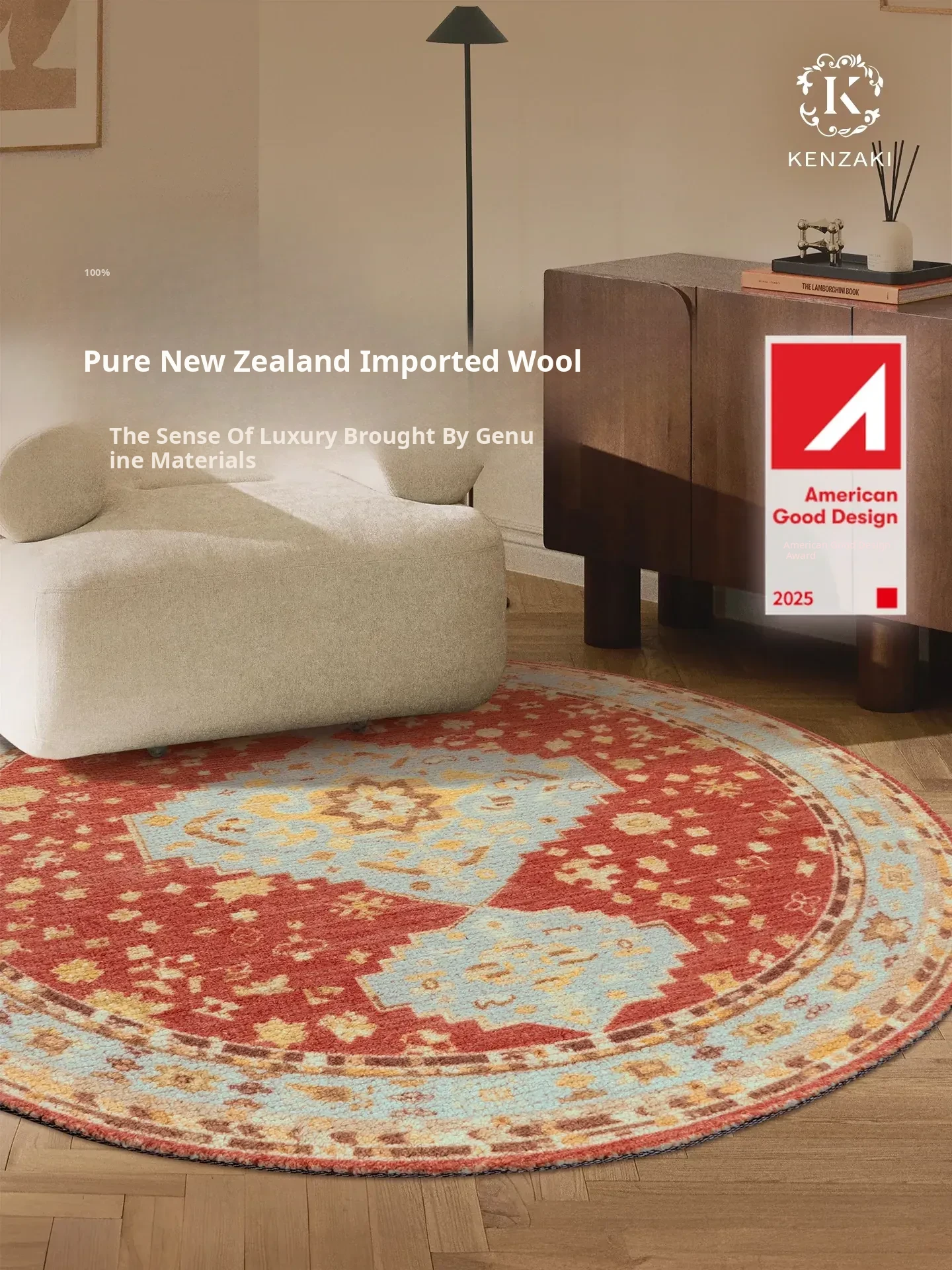100% Pure New Zealand Wool Round Rug - Luxurious French Style Vintage Red Carpet for Living Room and Bedroom, Perfect for Cozy Décor