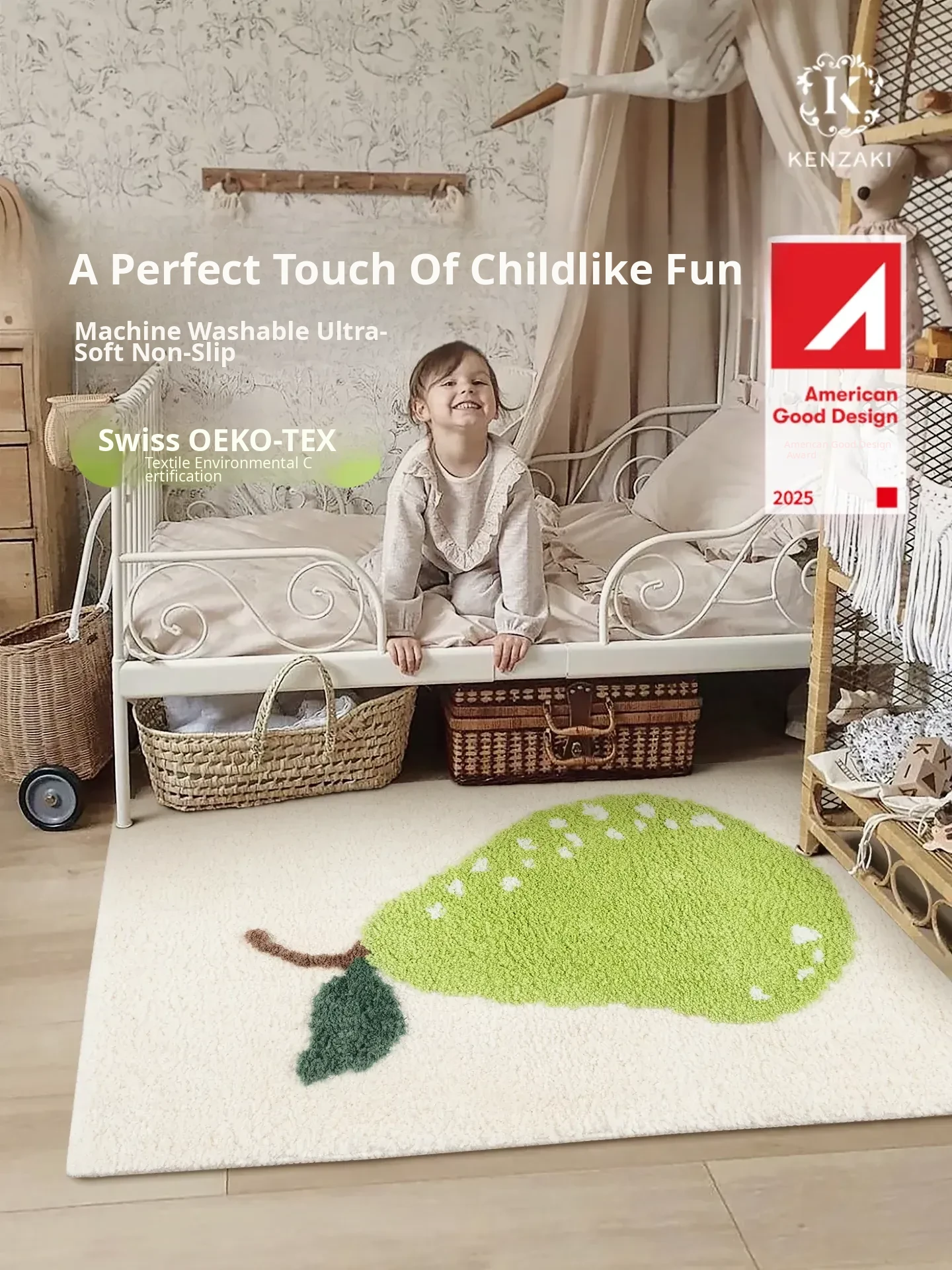 Cute Washable Green Pear Area Rug for Kids' Bedroom - Non-Slip INS Style Bedside Mat for Boys and Girls, Perfect for Playtime and Cozy Spaces