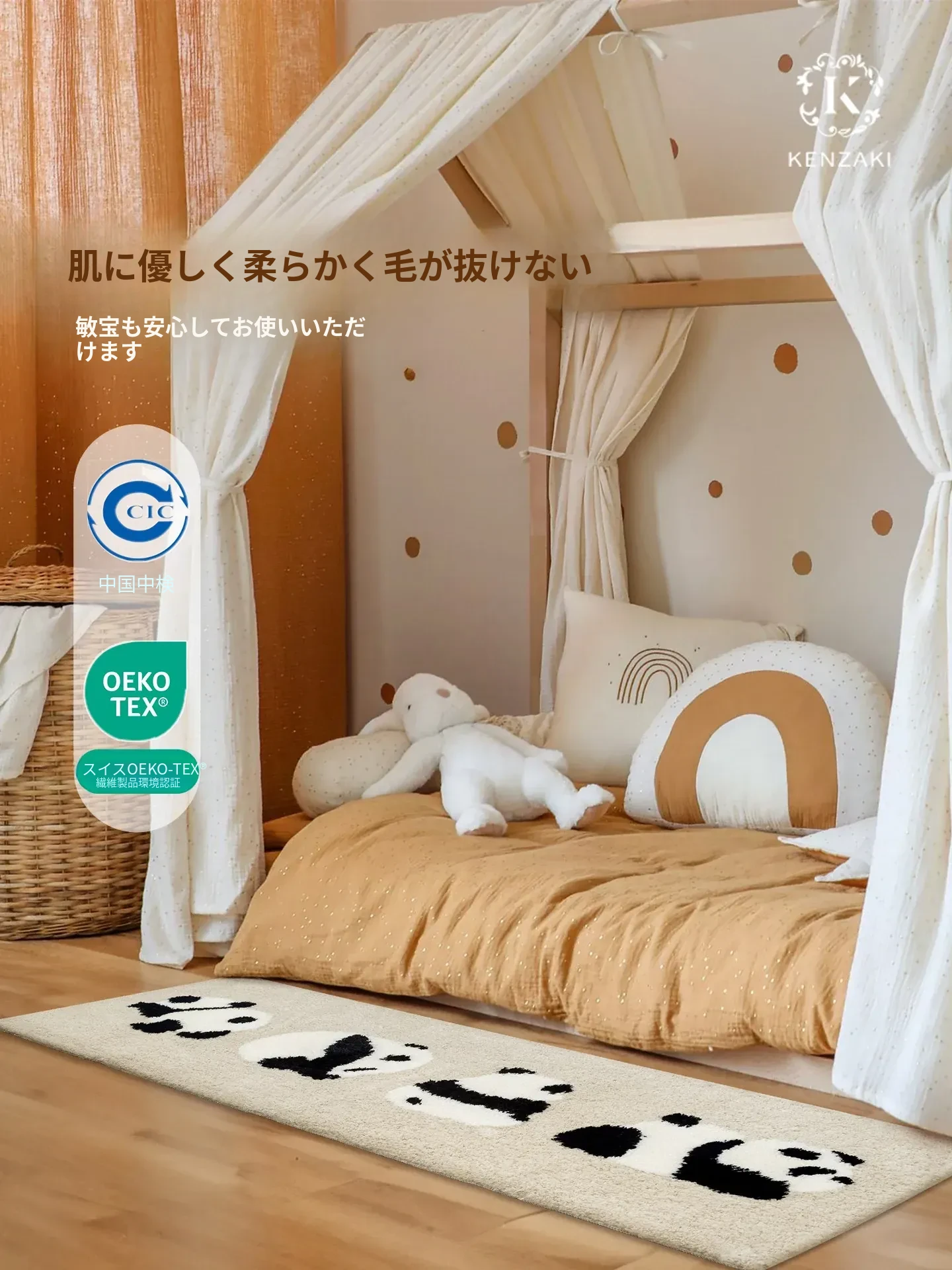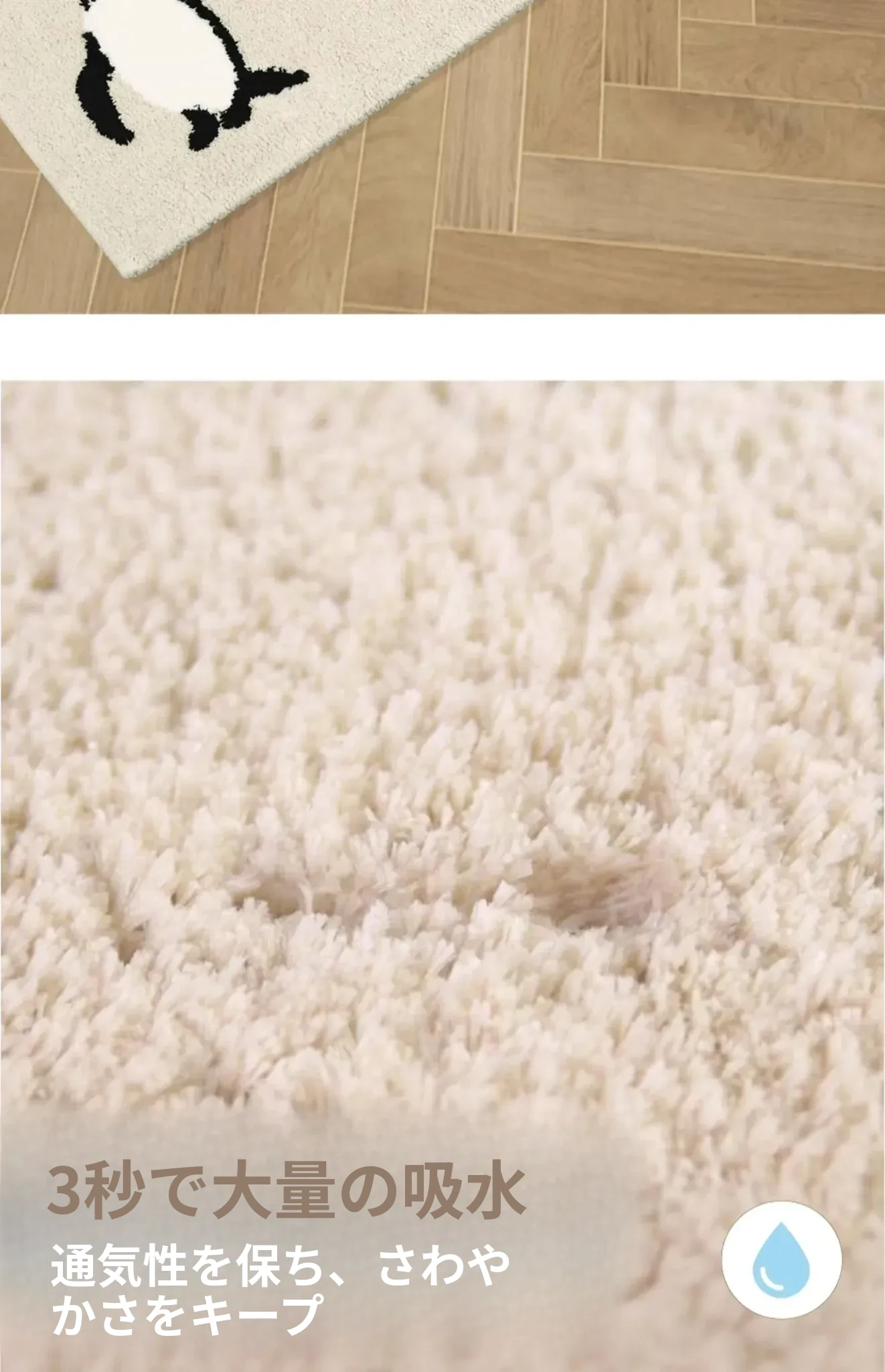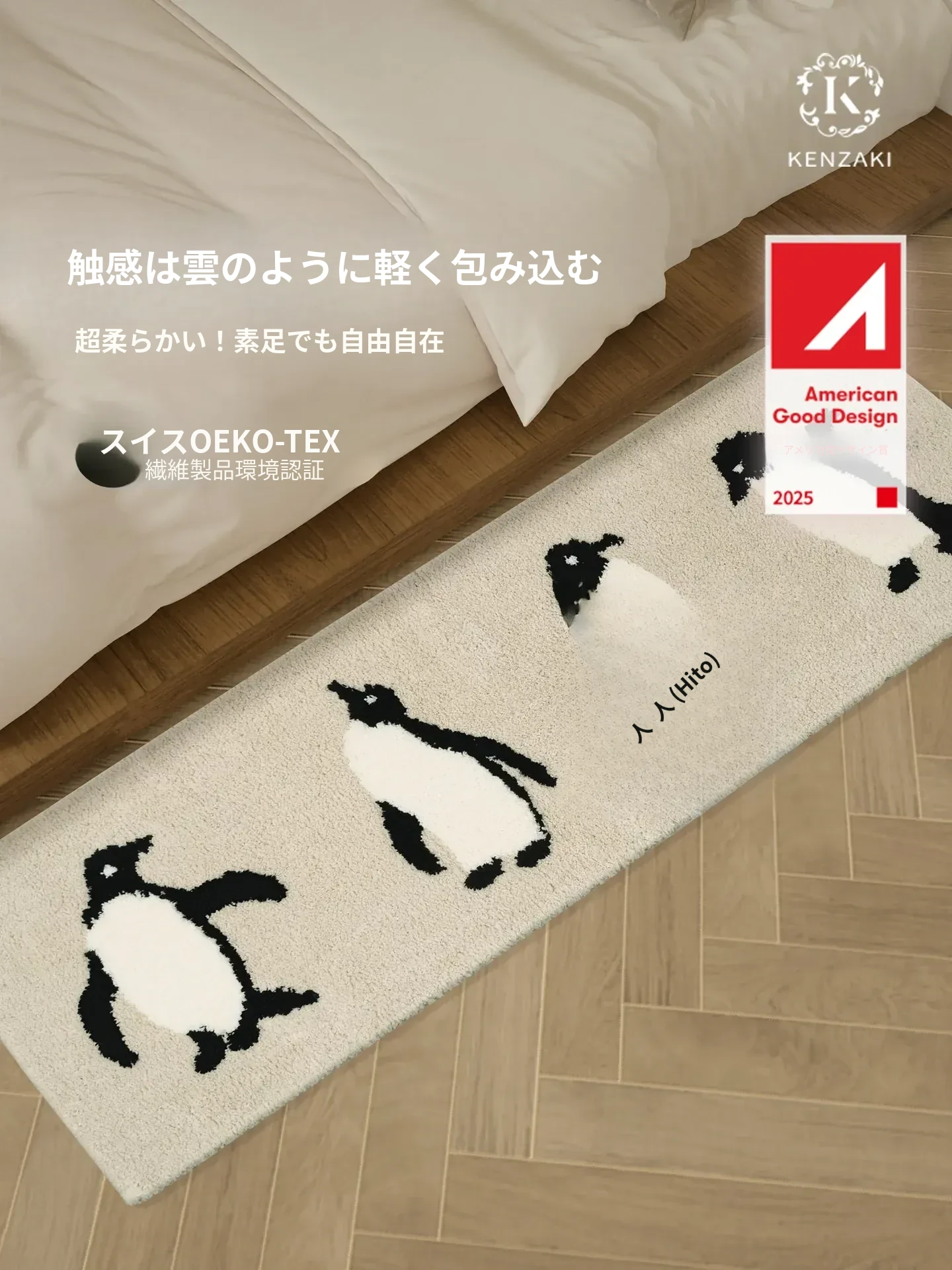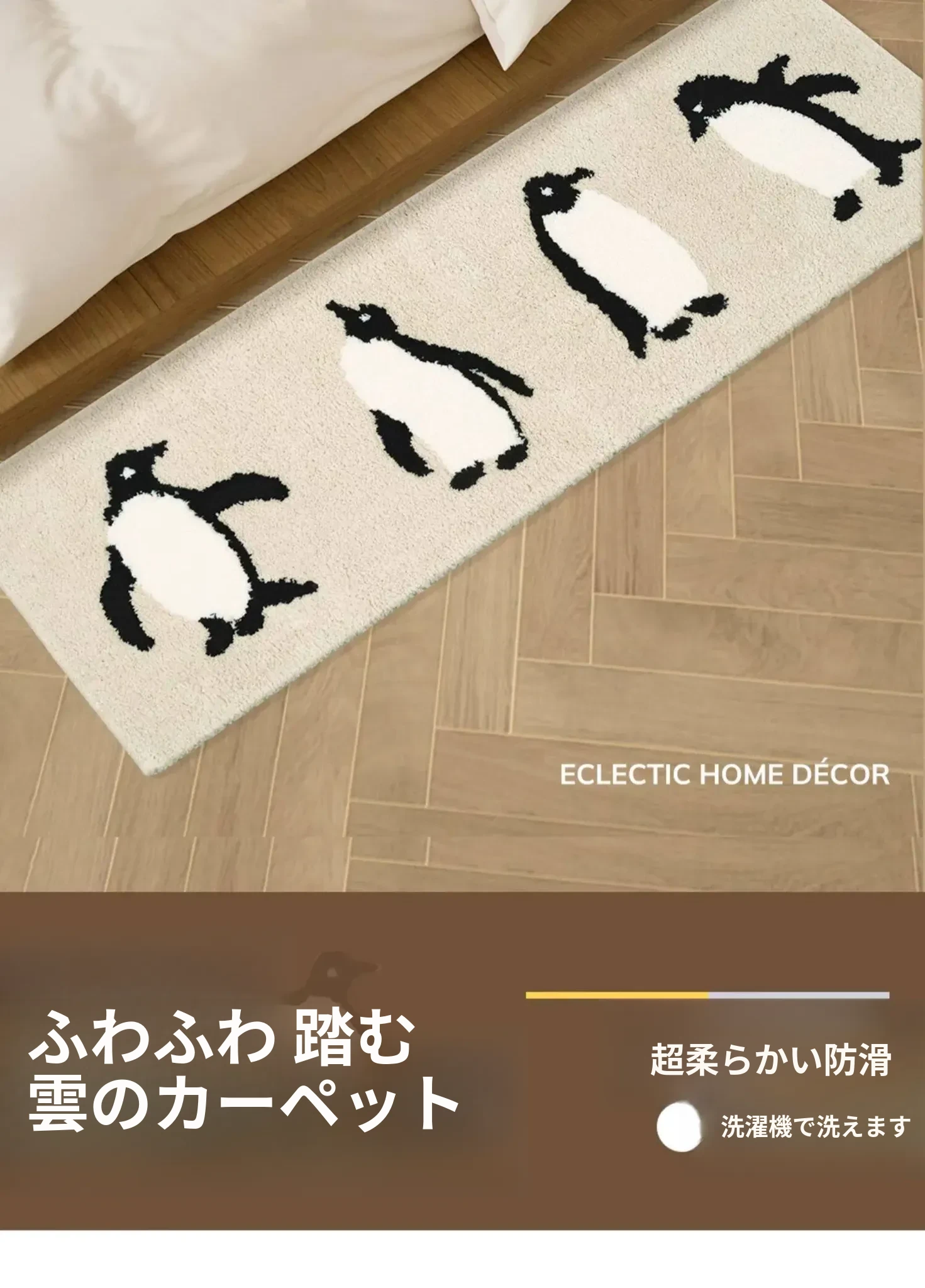 かわいいペンギンデザインの子供用カーペット!インテリアにぴったりのベージュ色で、男の子も女の子も大喜び!滑り止め加工で安全、洗濯機で洗えるからお手入れも簡単。子供部屋やベッドサイドに最適なアイテムです!