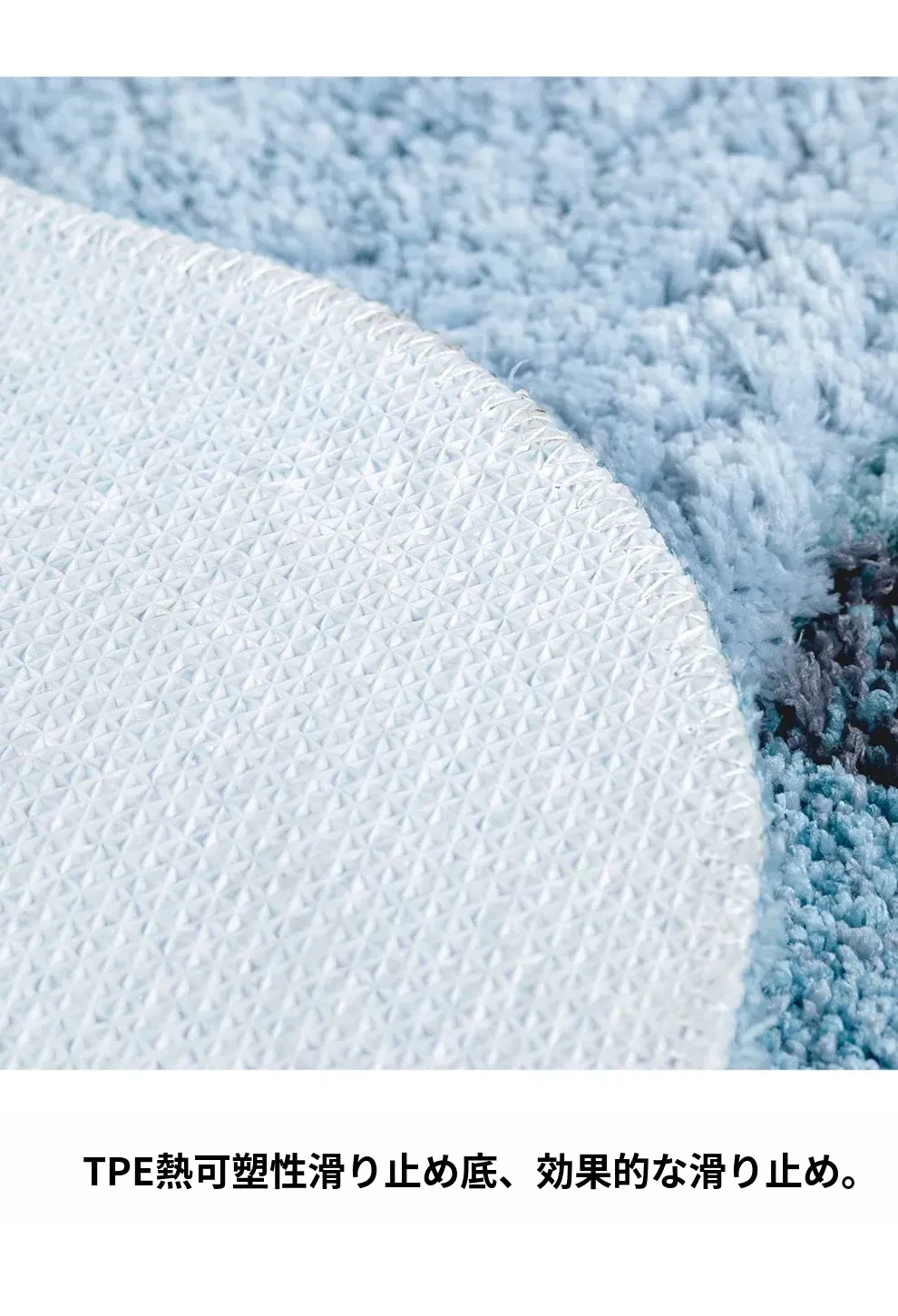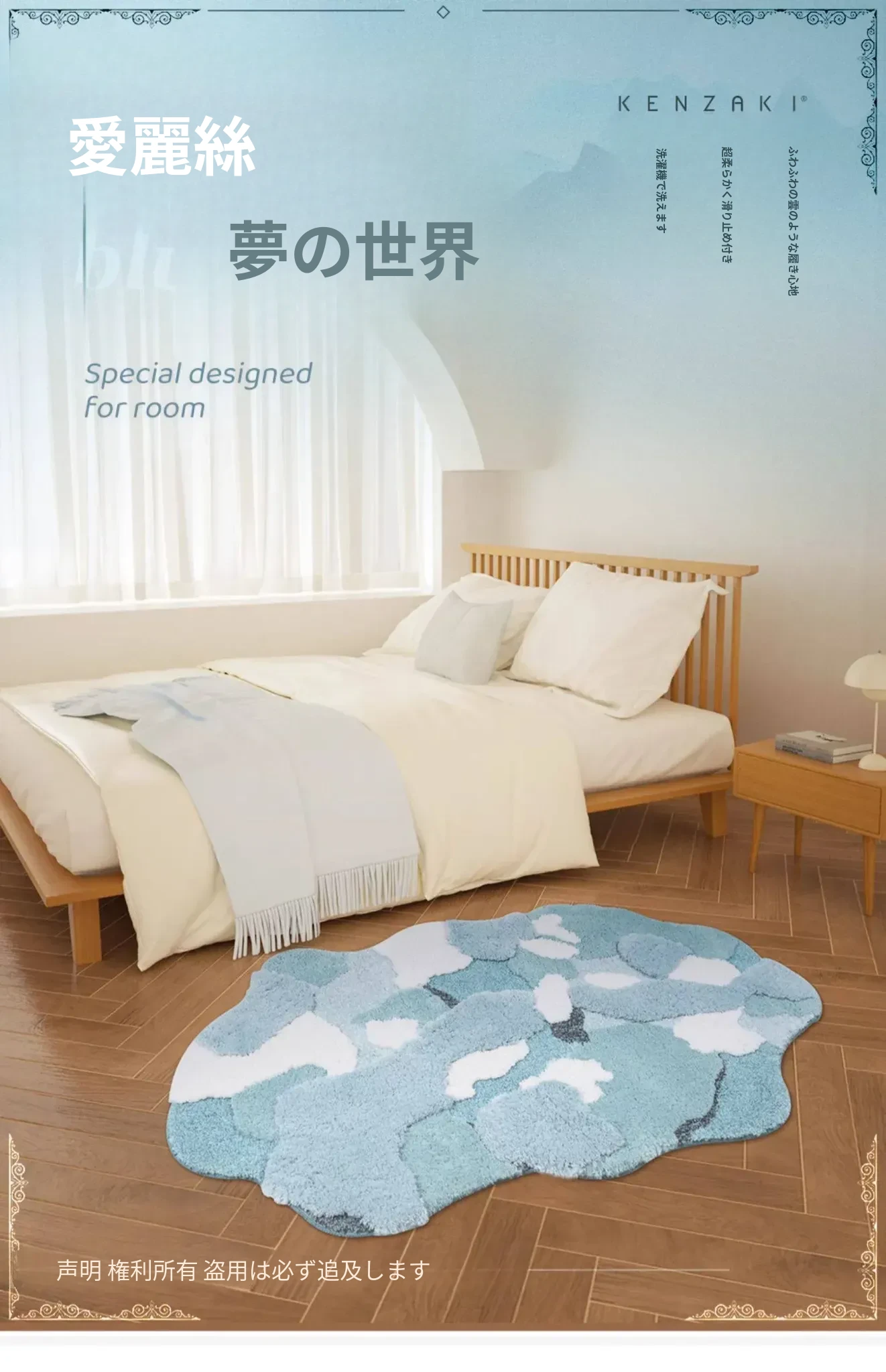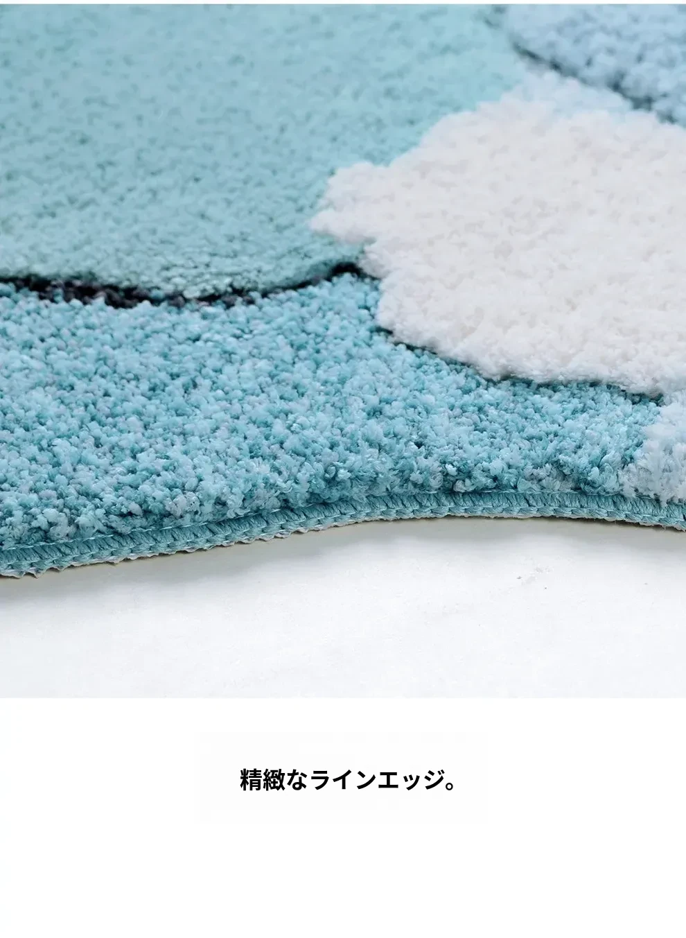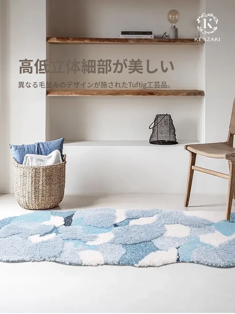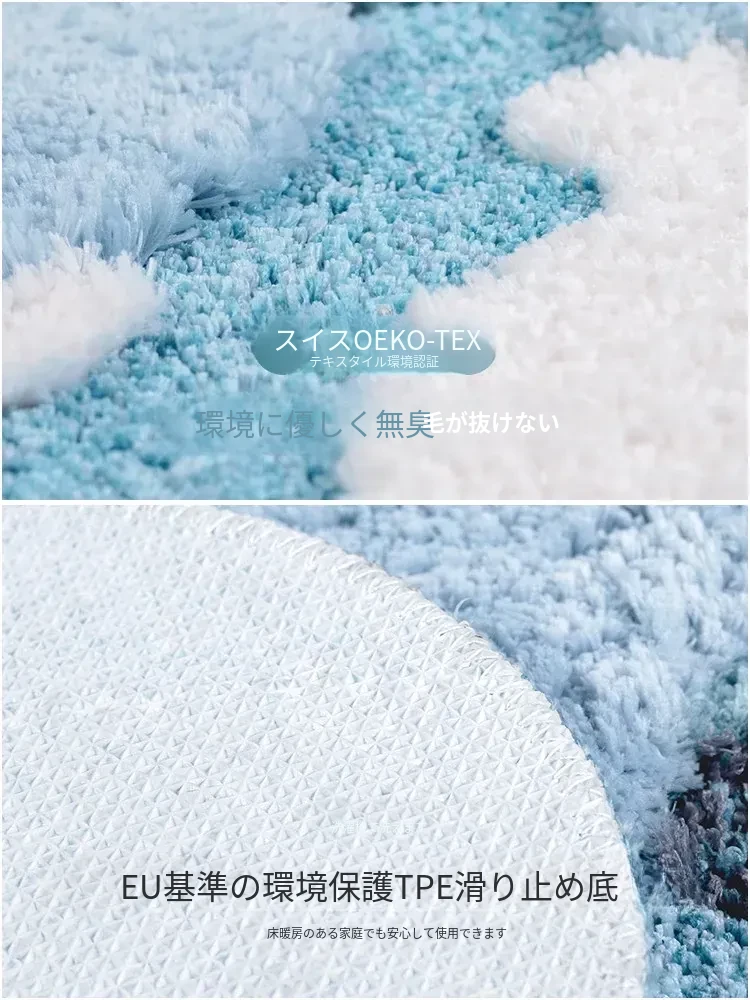 防滑・洗えるブルーのモスフレンチデザイン!厚手カーペット - ベッドサイド、子供部屋、リビングの読書エリアに最適。おしゃれで快適な空間を演出します!