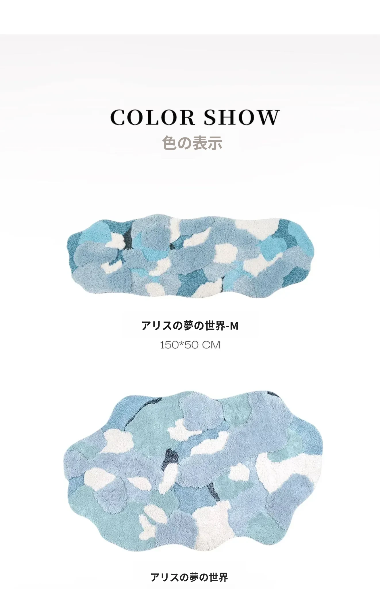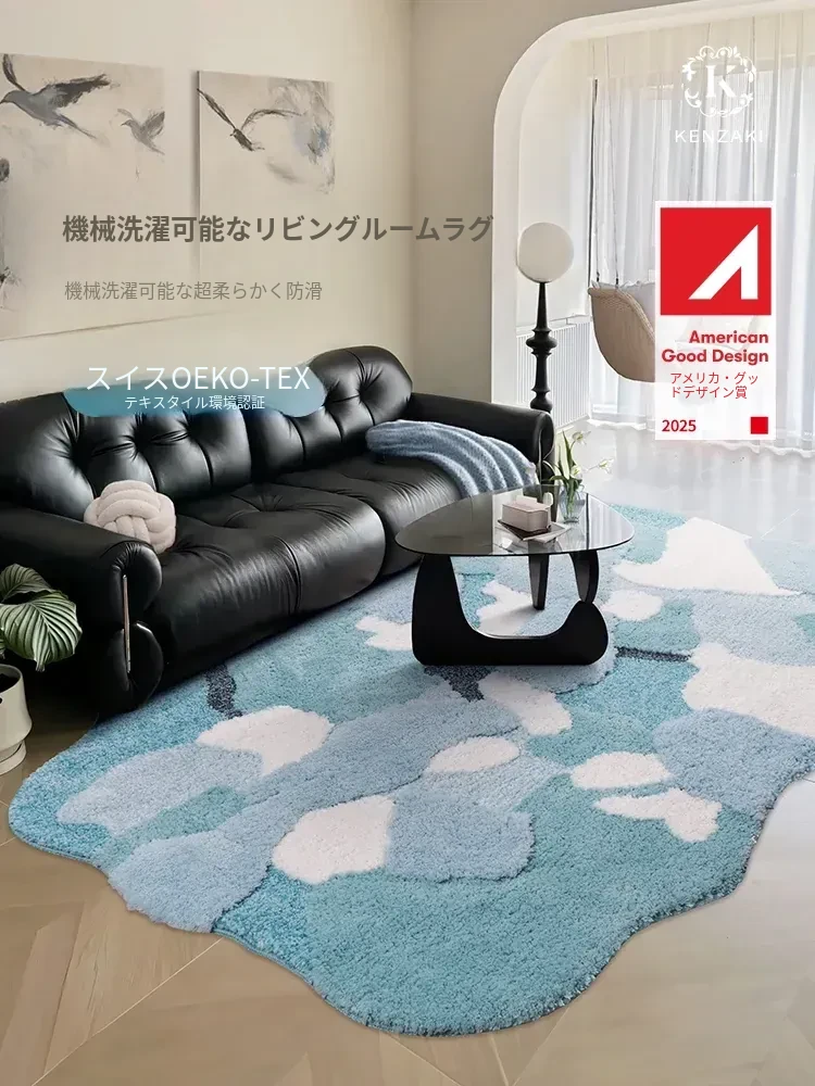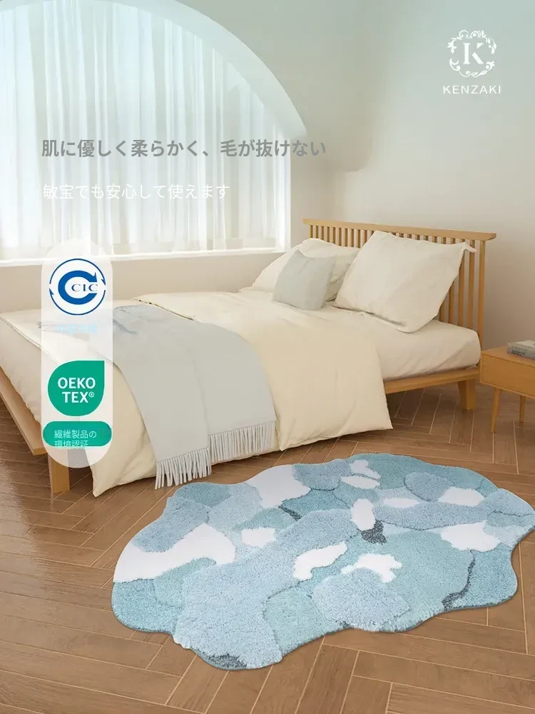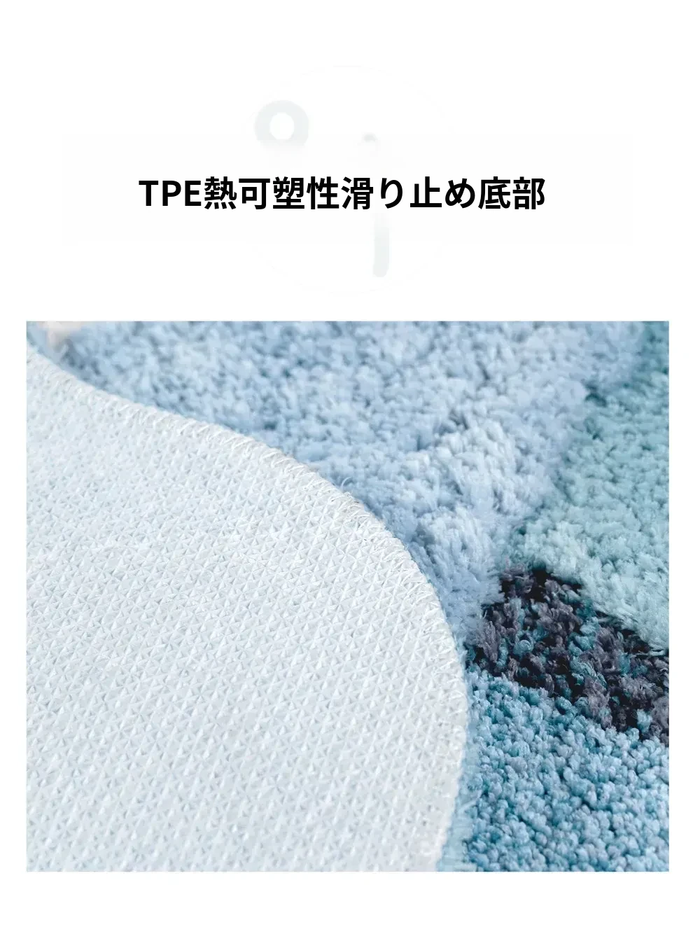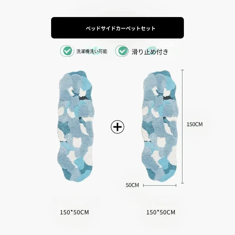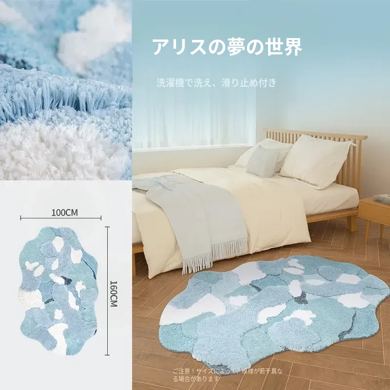 防滑・洗えるブルーのモスフレンチデザイン!厚手カーペット - ベッドサイド、子供部屋、リビングの読書エリアに最適。おしゃれで快適な空間を演出します!