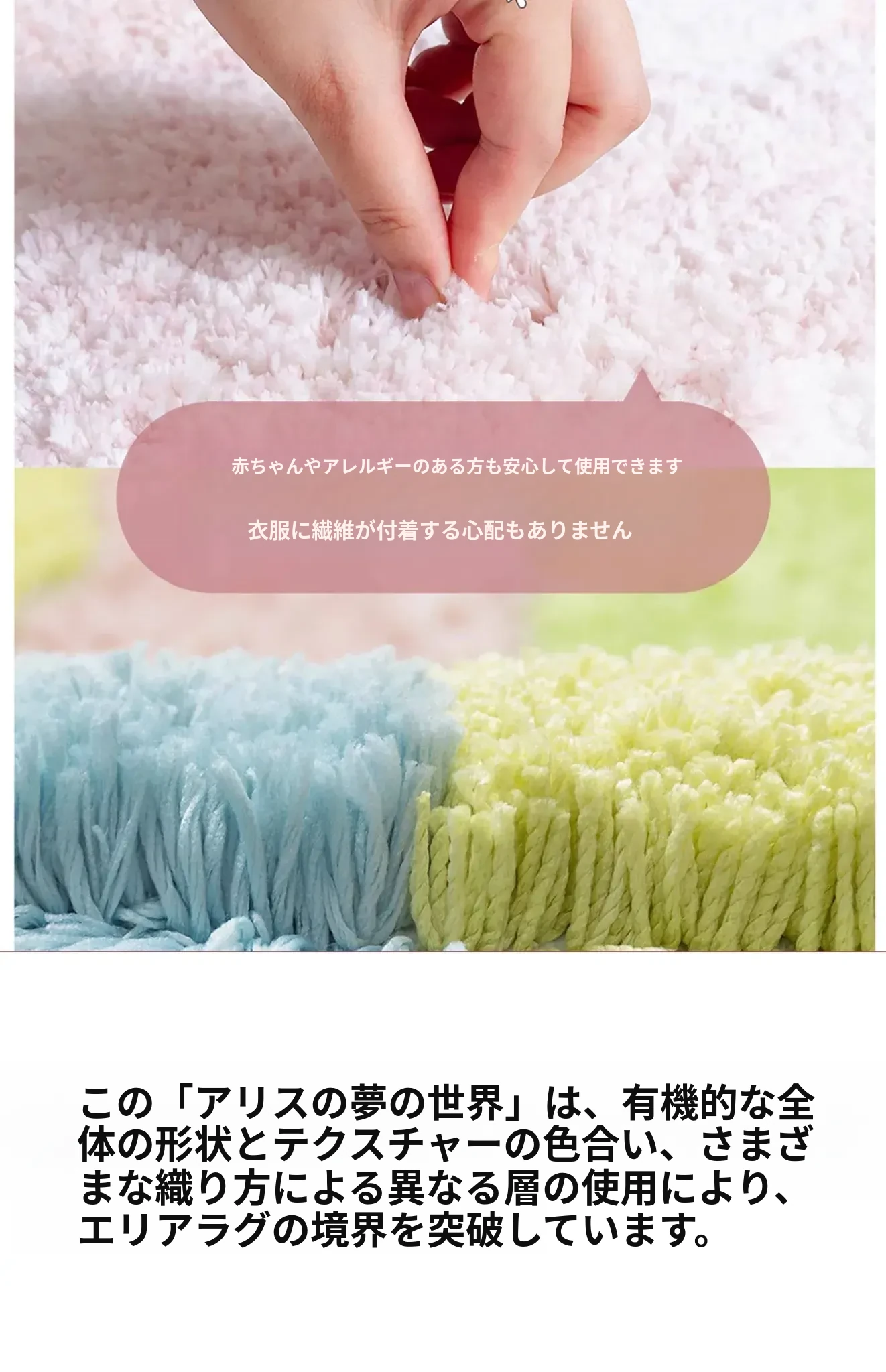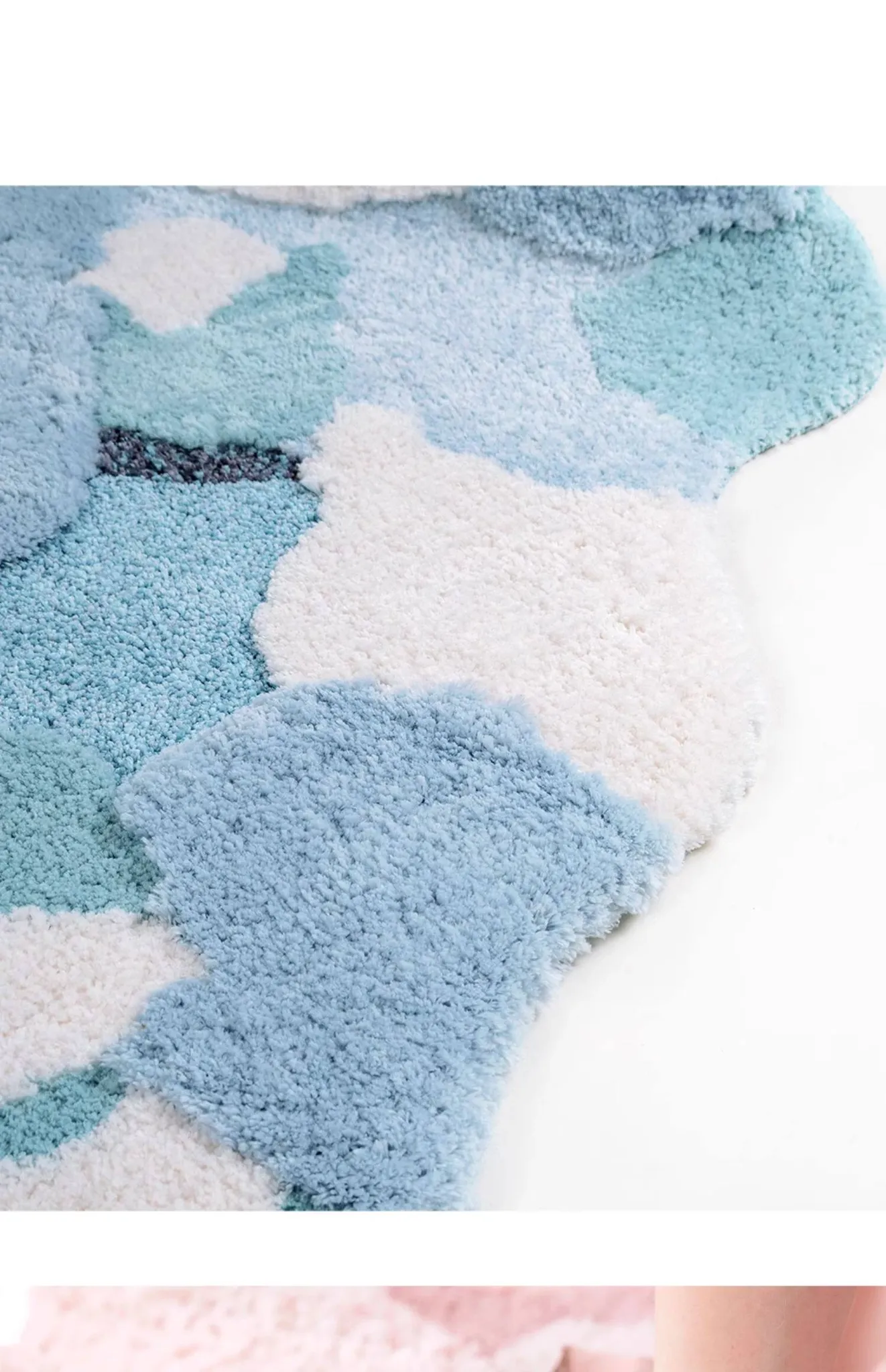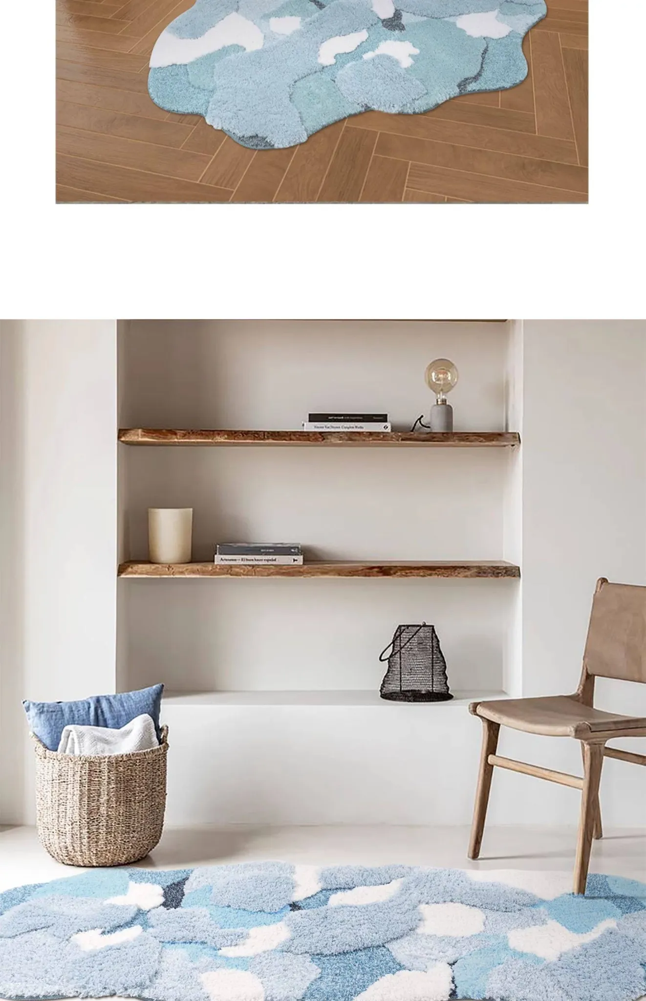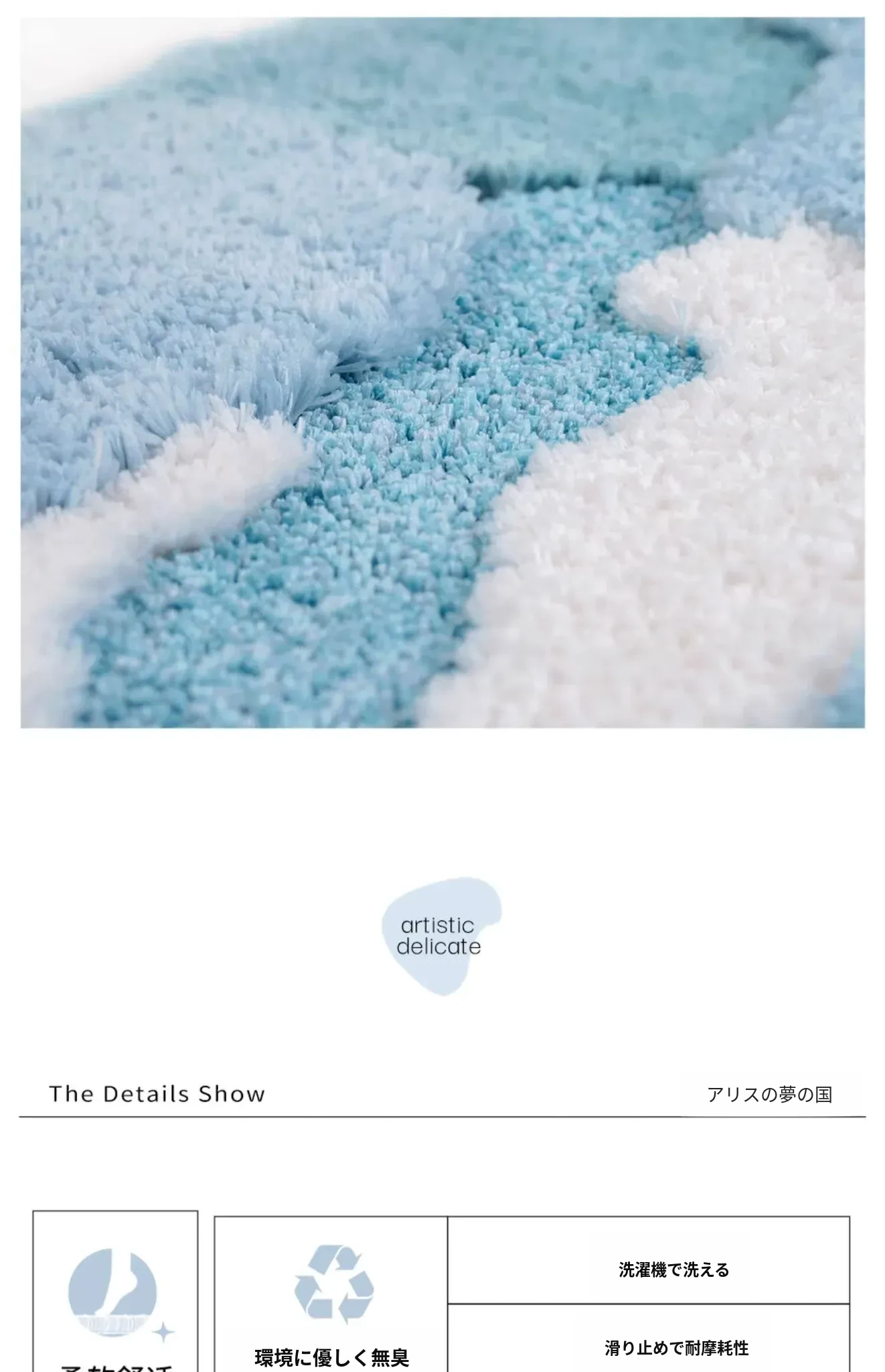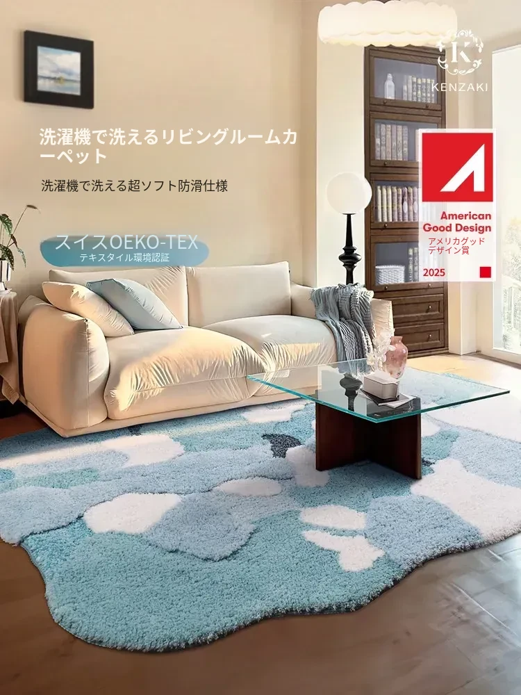防滑・洗えるブルーのモスフレンチデザイン!厚手カーペット - ベッドサイド、子供部屋、リビングの読書エリアに最適。おしゃれで快適な空間を演出します!