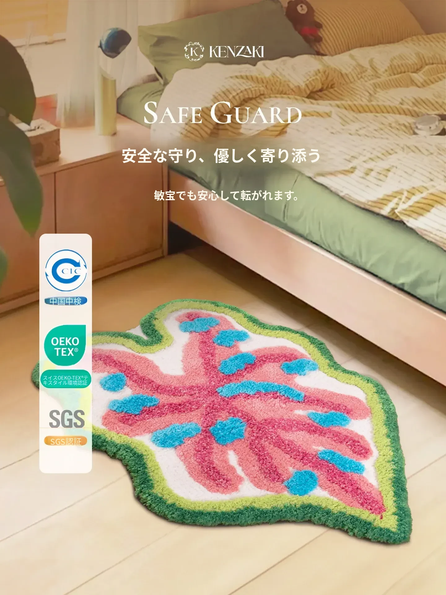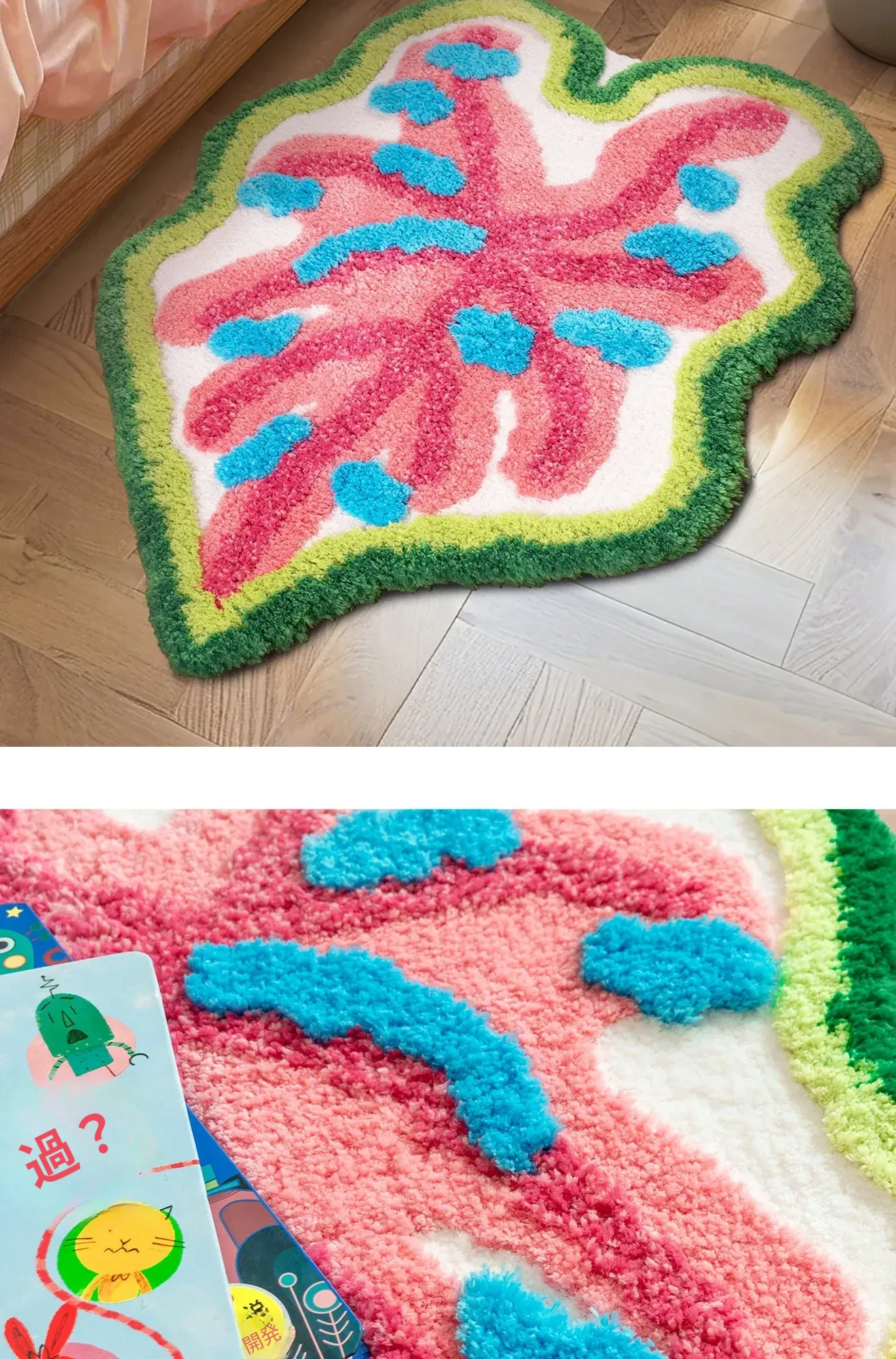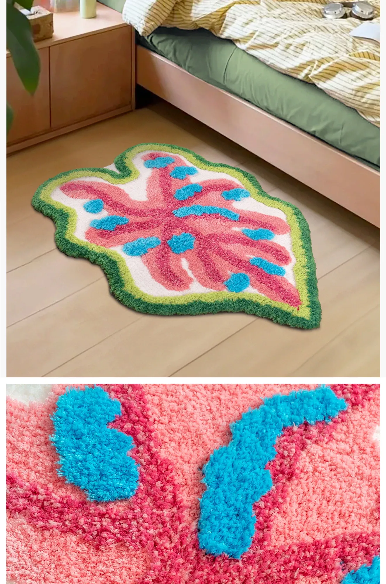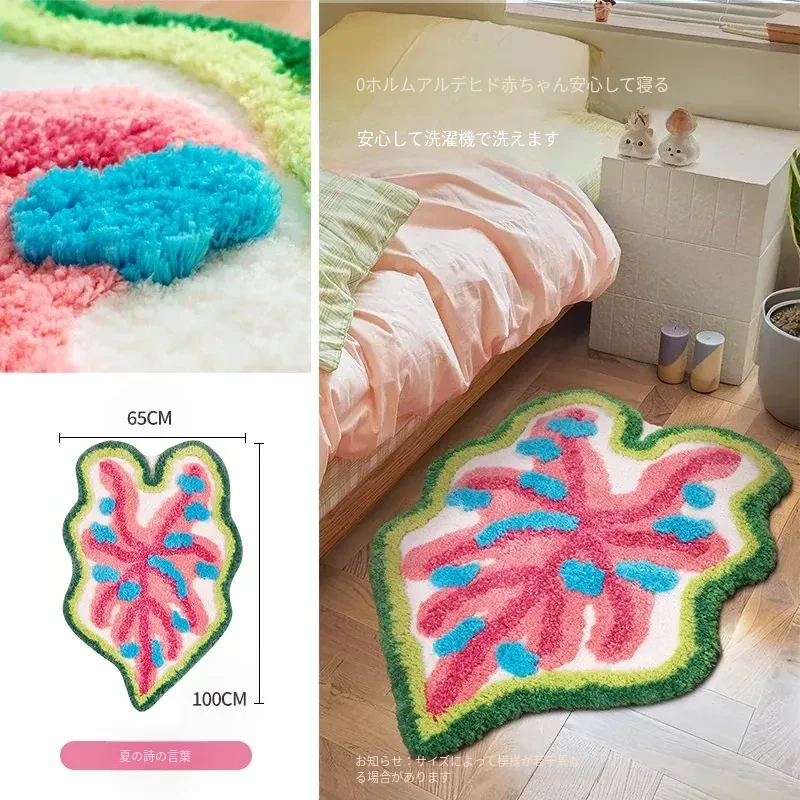 カラフルな葉っぱデザインの子供部屋用ラグマット!男の子・女の子にぴったり、インスタ映えするおしゃれなベッドサイドカーペット。洗濯機で簡単にお手入れ可能で、毎日楽しい空間を演出します!