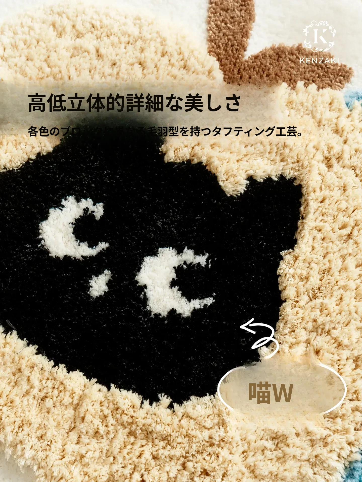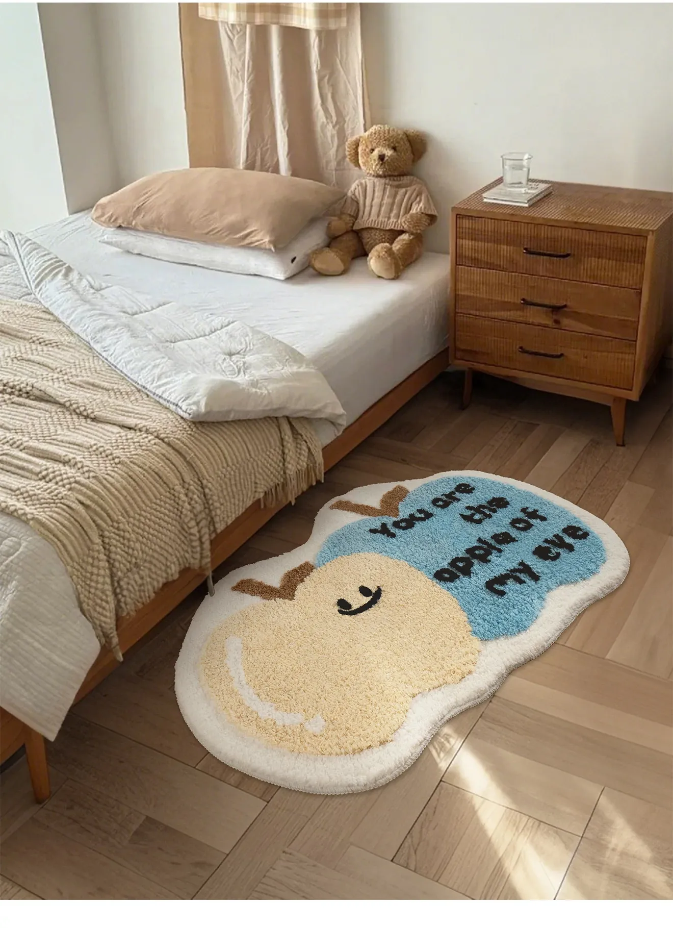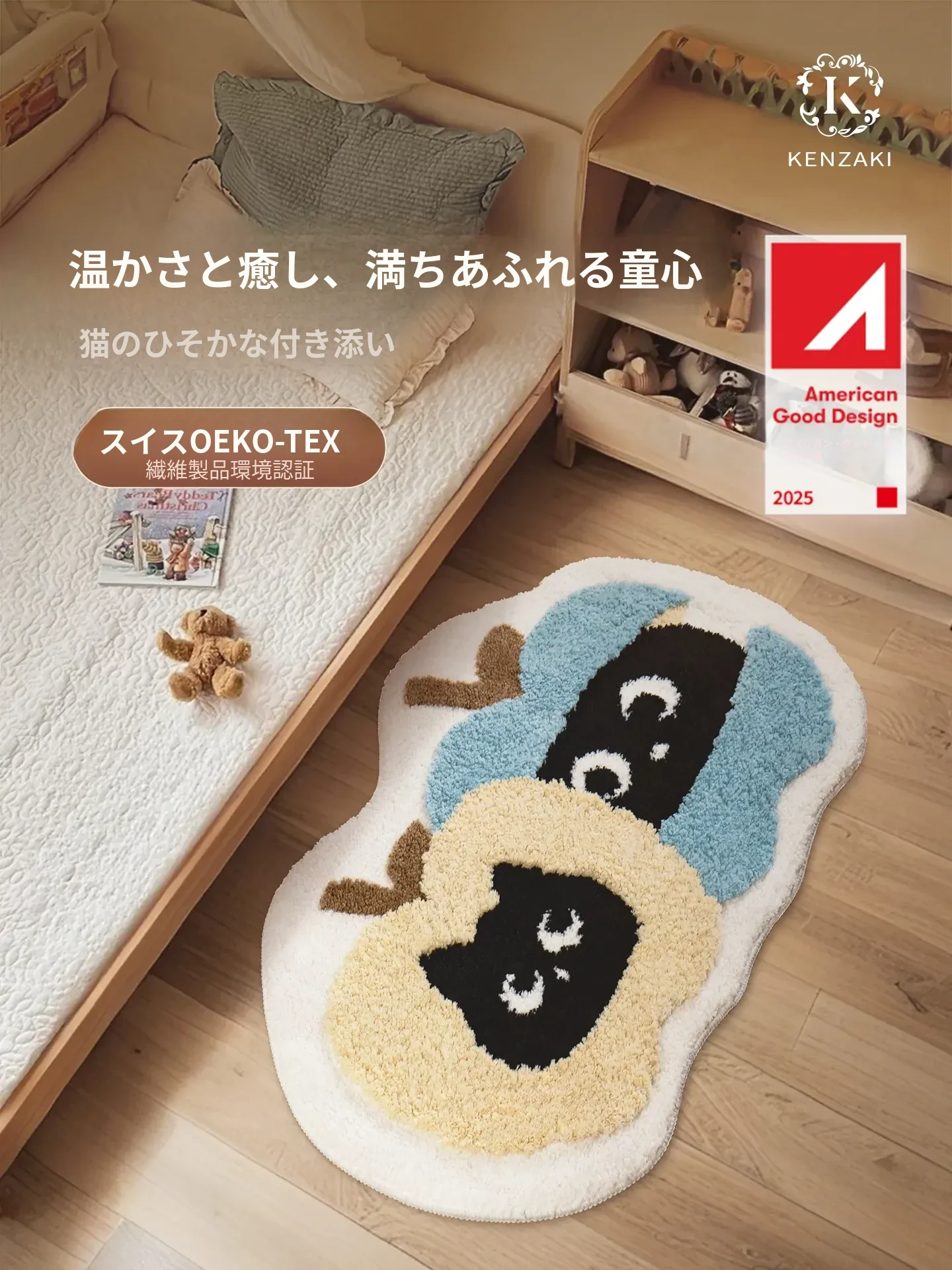 子供部屋にぴったり!おしゃれなインスタ風のベッドサイドマット。男の子も女の子も大好きな可愛いにゃんこデザイン。厚手で安心、しかも洗濯機で洗えるからいつでも清潔!