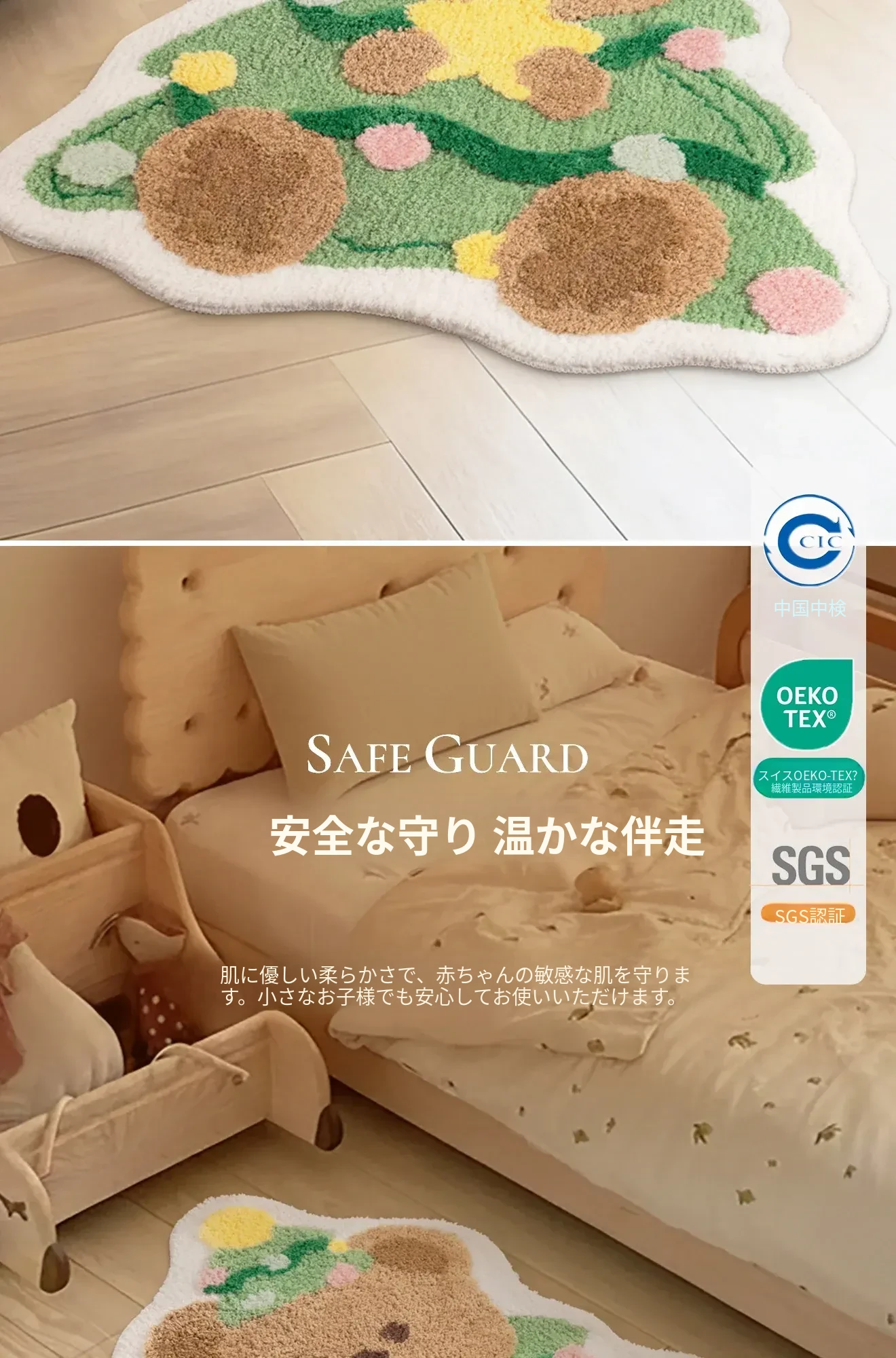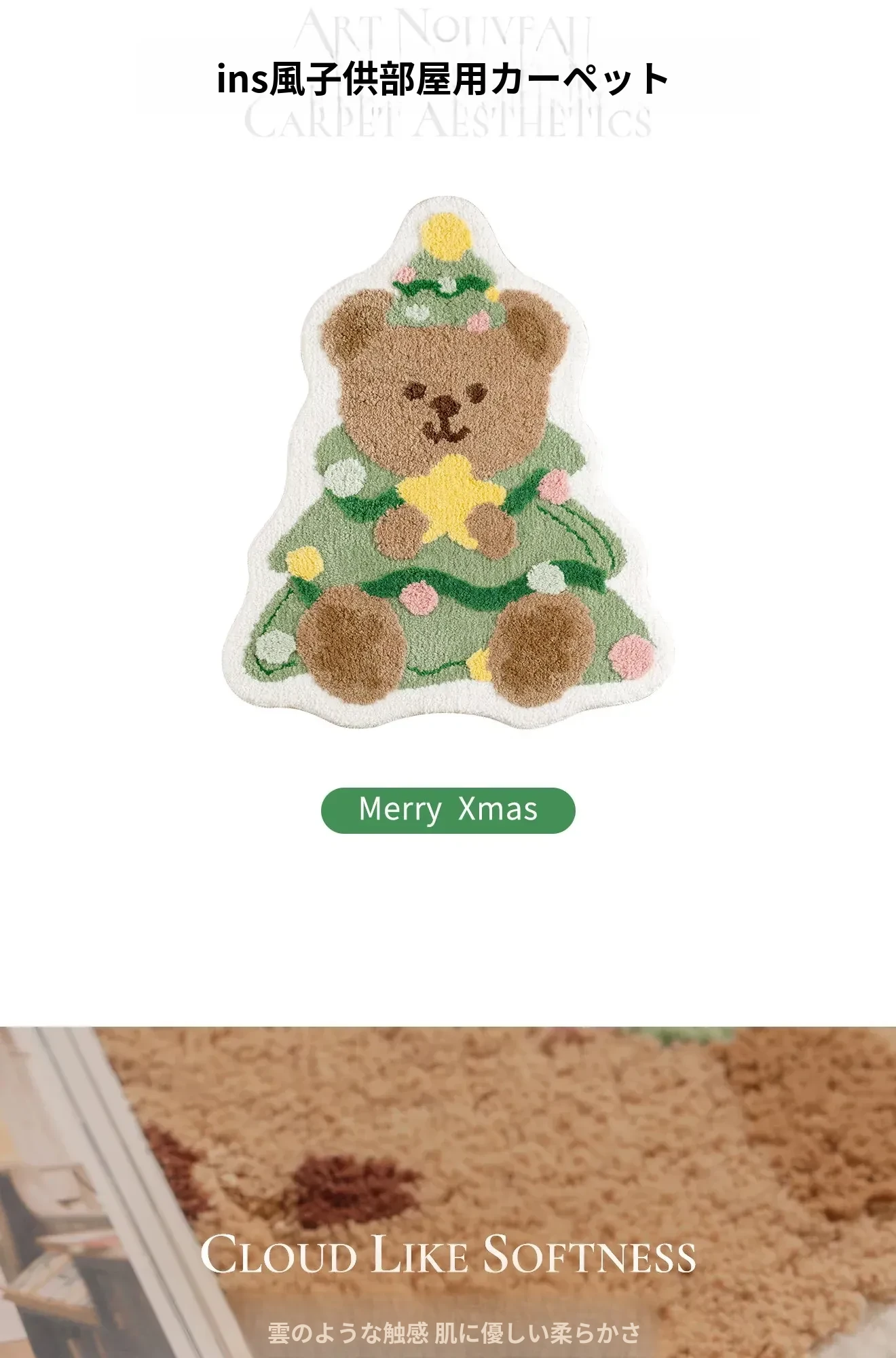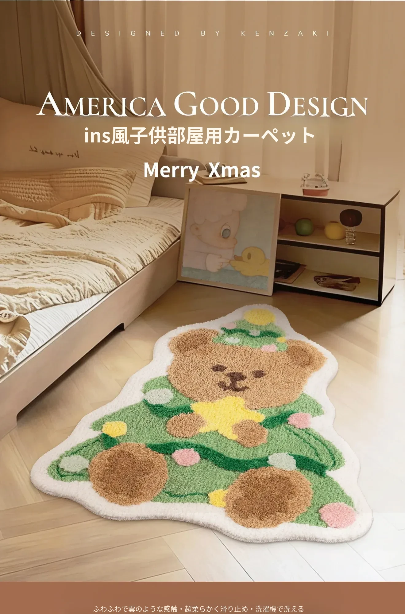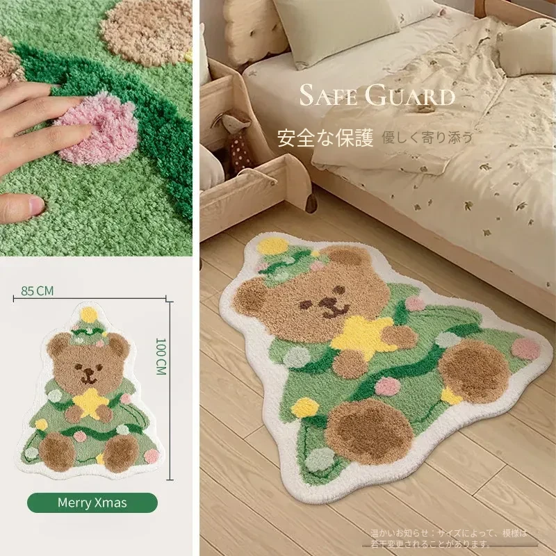 クリスマスのかわいいクマとクリスマスツリーのデザイン!ベッドサイドや子供部屋にぴったりの異形ラグ。洗濯機で簡単に洗えるので、お手入れも楽々!男の子も女の子も喜ぶ、冬の特別なアイテムです。