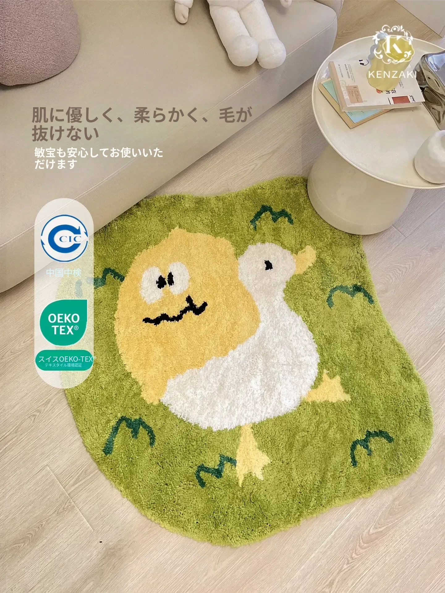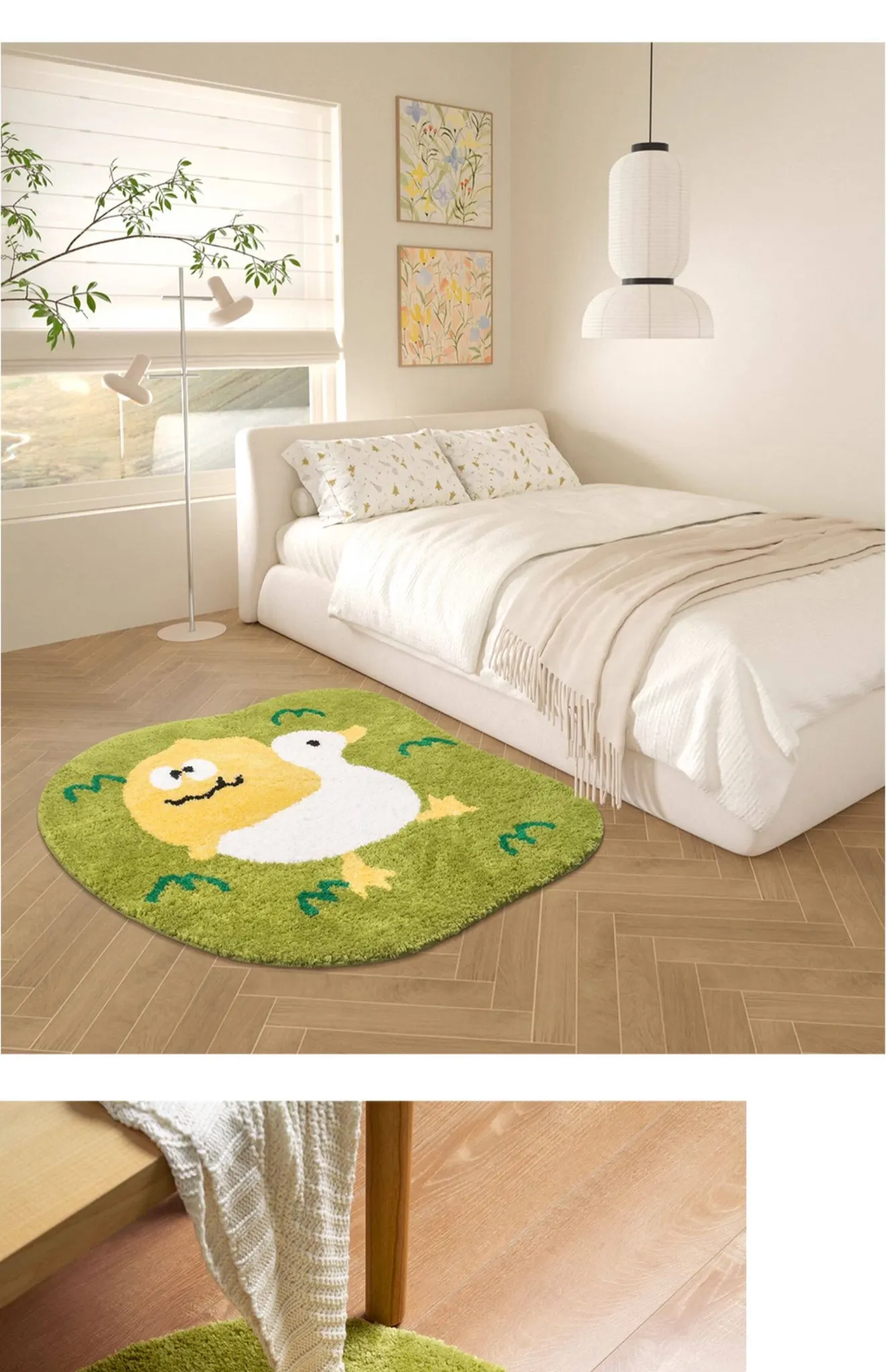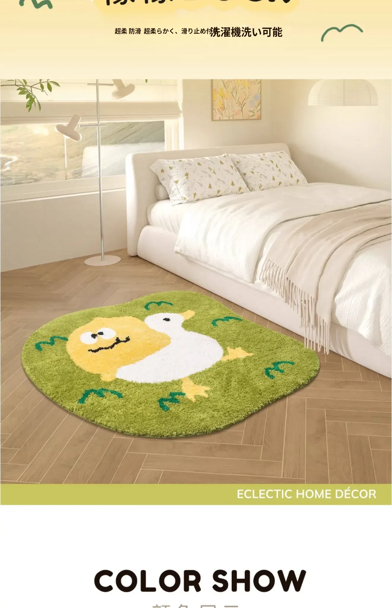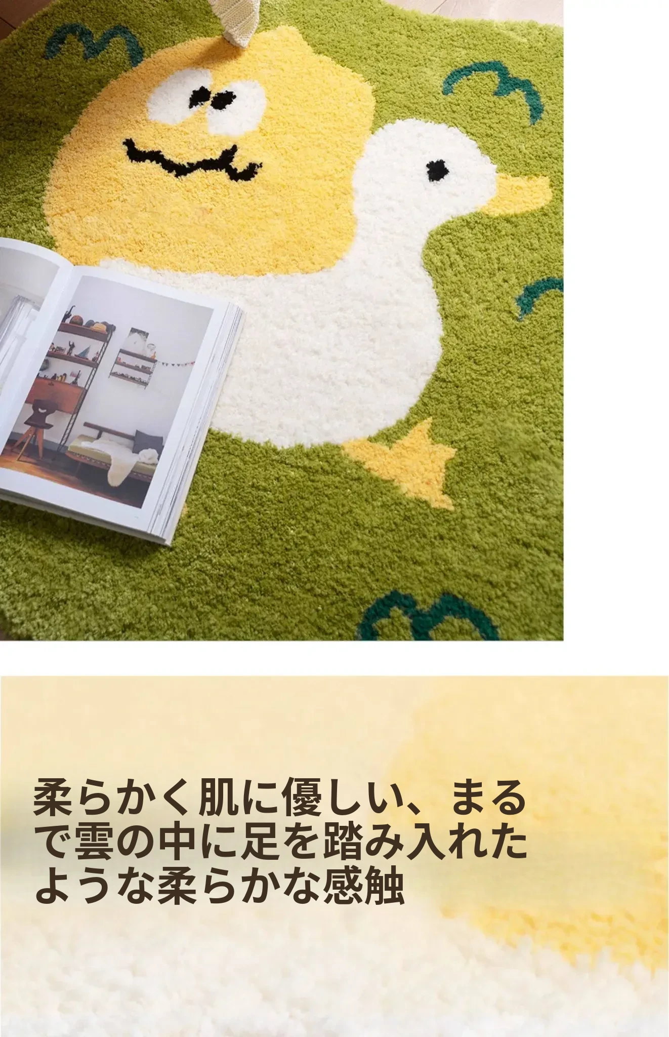 キュートなアヒルデザインの子供部屋用カーペット!男の子も女の子も大喜び♪ おしゃれなグリーンの異形マットは、ベッドサイドにもぴったり。洗濯機で洗えるので、いつでも清潔に保てます!