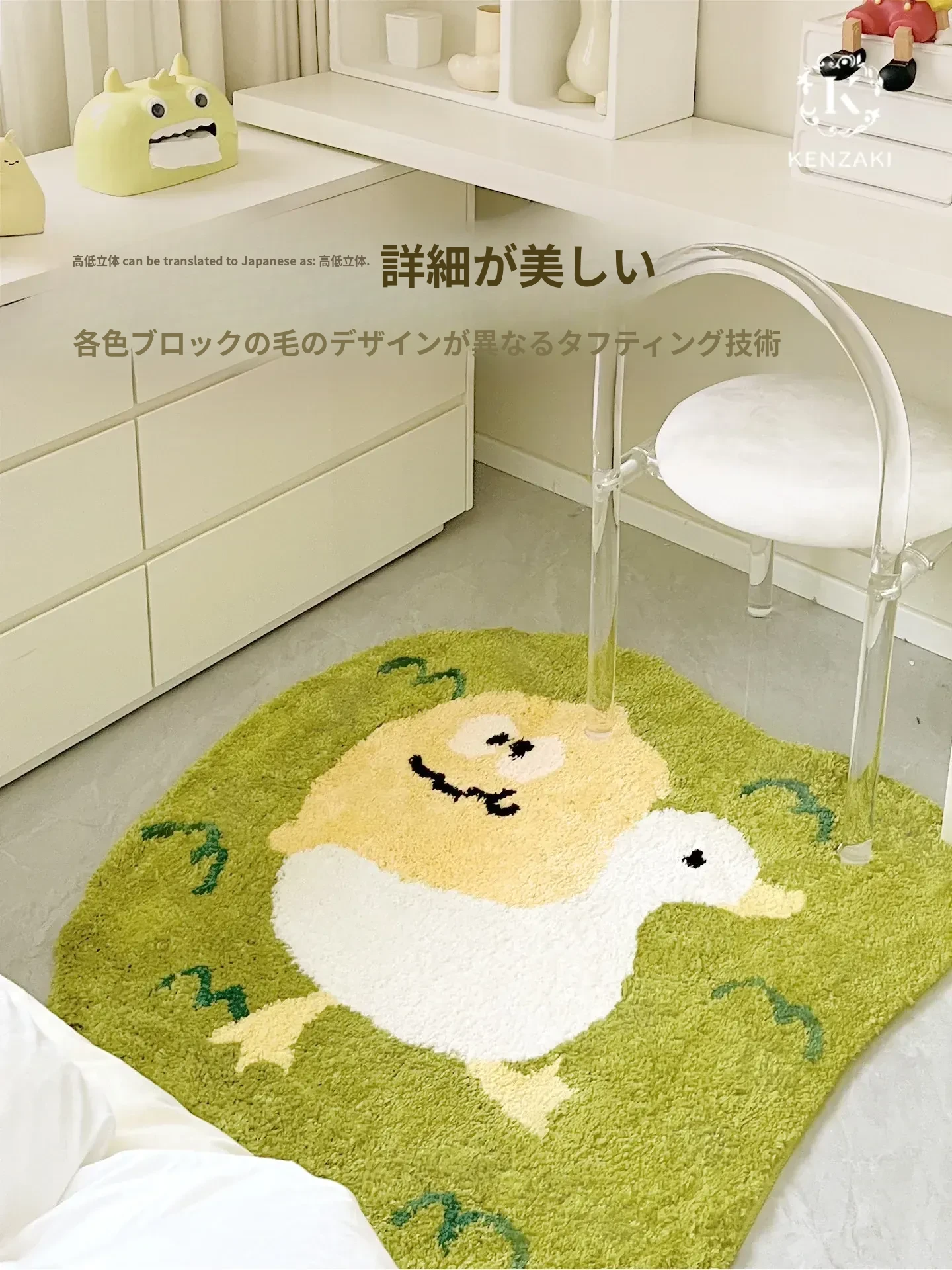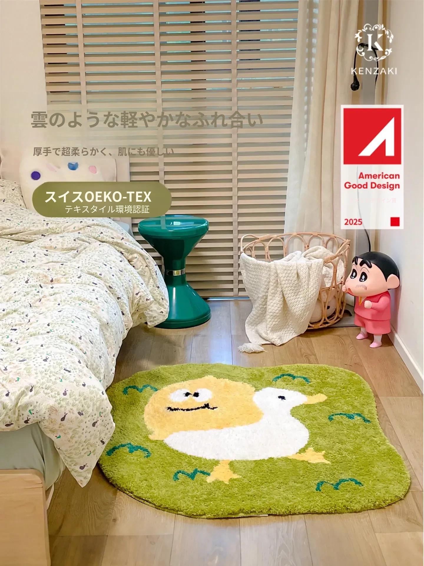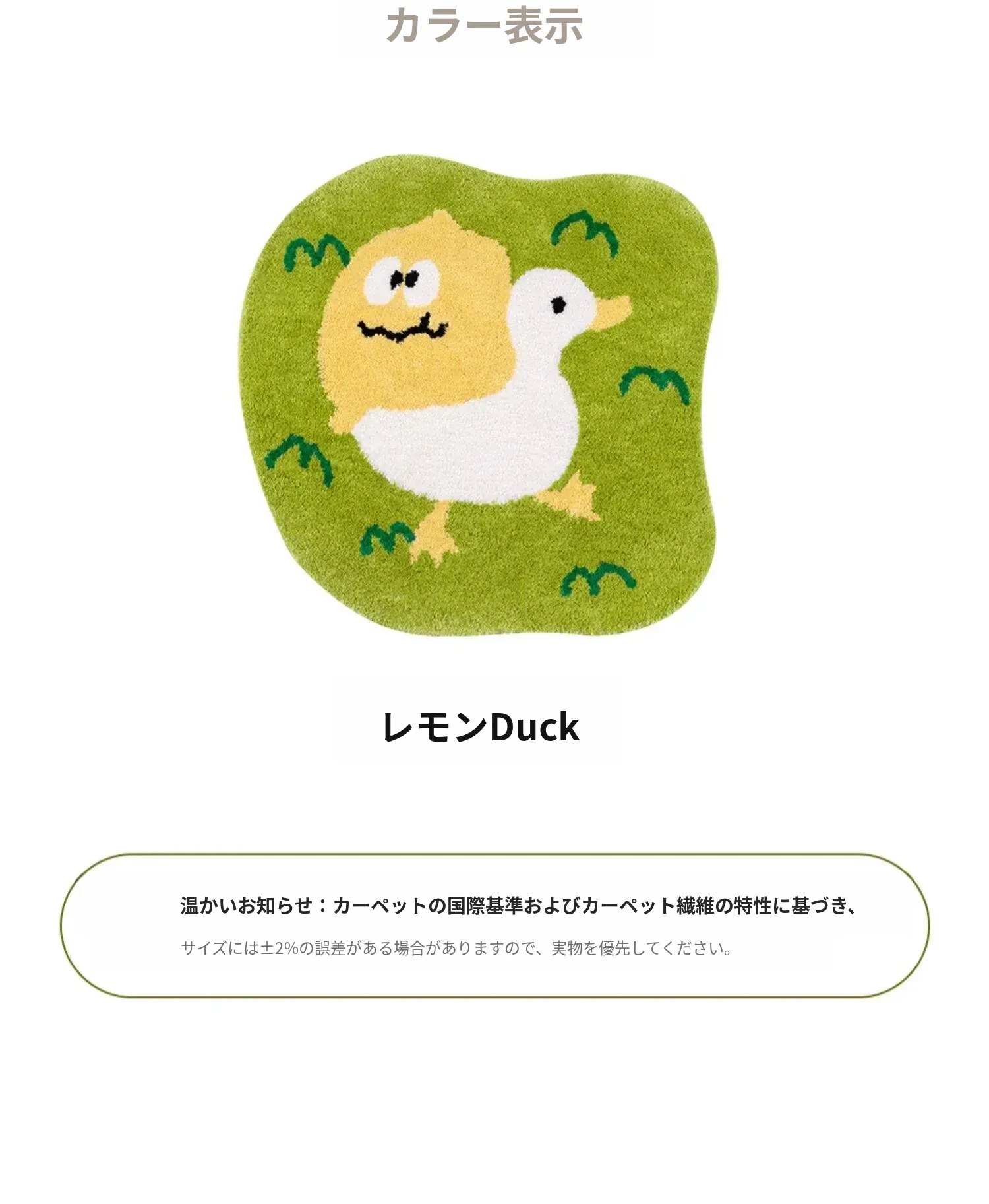 キュートなアヒルデザインの子供部屋用カーペット!男の子も女の子も大喜び♪ おしゃれなグリーンの異形マットは、ベッドサイドにもぴったり。洗濯機で洗えるので、いつでも清潔に保てます!