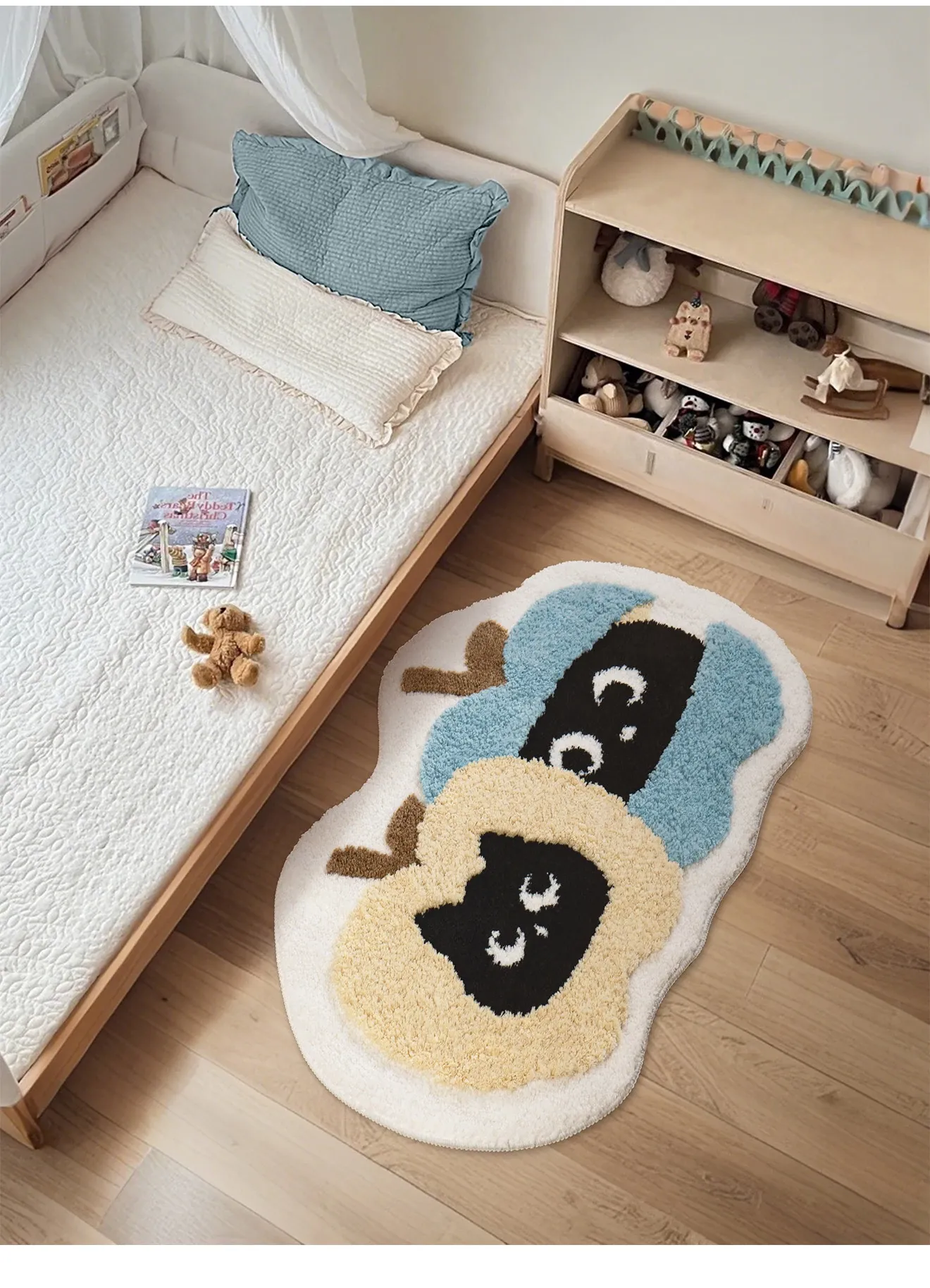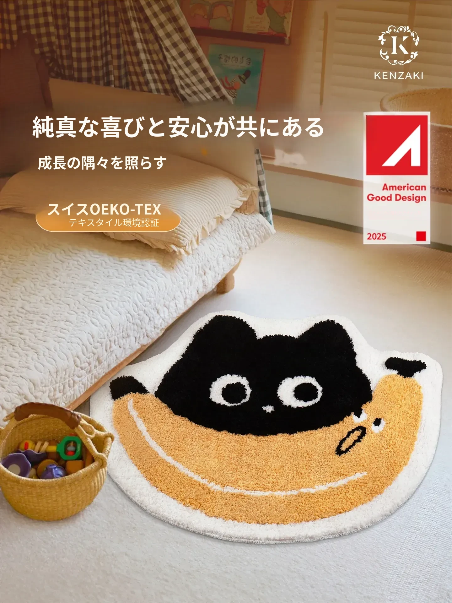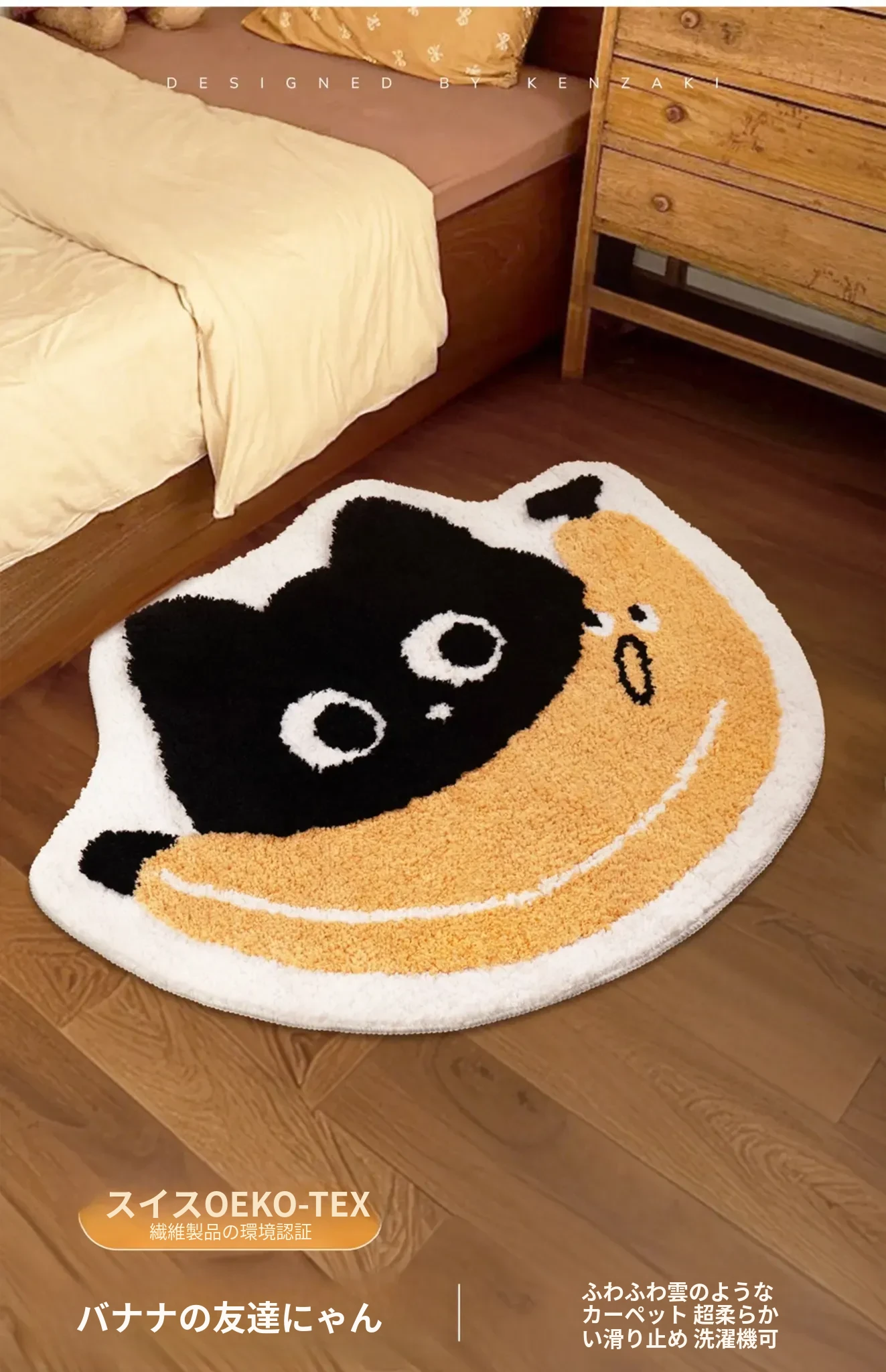 子供部屋にぴったり!おしゃれなインスタ風のベッドサイドカーペット。男の子も女の子も大好きな可愛いバナナや猫のデザイン。洗濯機で簡単に洗えるから、いつでも清潔!