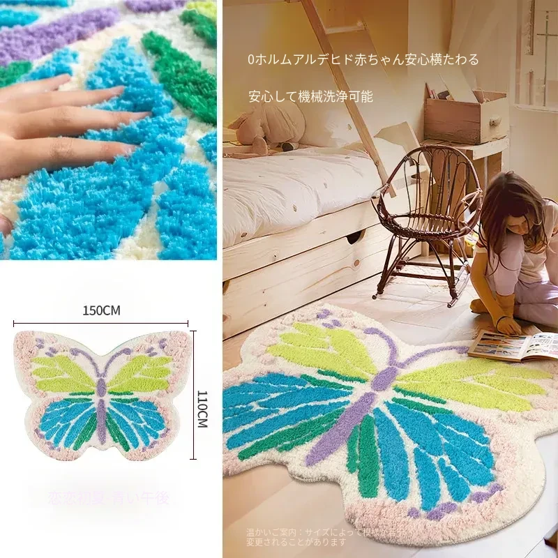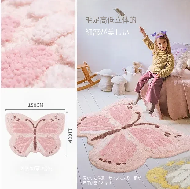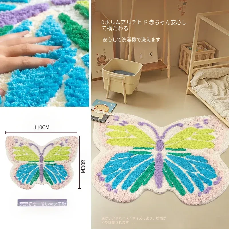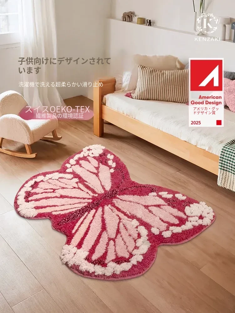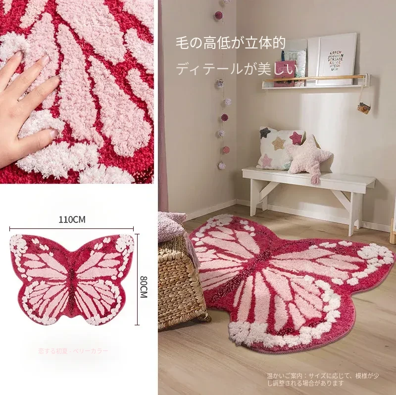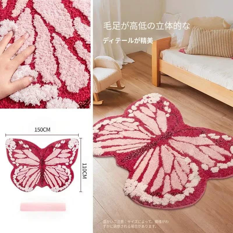 かわいい赤い蝶のデザインが魅力!子供部屋や女の子の寝室にぴったりな高級感あふれる滑り止め付き厚手ラグマット。ベッドサイドや床前に最適で、安全で快適な空間を演出します。