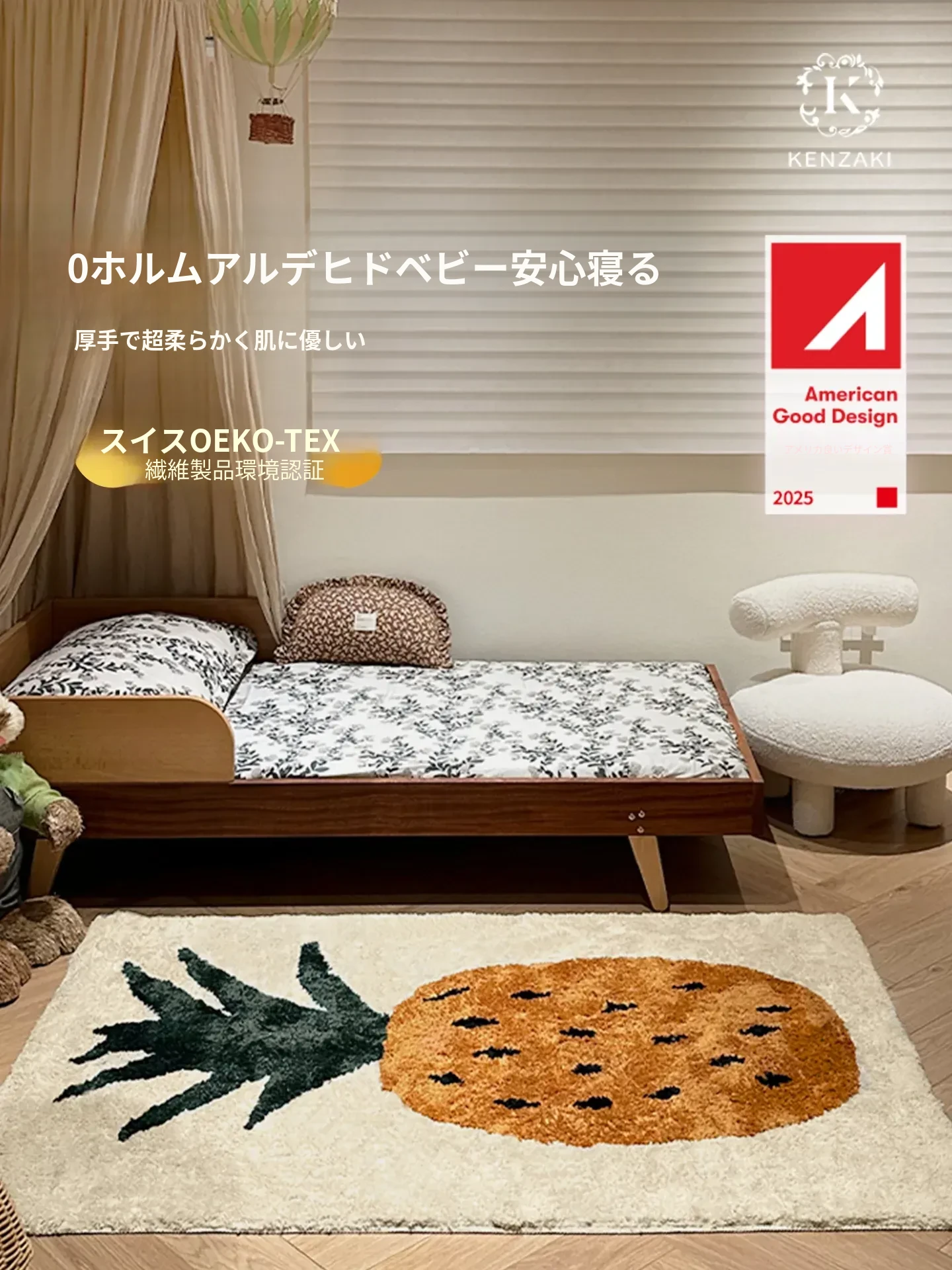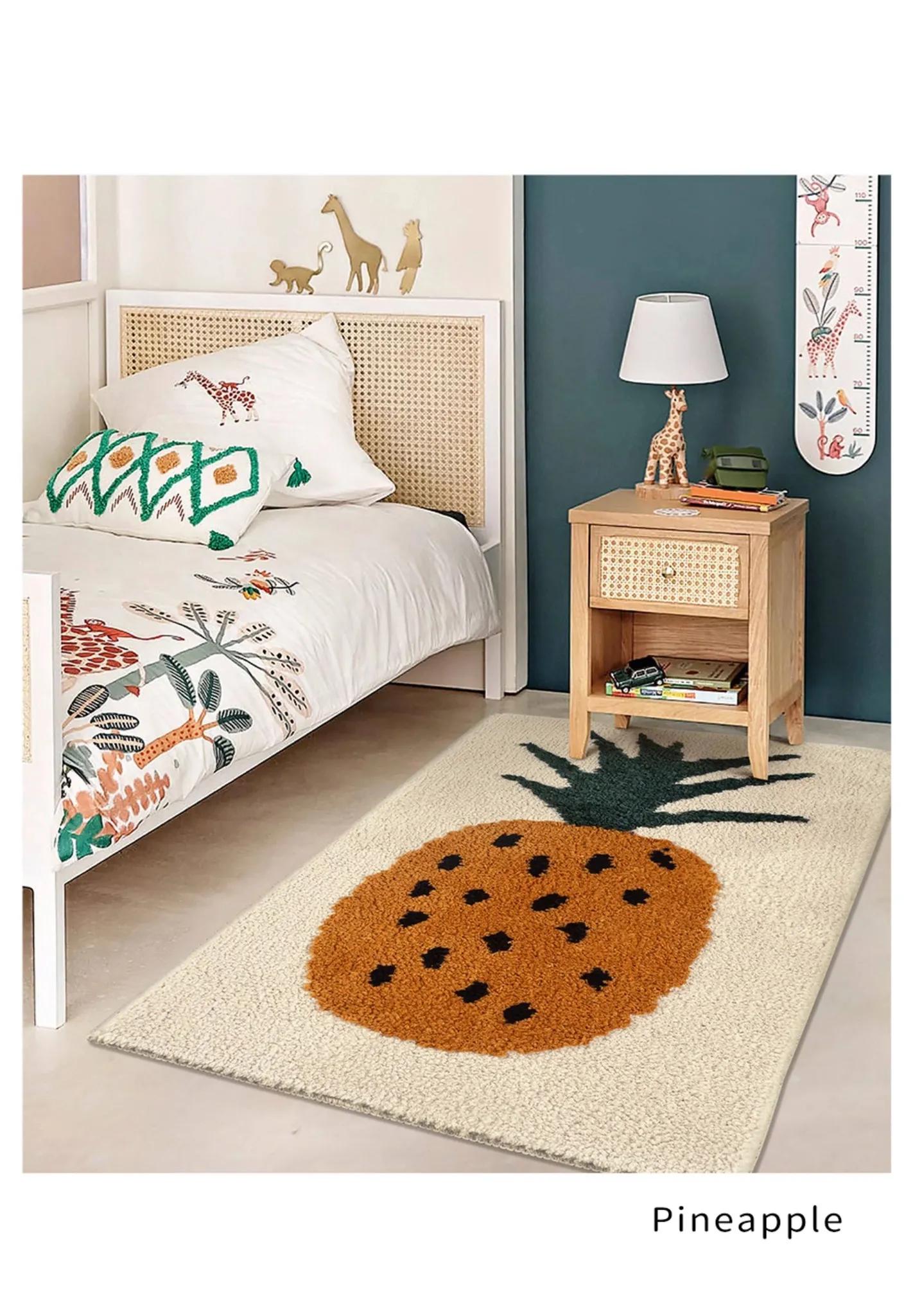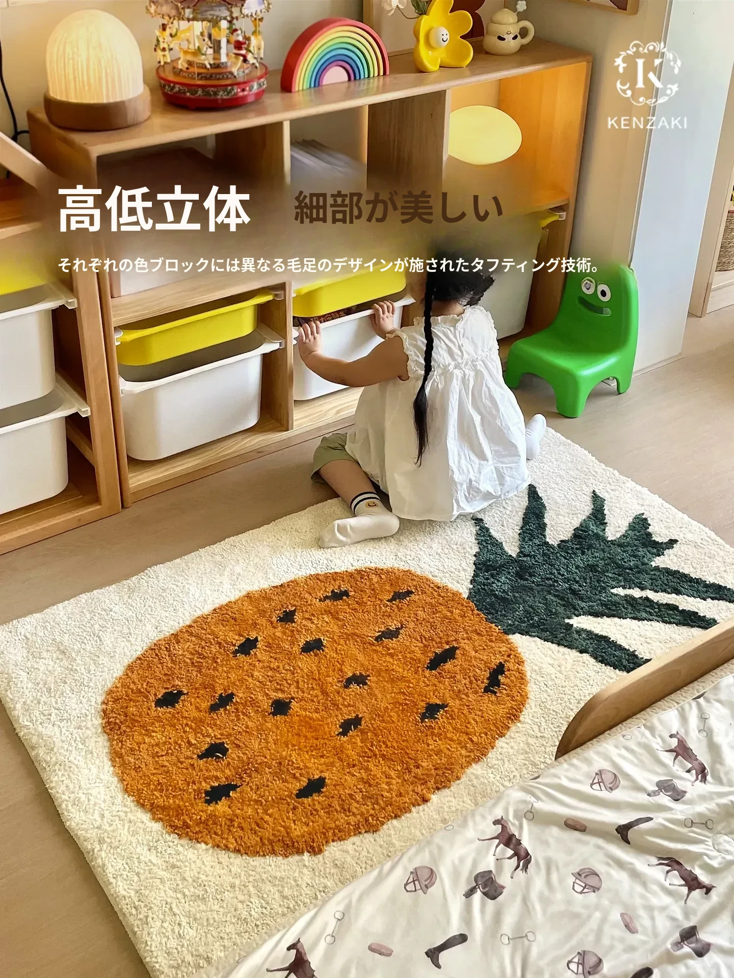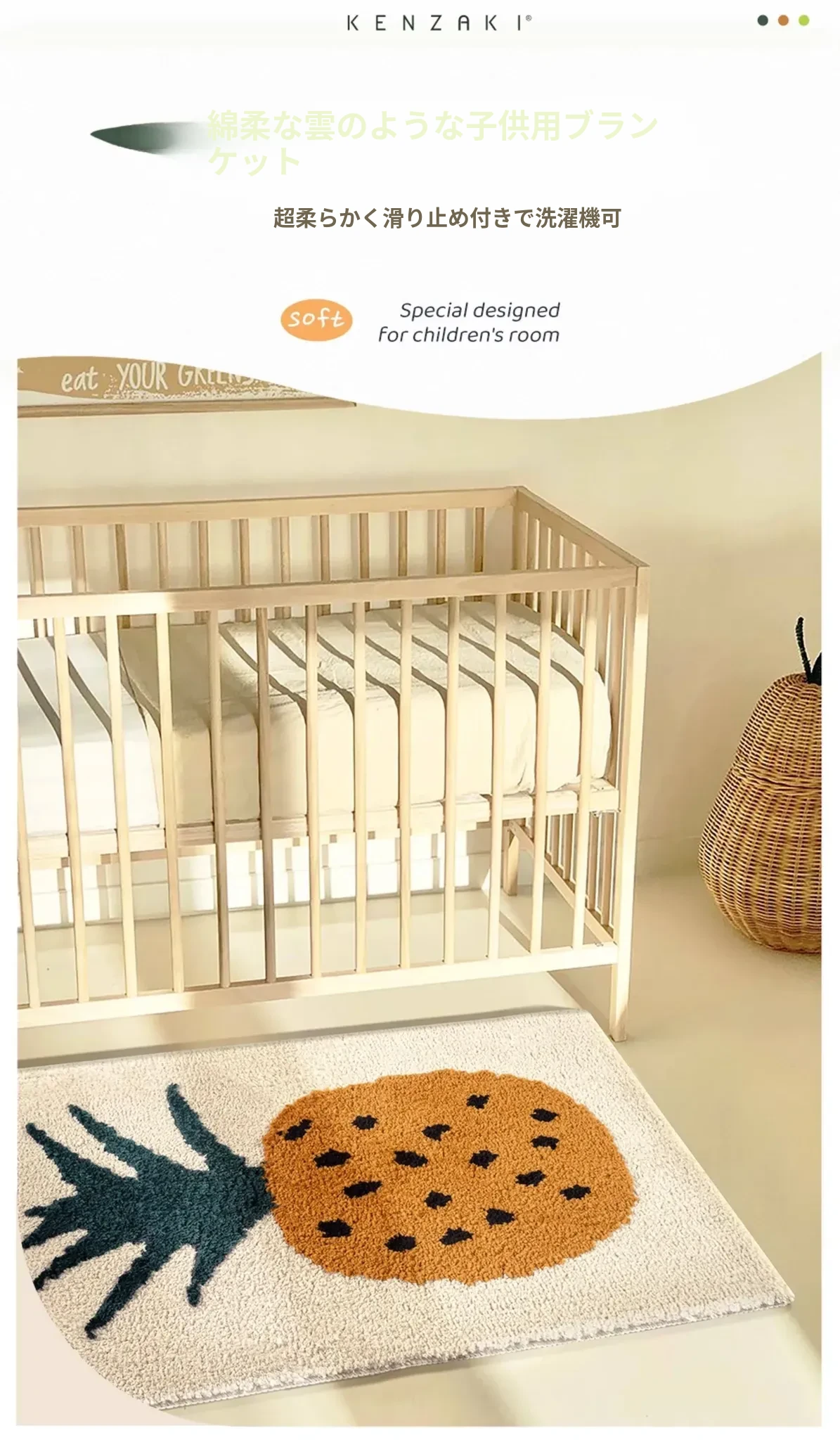 かわいいパイナップルデザインの子供用カーペット!滑り止め付きで、ベッドサイドや窓辺にピッタリ。お部屋を明るく彩るフルーツモチーフで、赤ちゃんや女の子に最適。洗濯機で丸洗いできるので、お手入れも簡単!