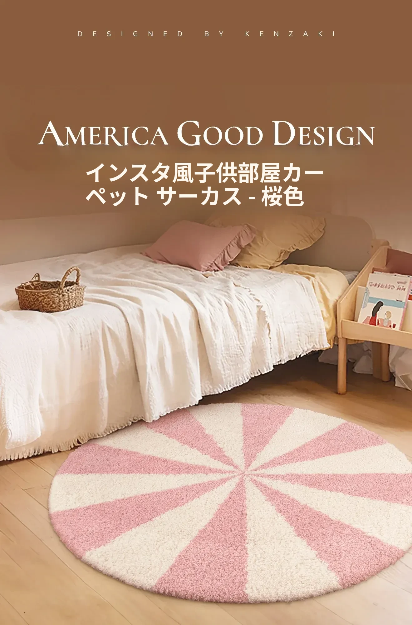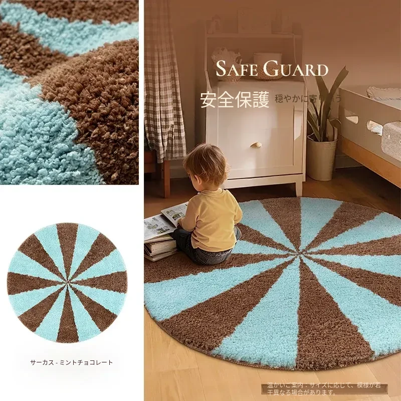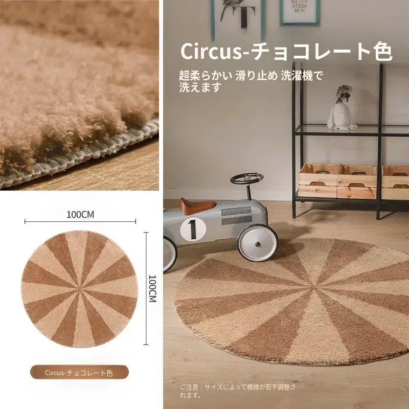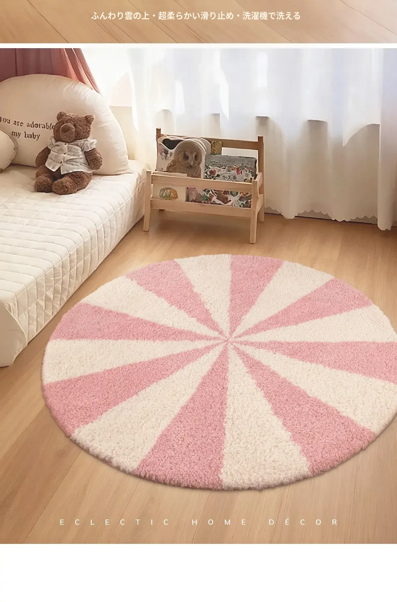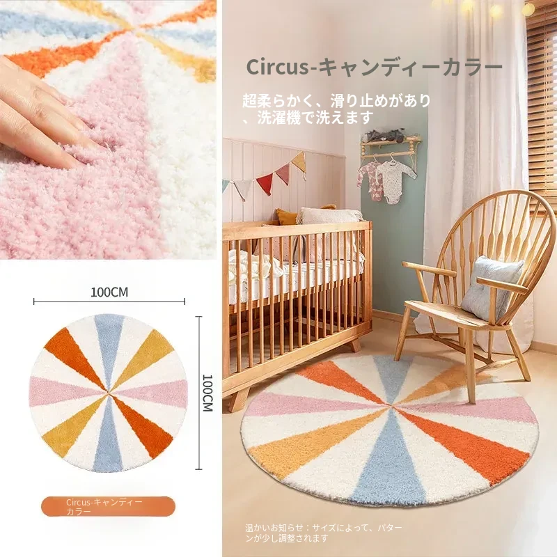 カーペットガールズの寝室にぴったり!インスタ風のベッドサイドカーペット、ピンクの丸型マット。子供部屋に最適な多幸感あふれるレインボーデザイン。洗濯機で丸洗い可能で、いつでも清潔をキープ!