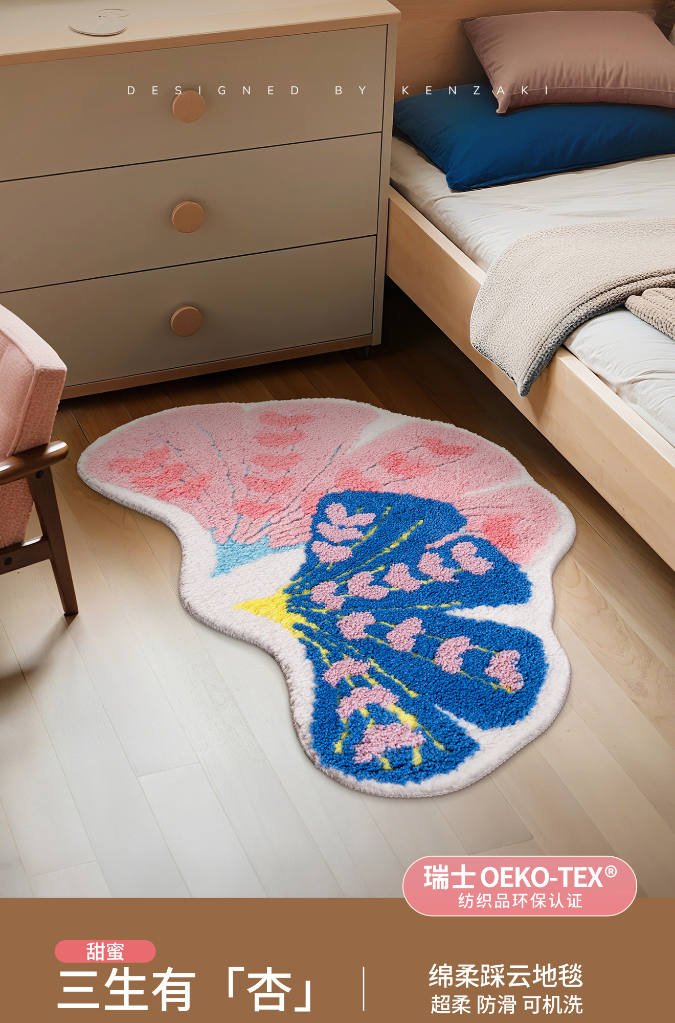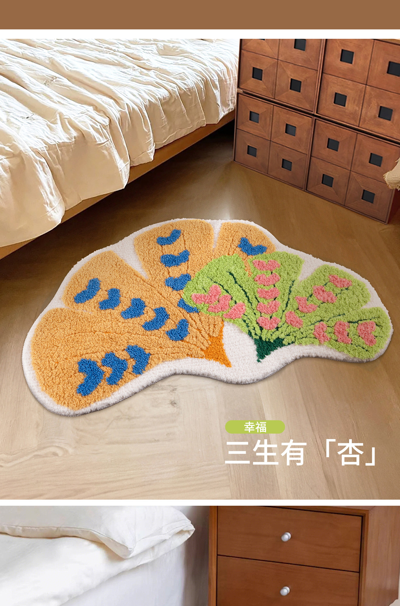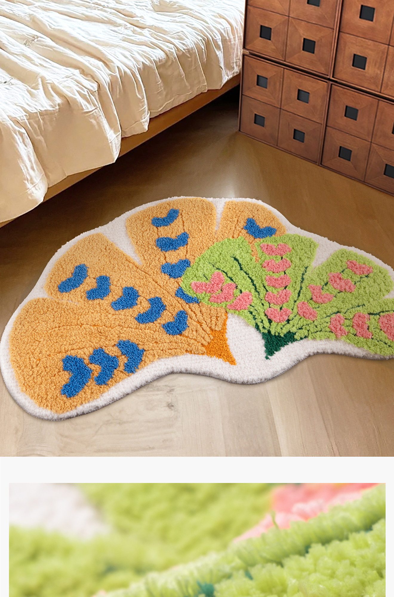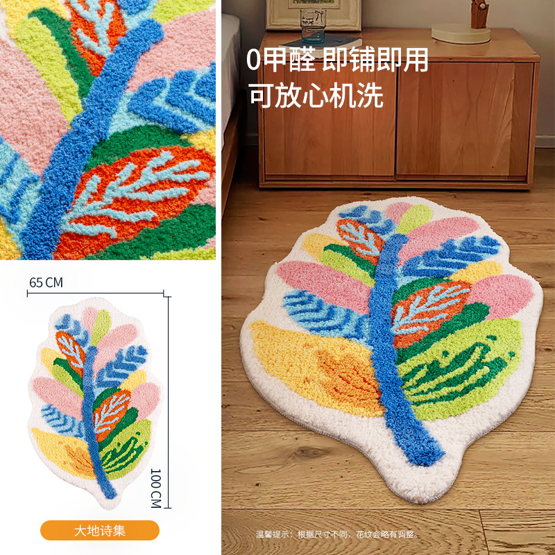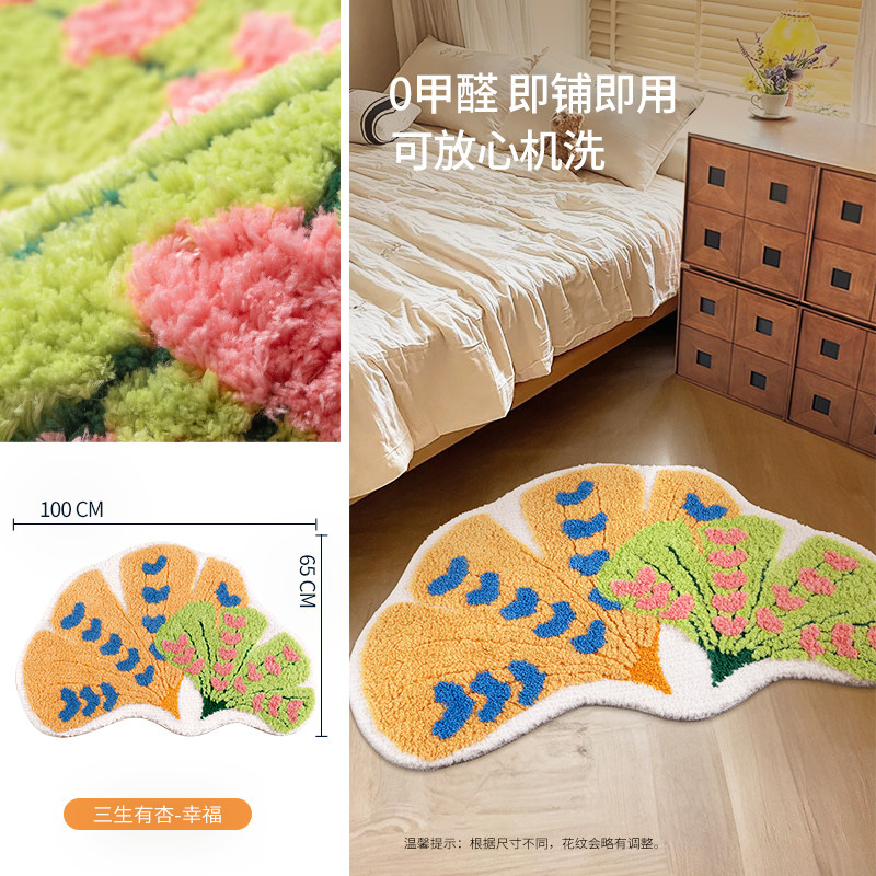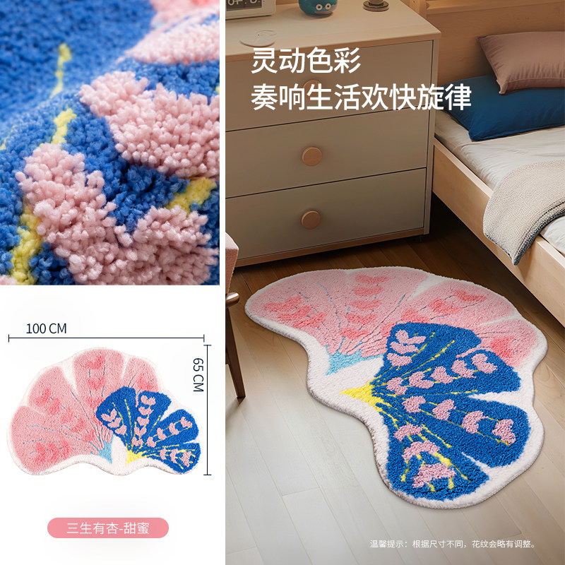 インスタ映えするカーペット!女の子の寝室にぴったりな、ドパミンカラーの銀杏の葉デザインピンク不規則型ベッドサイドマット。お子様も喜ぶ可愛いデザインで、洗濯機で簡単にお手入れ可能!