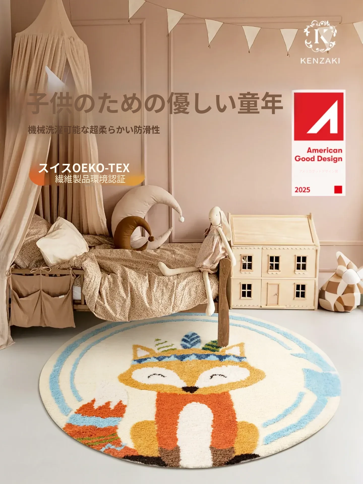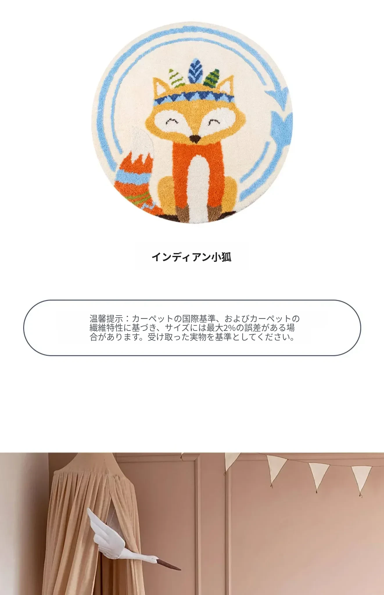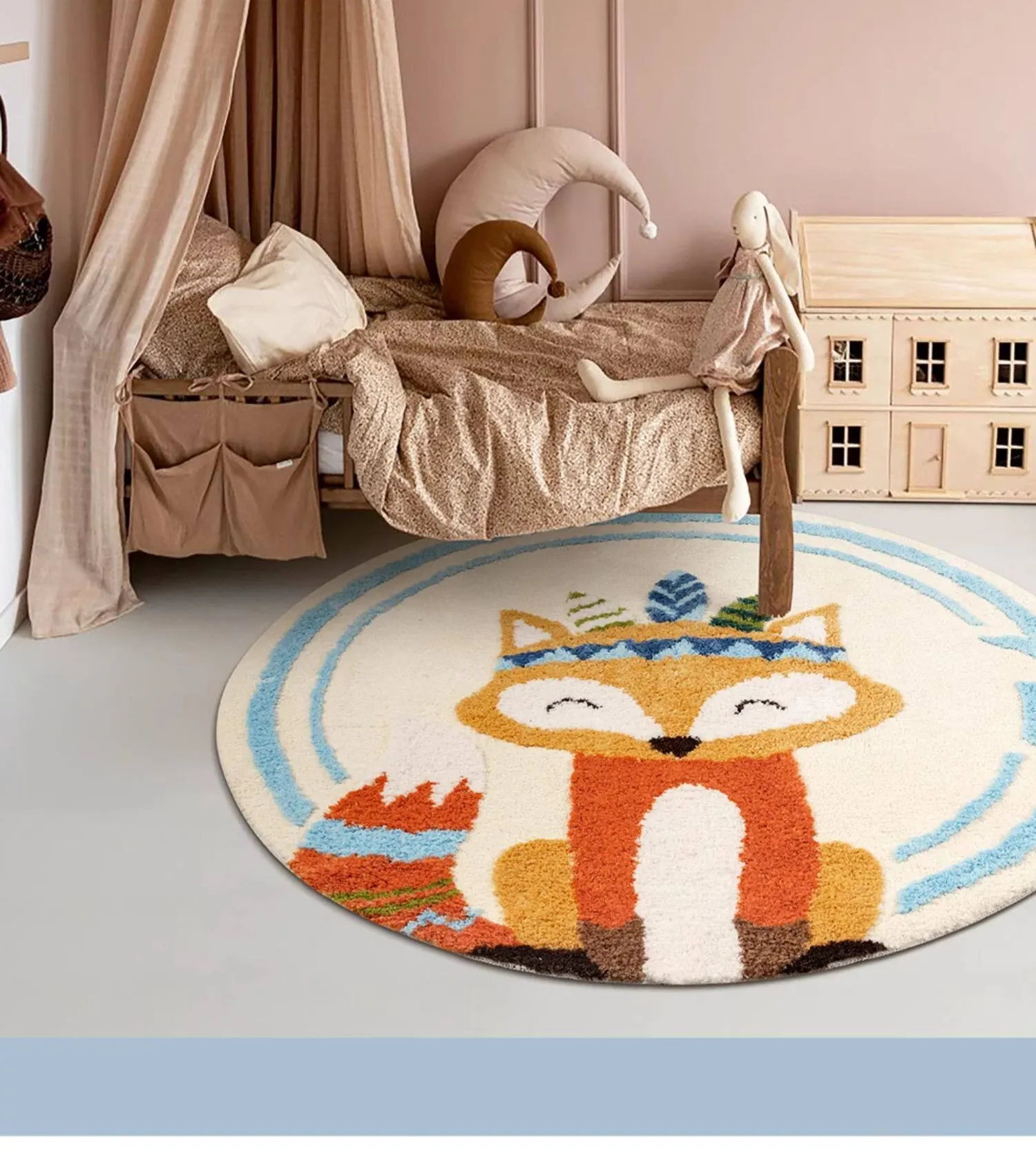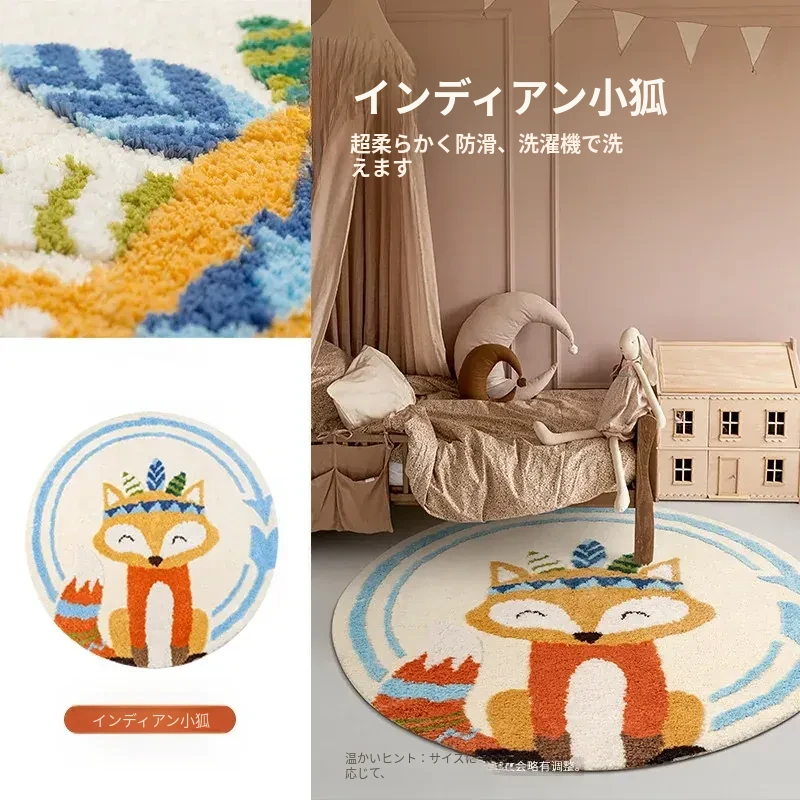 子供用ラグマット|男の子・女の子向け|ベッドサイドに最適な丸型マット|読書エリアを楽しく彩る|転倒防止・ダイエット効果も期待できる可愛いフォックスデザイン|洗濯機で丸洗いOK!