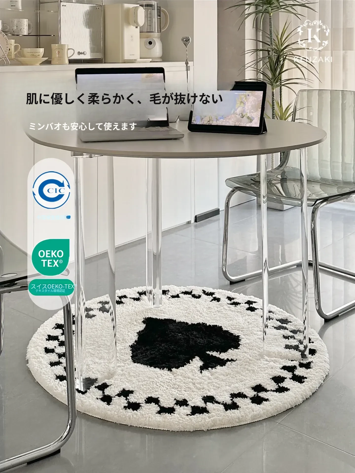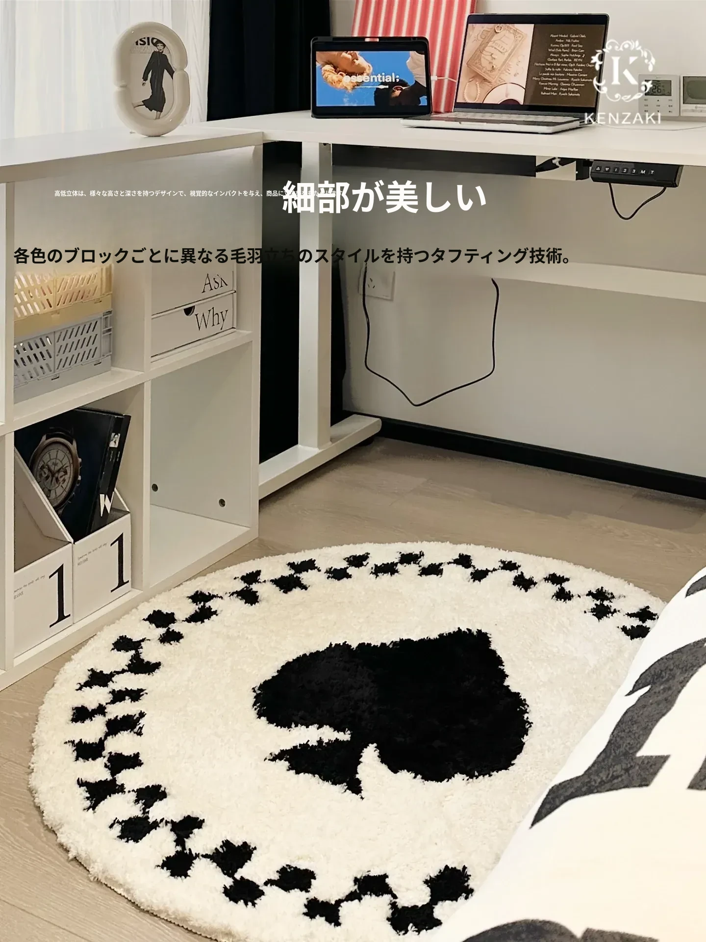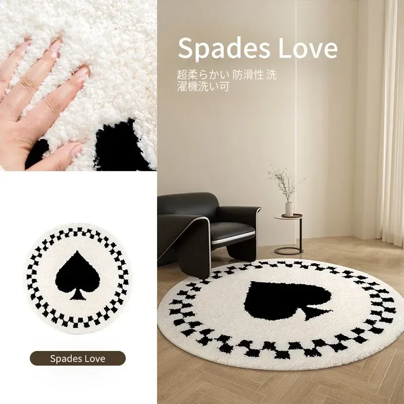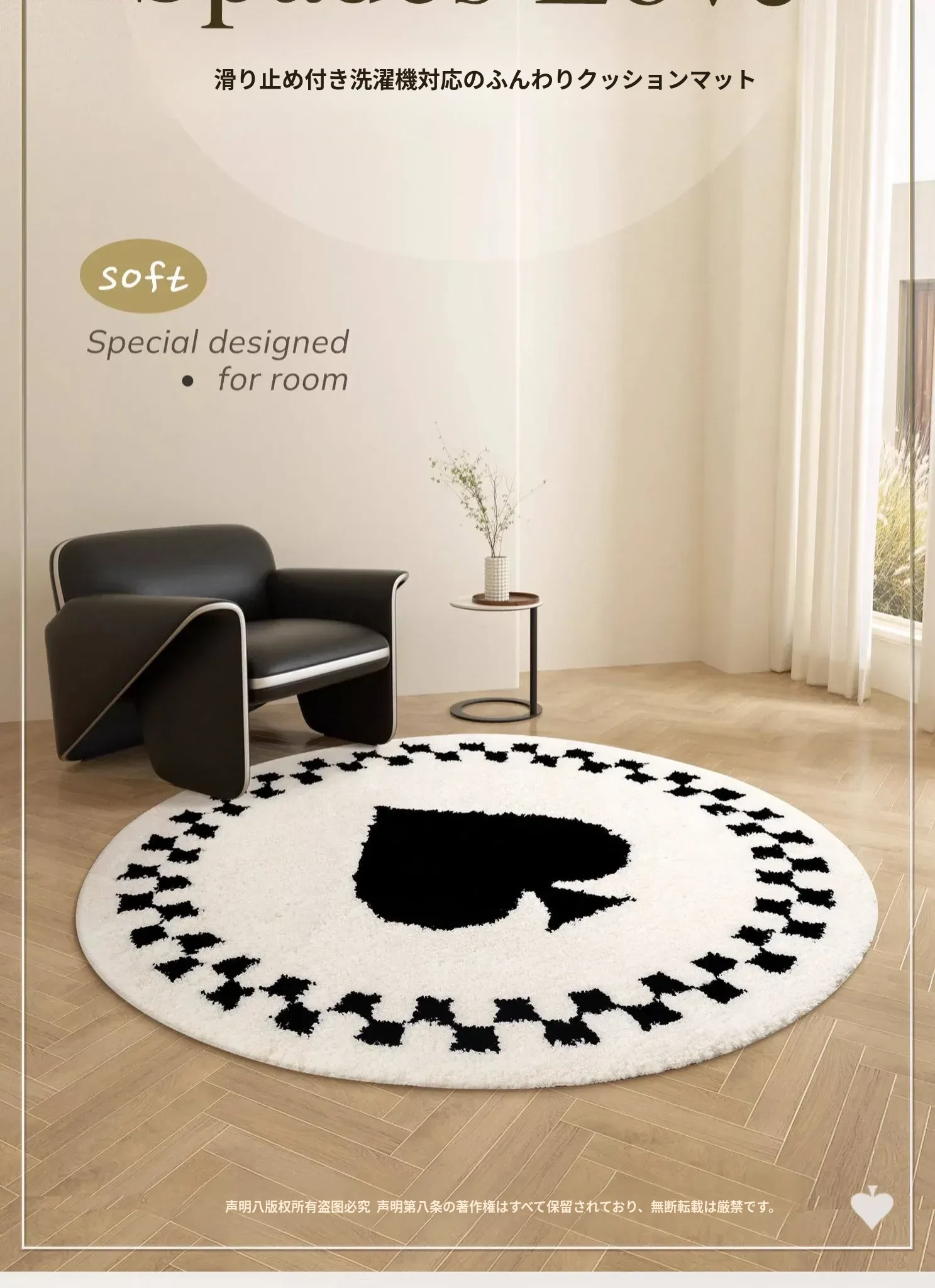 ラウンドカーペット リビング・ベッドルーム・ベッドサイド・チェア用マット 子供部屋に最適!超柔らかく洗濯機で洗える ブラック・ハートデザインでおしゃれなインテリアを演出!