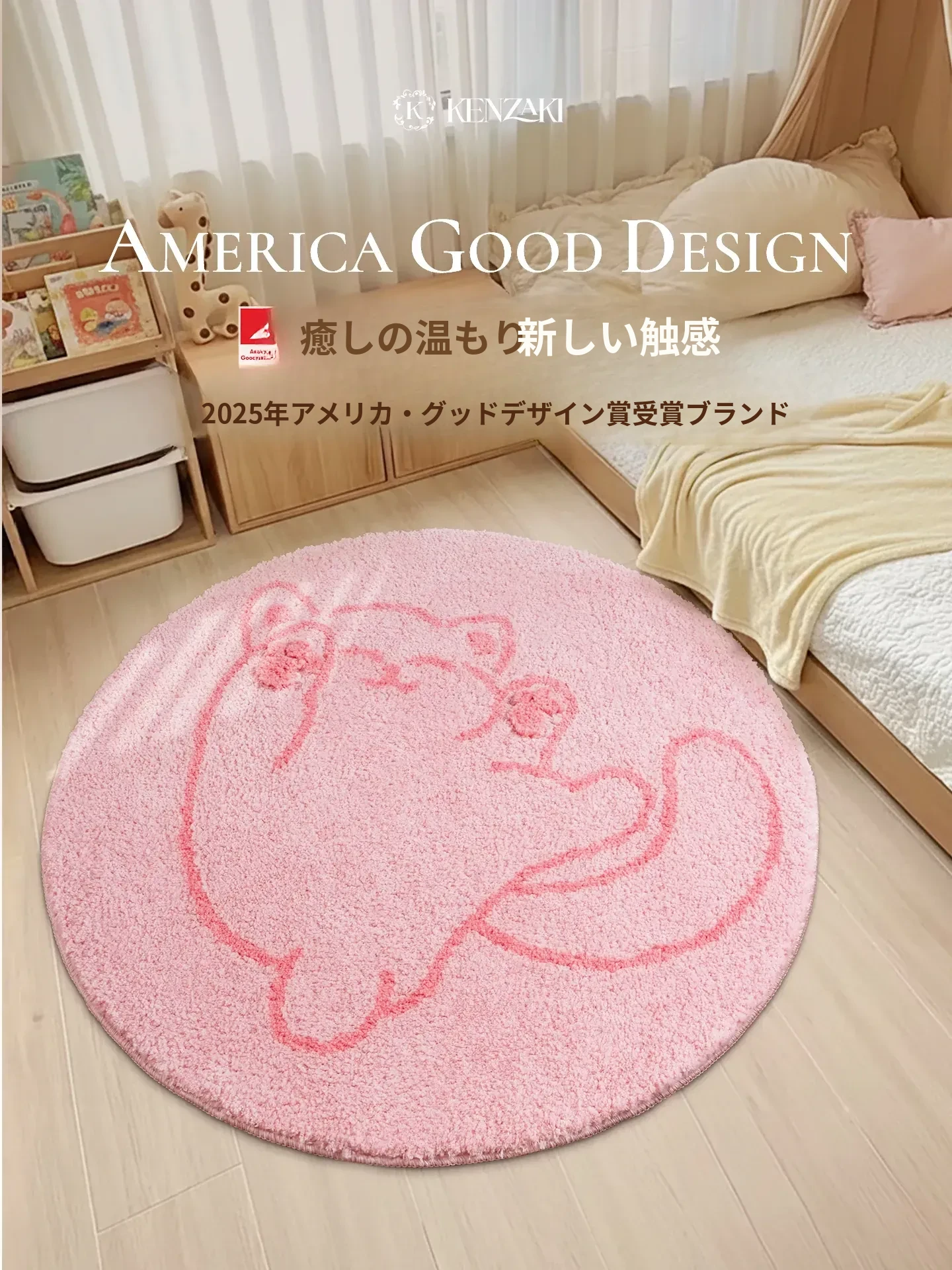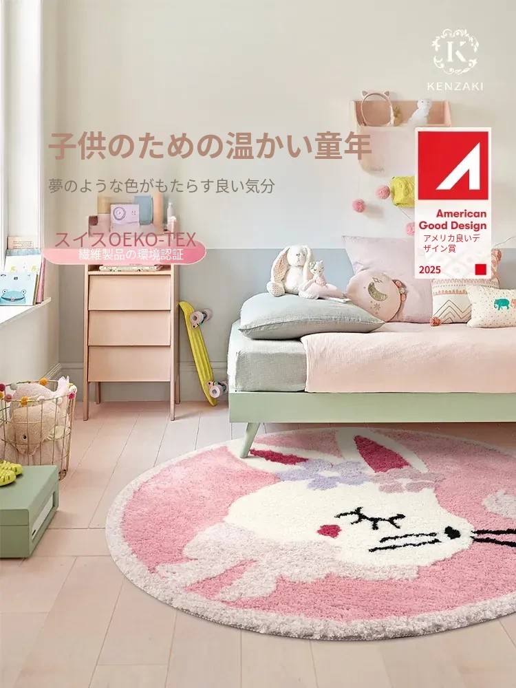 女の子の部屋にぴったりな!かわいいウサギデザインの厚手ラウンドカーペット。滑り止め付きで安心、洗濯機で洗えるからいつでも清潔。インスタ映えするピンクのベッドサイドマットで、子供部屋を華やかに彩りましょう!