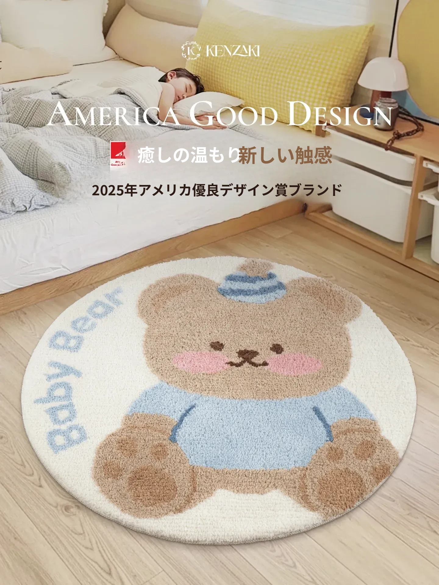 子供用可愛いクマデザインの青いラウンドカーペット、インテリアにぴったり!男の子・女の子向け、ベッドサイドに最適。洗濯機で洗えるのでお手入れも簡単です!