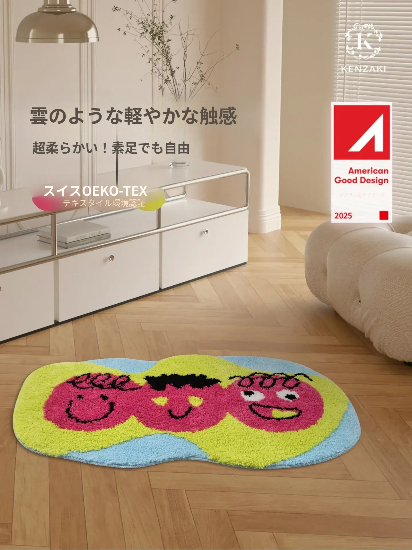 KENZAKI健崎 洗濯可能なオリジナルデザイン ベッドサイド・リビング用 滑り止め付き 可愛いドーパミンカラー 子供用ラグマット