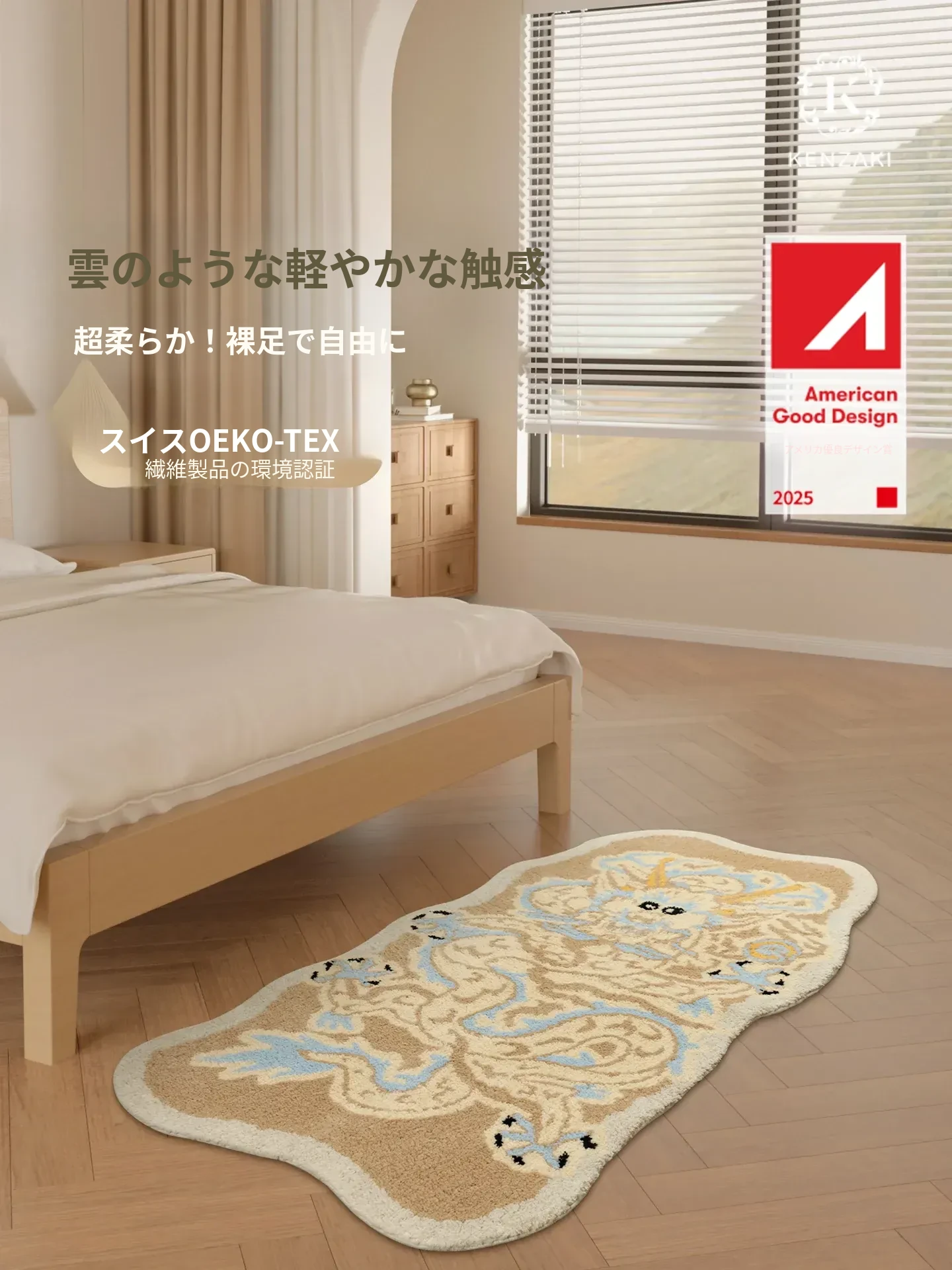 KENZAKI健崎 2024年ドラゴン年の魅力!冬にぴったりの洗えるカーペット、寝室やリビングに最適。子供のハイハイにも安心な滑り止め付き、快適さを追求したベッドサイドマット。