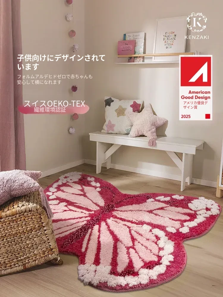 女の子のための可愛い蝶々デザインの子供用カーペット - インスタ映えする不規則な形状で、厚みのあるダイレクトマット。お部屋のアクセントにぴったり!
