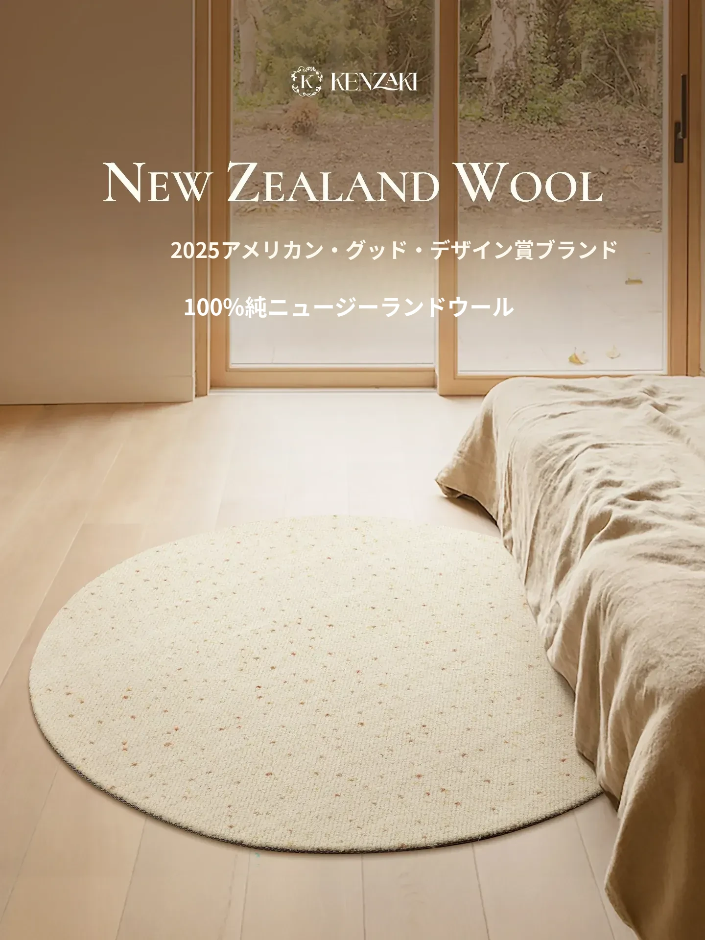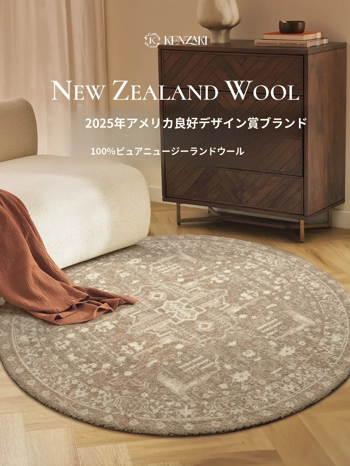 100%ニュージーランドウールラグ|寝室・ベッドサイドに最適なラウンド型|子供部屋・リビングにぴったりの軽やかで高級感あふれるクリーム風フレンチスタイル