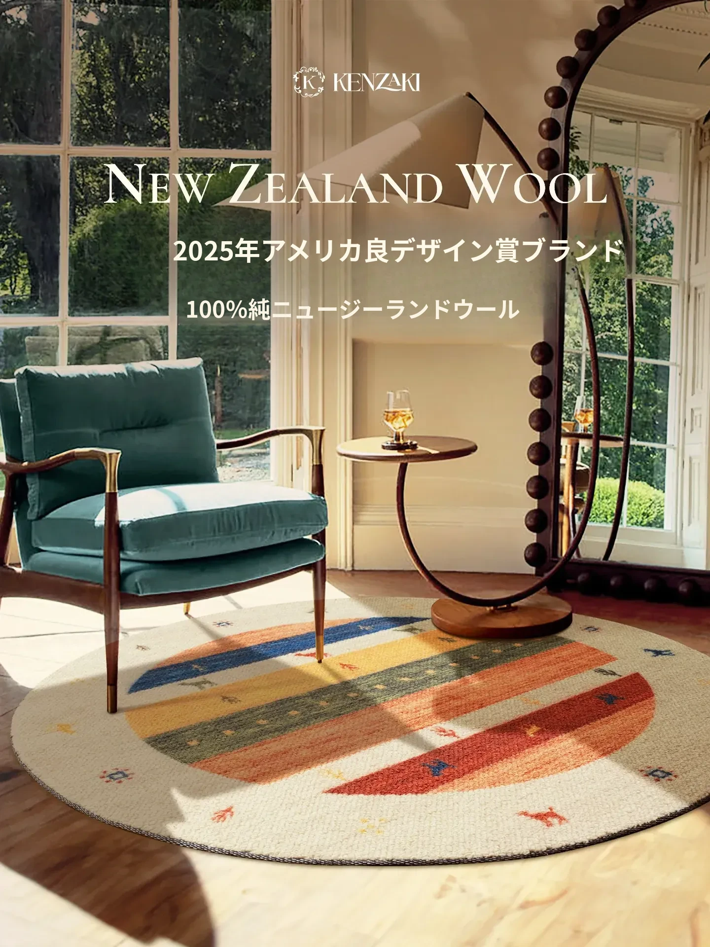 100%ニュージーランド羊毛ラウンドカーペット|ラグジュアリーで高級感あふれるリビングや新しい寝室にぴったり!レトロなフレンチ・アメリカンスタイルで、心地よい空間を演出します。