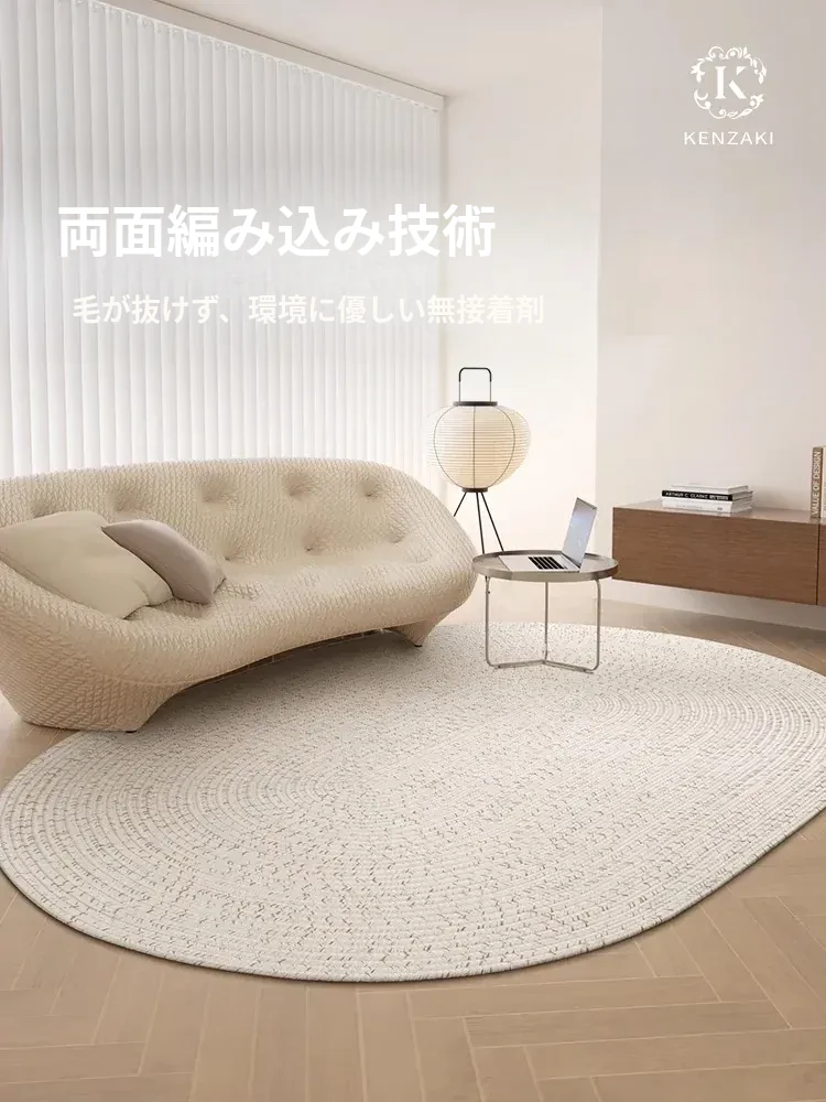 KENZAKI 北欧スタイルのクリームカラーシンプルデザイン!居心地の良いリビングや書斎にぴったりの楕円形ウィーブラグ。接着剤不使用で安心、安全な素材を使用。おしゃれで機能的な空間を演出します!