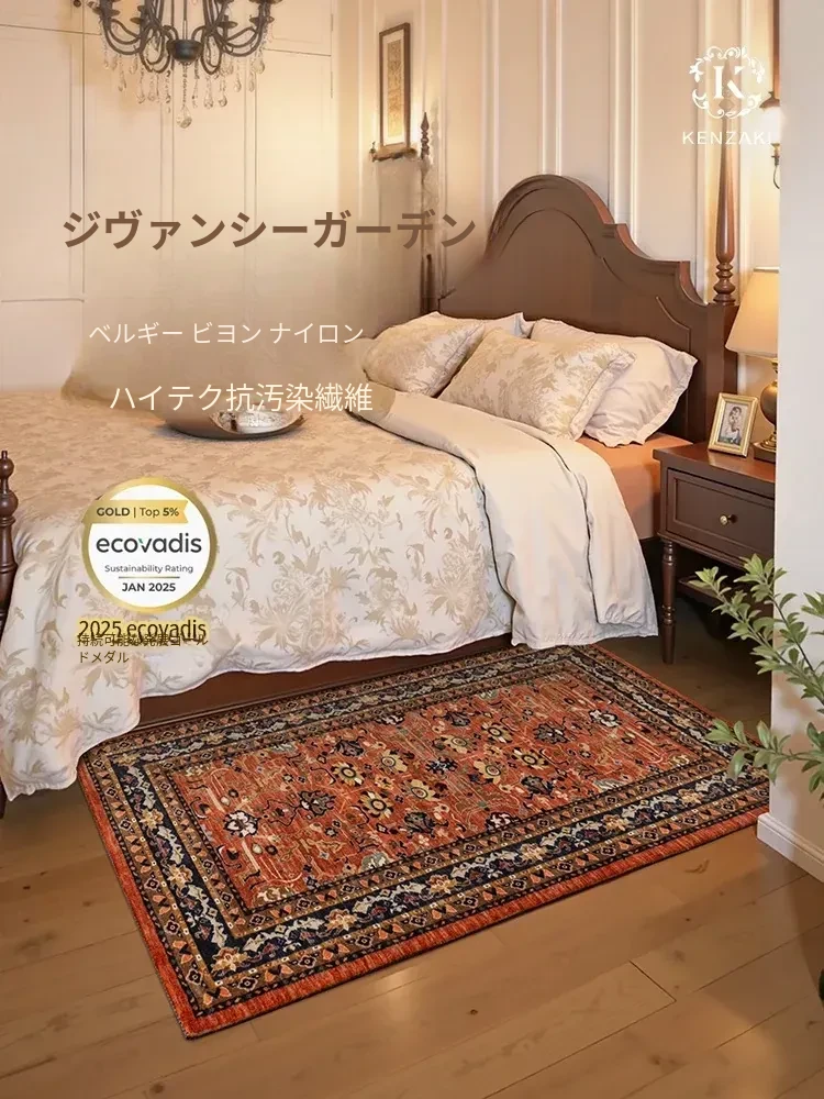 新しいラグ・リビングルームに最適な高級フレンチビンテージスタイルの赤いベッドサイドカーペット・モスカラーのマット・アンティーク風・洗濯機で簡単お手入れ可能!