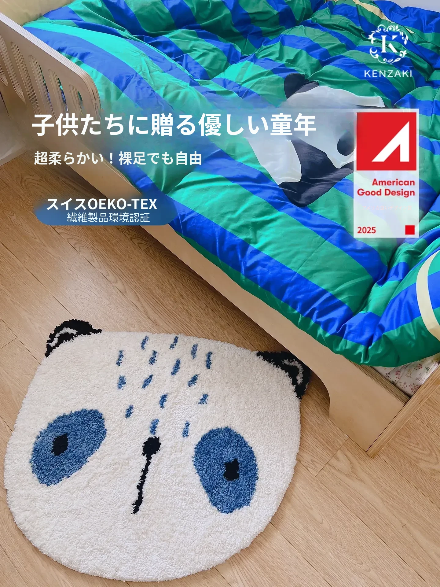 かわいいパンダデザインの子供用ラグマット!寝室やベッドサイドにぴったり。男の子・女の子どちらのお部屋にも合う不規則な形状。洗濯機で簡単お手入れ可能で、安心して使えます。お子様の成長を楽しくサポート!
