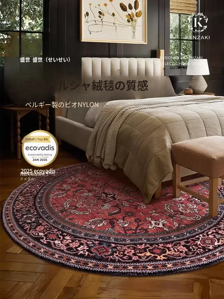 ラウンドカーペット ベッドサイドマット リビング用 高級感漂うフレンチヴィンテージ 赤色ペルシャ風 厚手デザイン おしゃれで快適なお部屋作りに最適!