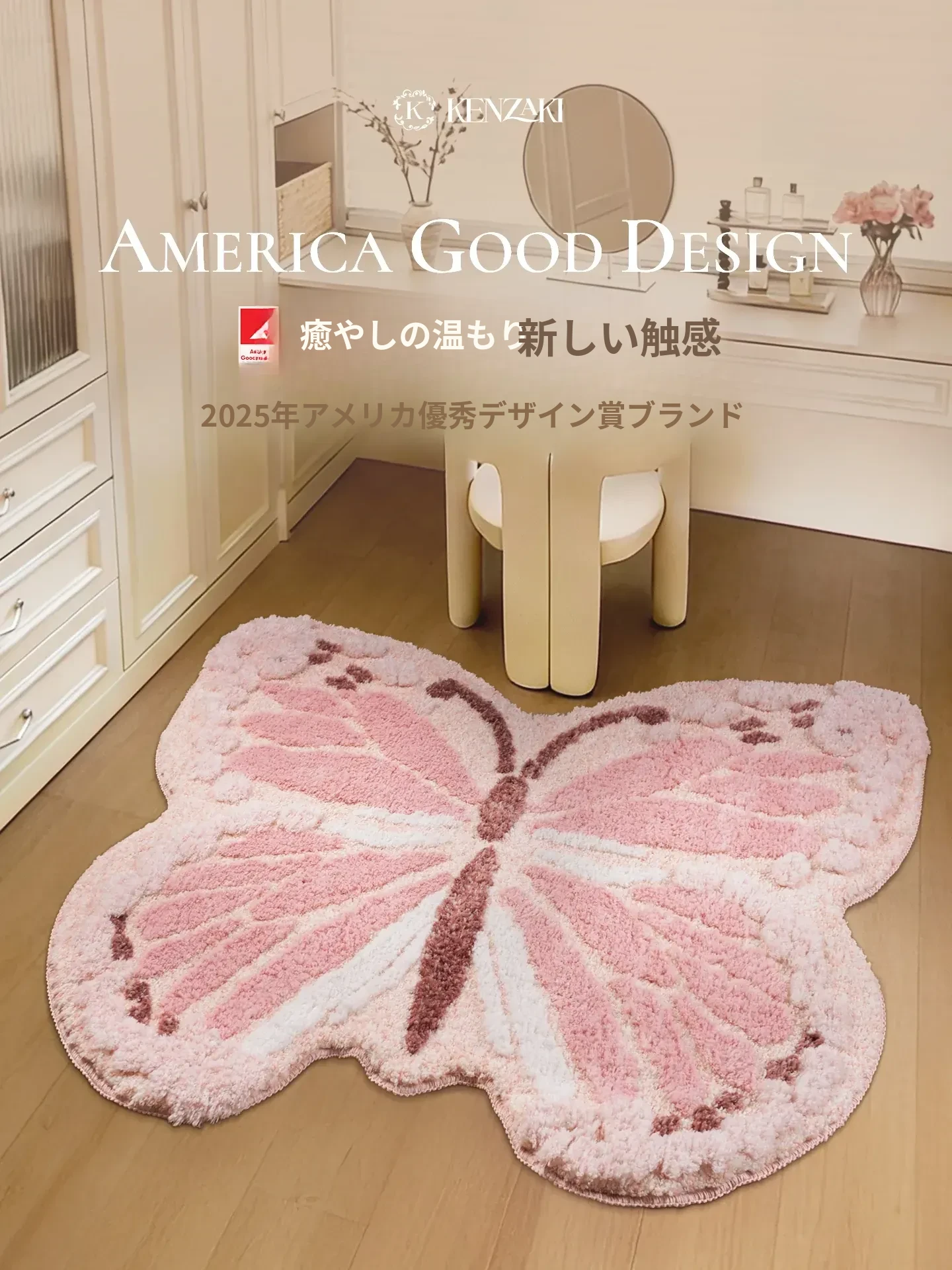 女の子の部屋にぴったり!おしゃれなインスタ風のメイク台マット。ピンクの蝶柄が可愛い、洗えるベッドサイドラグ。子供部屋やクローゼットにも最適なデザインで、お部屋を華やかに演出します!