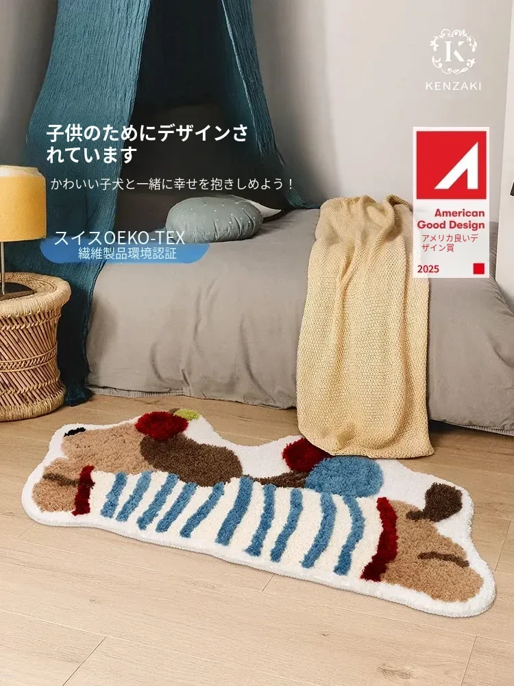 かわいい青い子犬デザインの子供用ラグマット - 男の子・女の子の部屋にぴったり!おしゃれな形状で、洗濯機で簡単にお手入れ可能。ベッドサイドに最適なアイテムです!