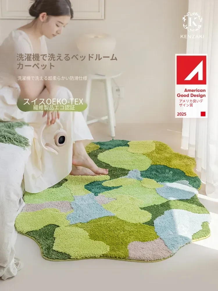 子供部屋やリビングにぴったり!グリーンモスデザインの滑り止め付きユニークラグマット。おしゃれなベッドサイドやソファ下に最適で、洗濯機で簡単に洗えるので清潔さを保てます。