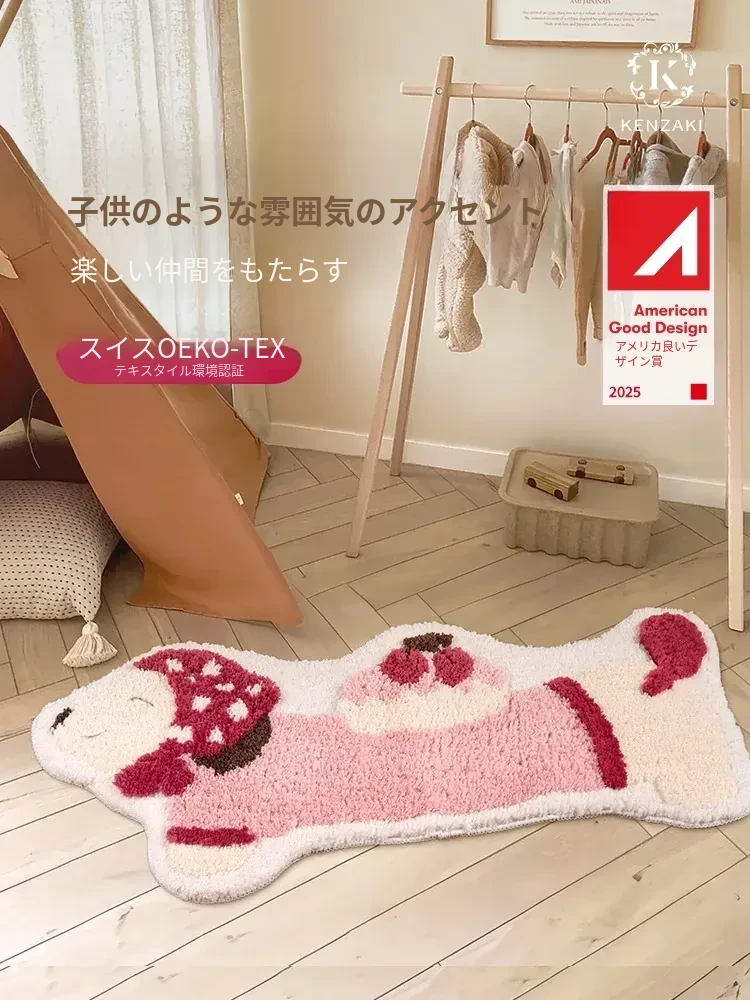 ピンクモスデザインの防滑ラグ - 子供部屋やベッドサイドに最適な厚手マット、洗濯機で洗える!おしゃれで安心な空間作りにぴったり!