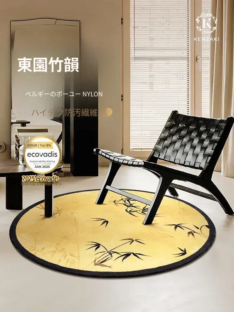 ラウンドカーペット リビングルーム用の軽やかで高級感あふれるマット 寝室のベッドサイドや書斎にもぴったり 新中式デザインの竹モチーフ フレンチヴィンテージスタイルの鮮やかなイエロー