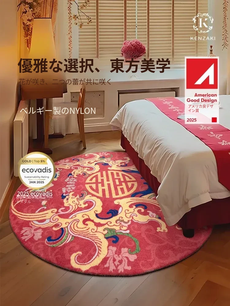 2025年新作!結婚式にぴったりなラグ - ベッドサイド用の高級感溢れる赤い円形カーペット。洗濯不要の便利なデザインで、新婚生活を彩る一枚。