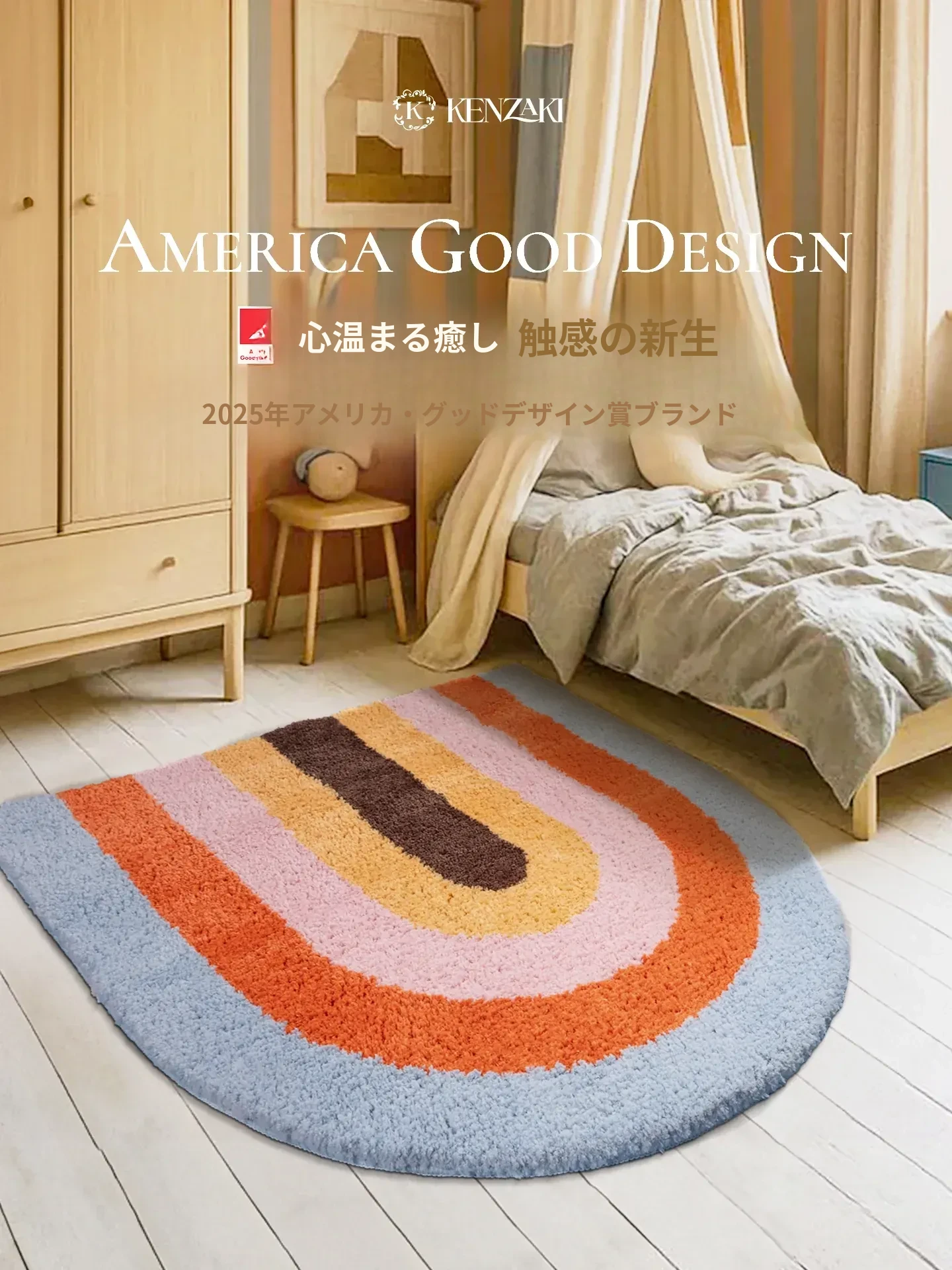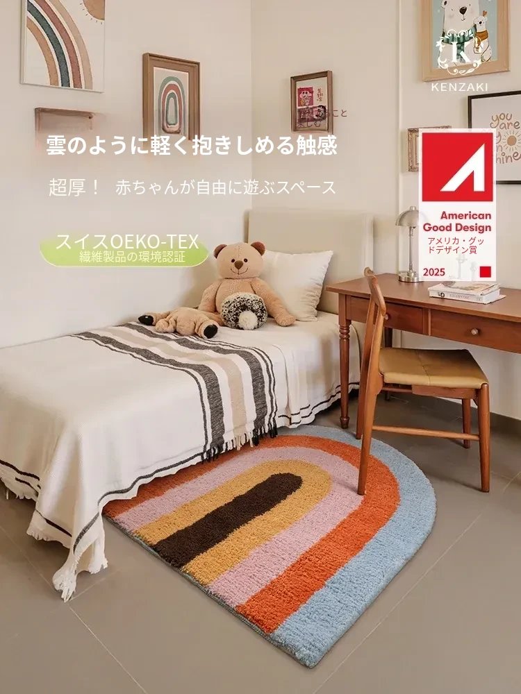 2025年新作!子供部屋や寝室にぴったりなインスタ風ラグマット。カラフルな虹のハーフ円デザインで、おしゃれな女の子の部屋を演出!洗濯機で洗えるのでお手入れも簡単です。