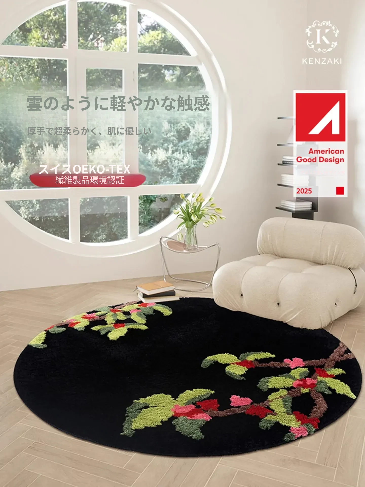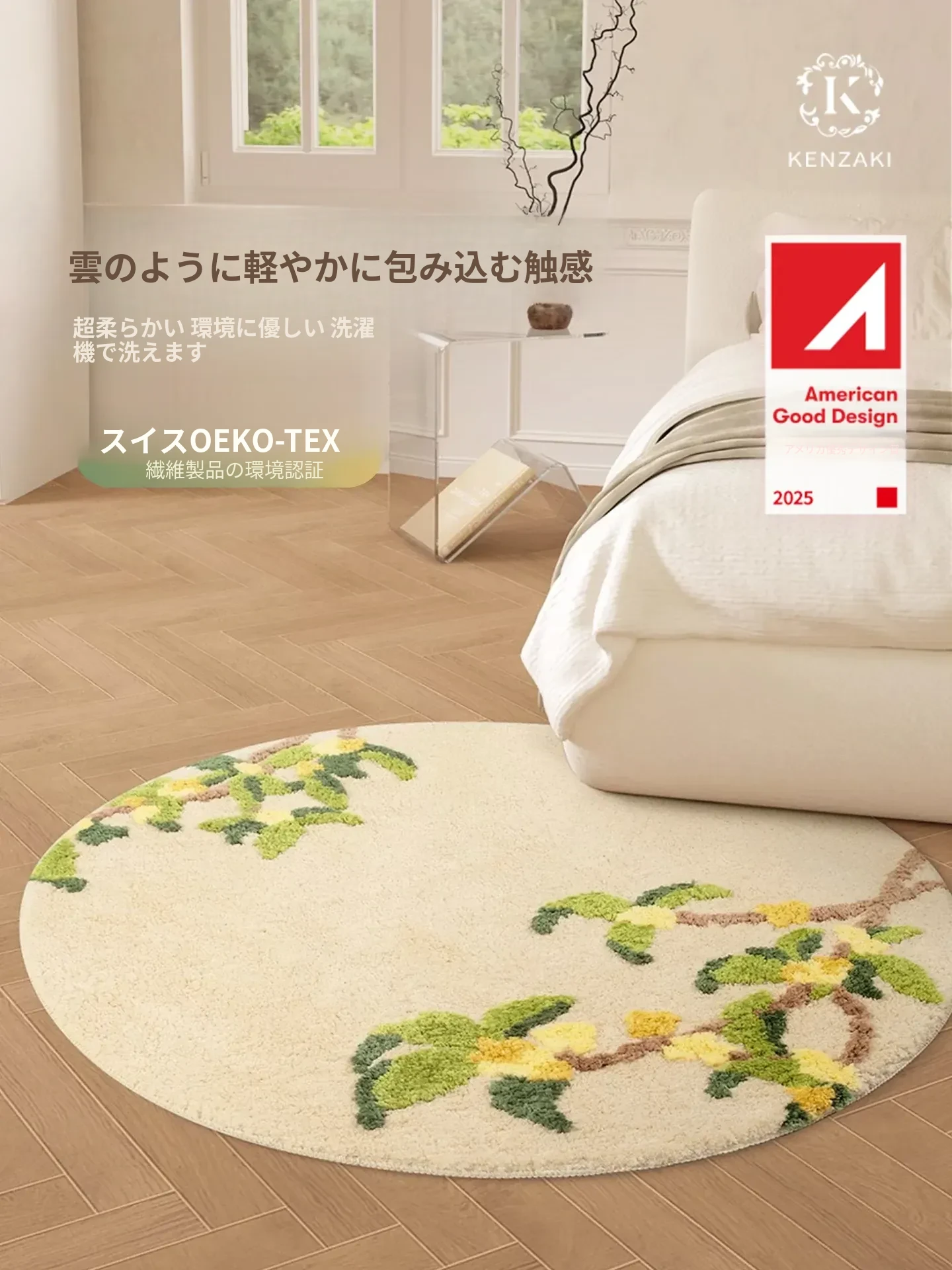ラグジュアリーな新中式デザインの円形カーペット!寝室やベッドサイドにぴったりの厚手防滑マット。クリーミーな風合いで、おしゃれな空間を演出。洗濯機で簡単に洗えるので、いつでも清潔に保てます!