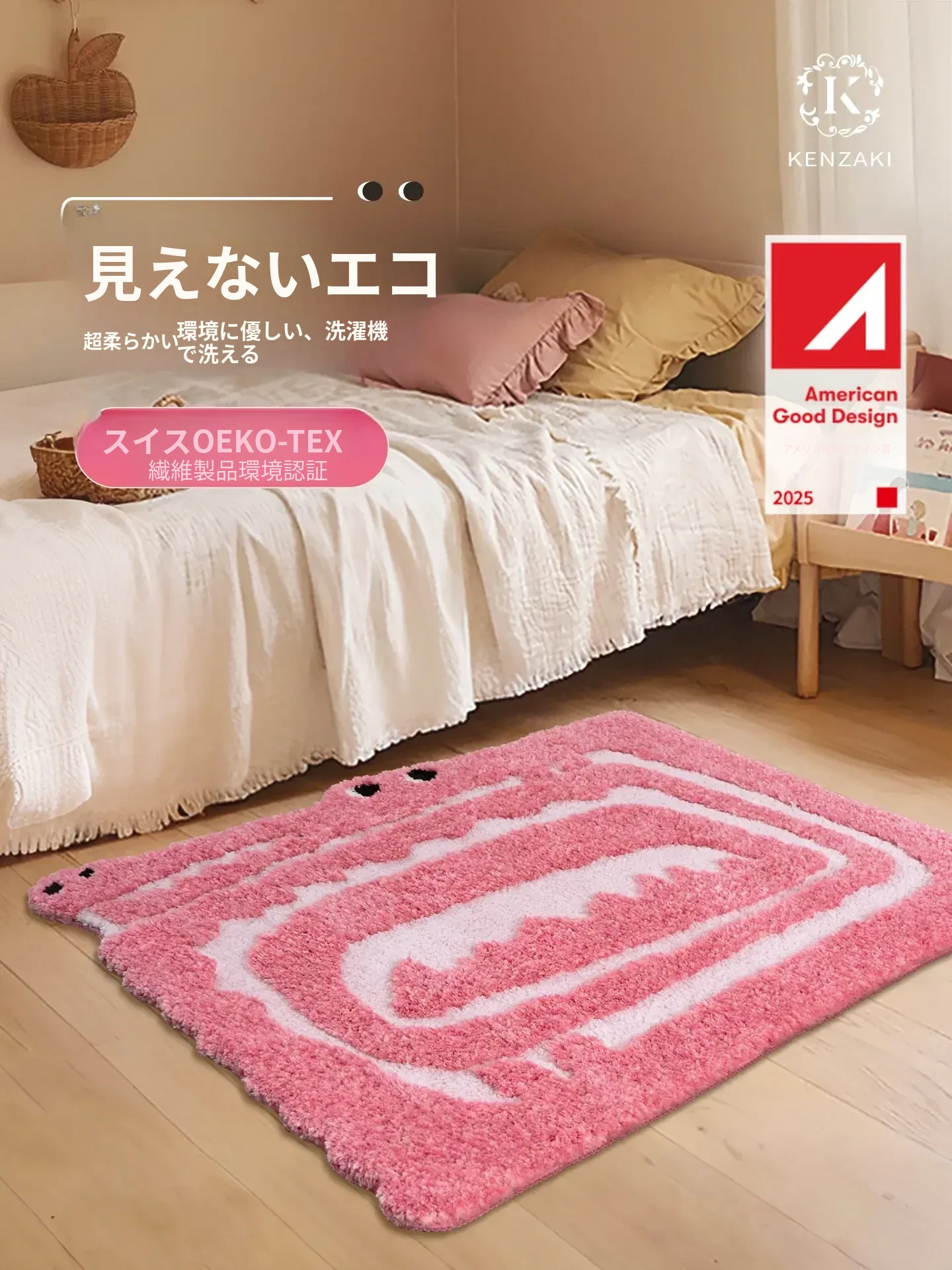可愛らしい子供用カーペット!インスタ風のピンクのデザインで、女の子の寝室にぴったり。滑り止め付きで安心、安全。洗濯機で簡単に洗える小さなワニの形が魅力的なベッドサイドマット!