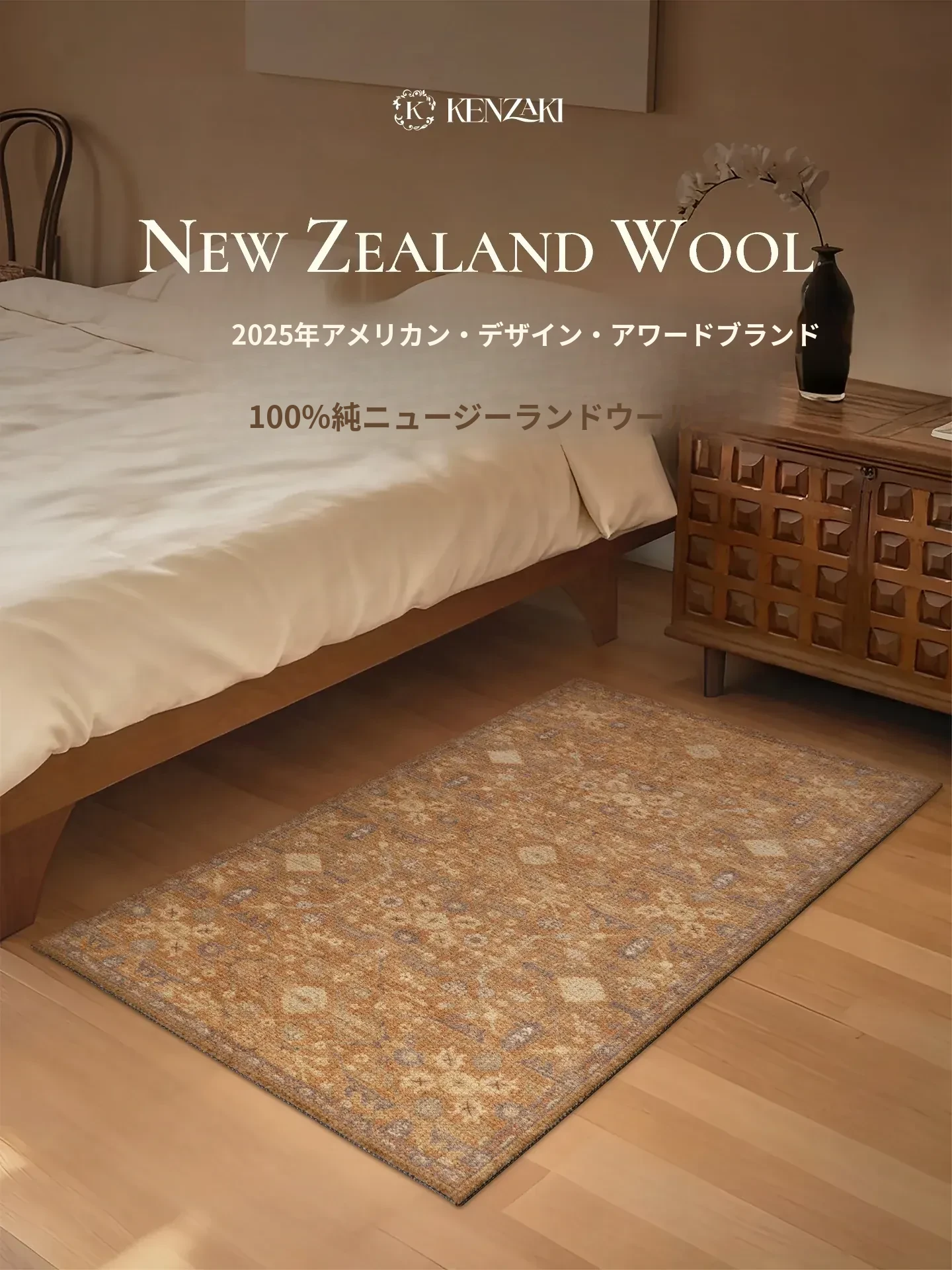 100%純ニュージーランドウール使用!上質で高級感あふれるフレンチレトロスタイルのベッドサイドカーペット。おしゃれなブラウンカラーで、寝室にぴったりの新作登場!