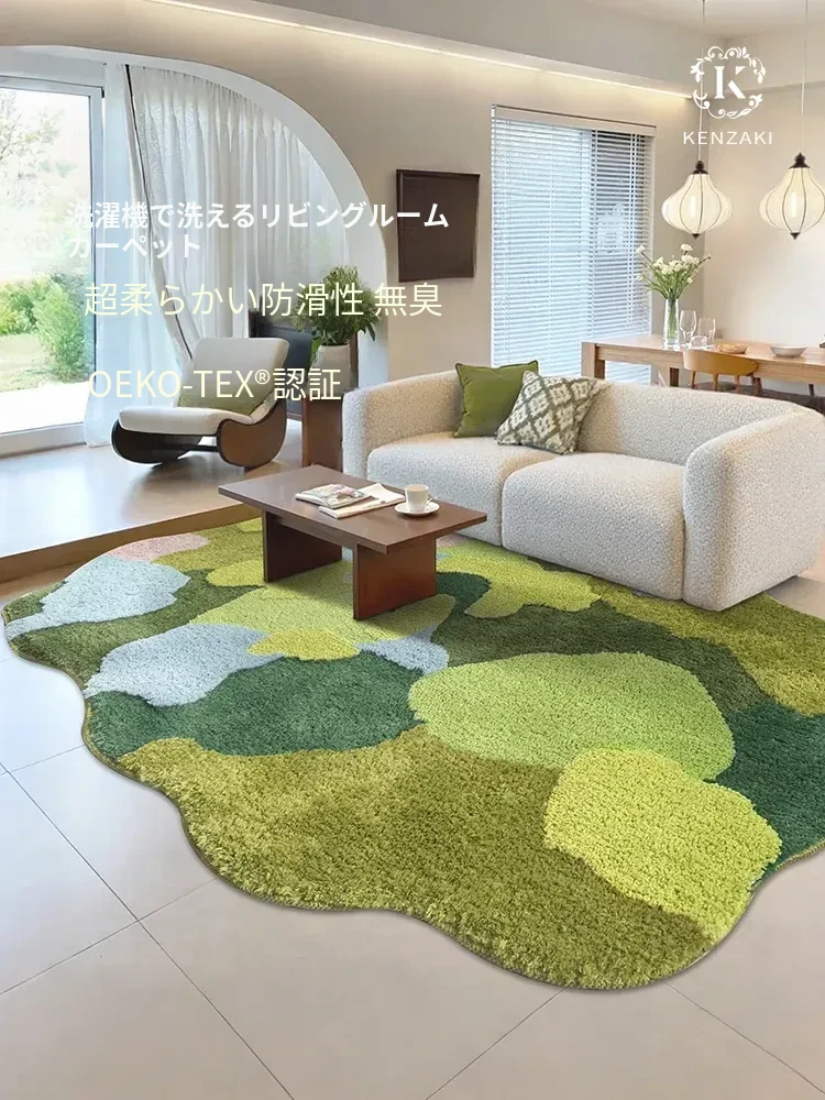 新作!高級感漂流するリビングルーム用カーペット - ソファやテーブルにぴったりのグリーンモスデザイン。洗濯機で洗える便利さとユニークな形状で、寝室のベッドサイドにも最適です。あなたの空間をおしゃれに演出!
