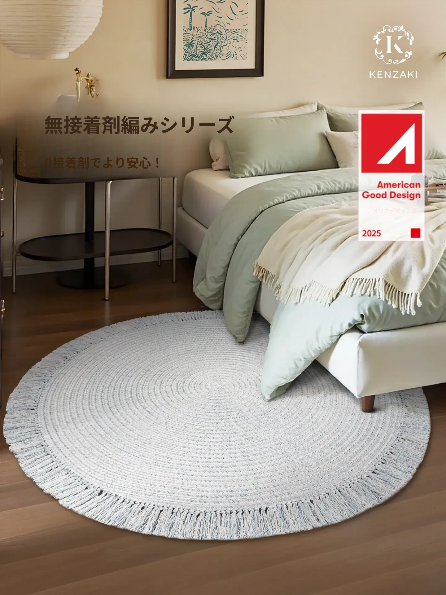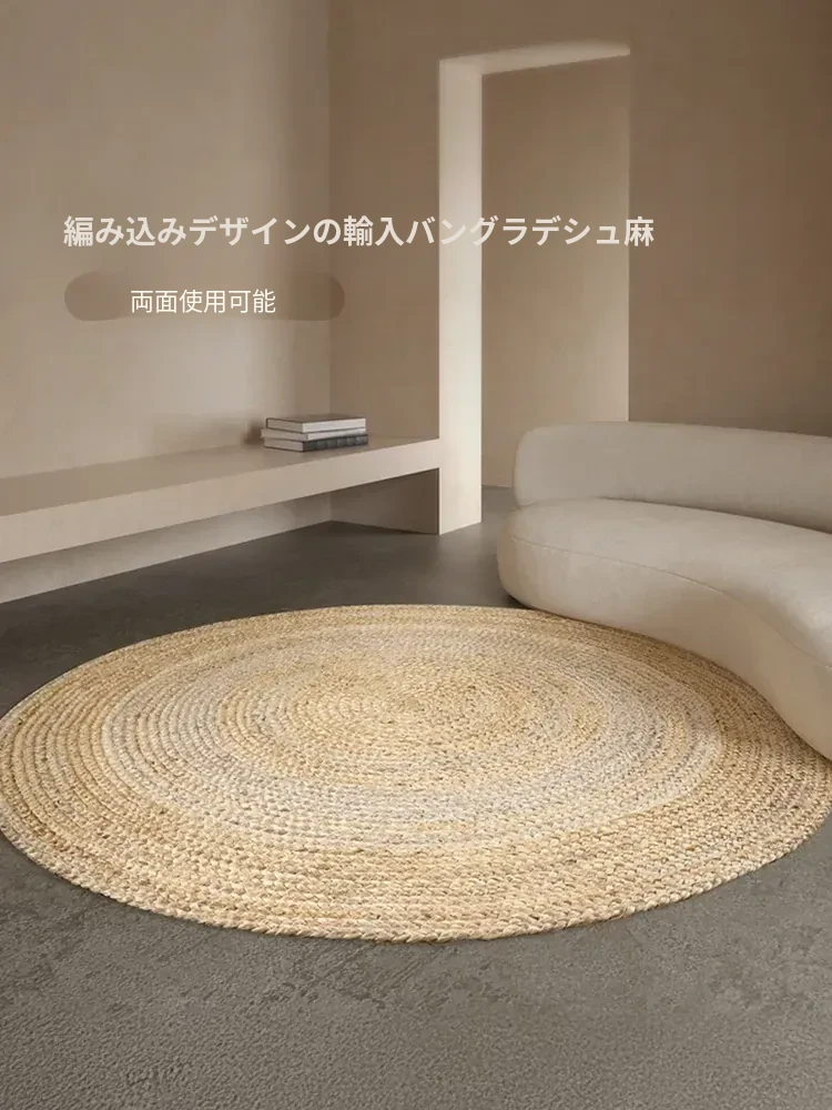 KENZAKI 天然黄麻手工編みの侘寂風ラウンドリバーシブルカーペット - 自然な風合いで心地よい空間を演出し、和の美しさを引き立てる無接着のエコフレンドリーなデザイン。