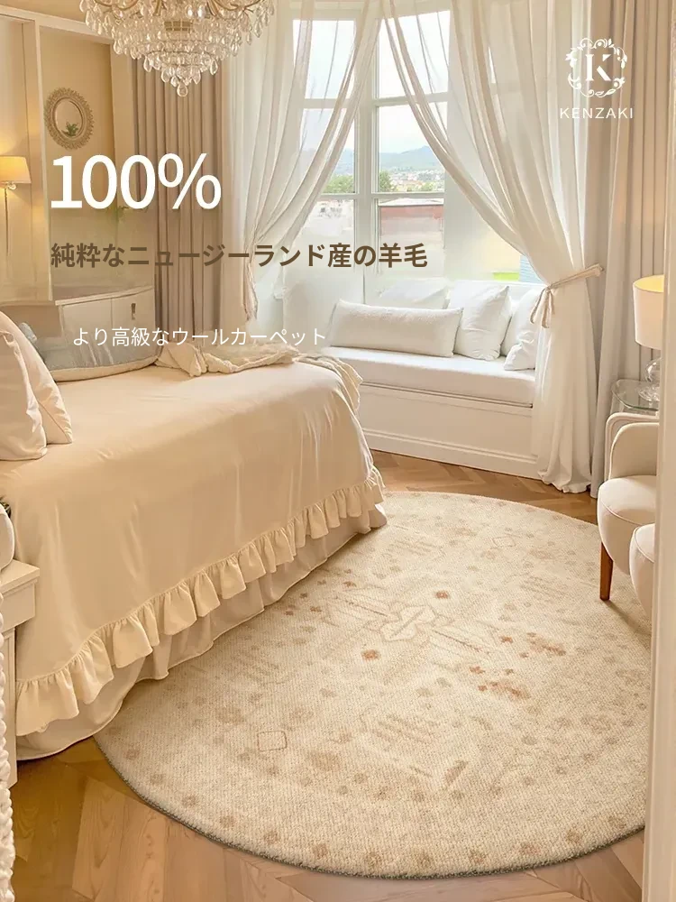 100%ニュージーランドウール使用!ラグジュアリーなフレンチスタイルのラウンドカーペット、洗濯不要で高級感溢れるリビングルームに最適!ソファやコーヒーテーブルの下にぴったりなヴィンテージデザイン。