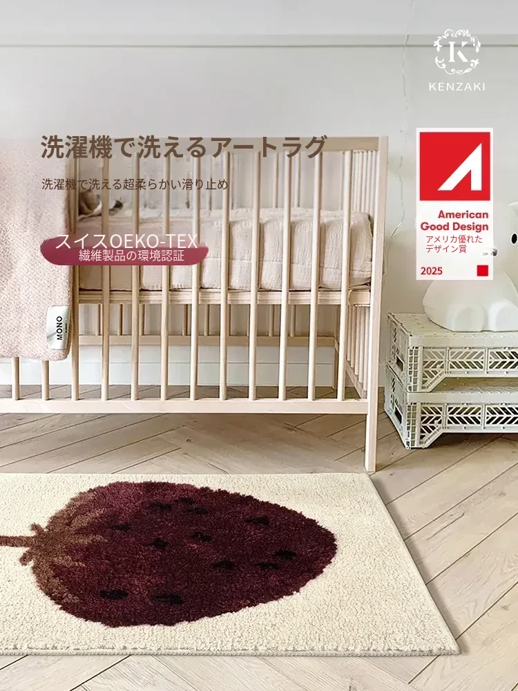 女の子のための可愛いフルーツストロベリーのラグ - 子供部屋やリビングに最適!ベッドサイドマットとしても使え、滑り止め機能付きで安心。洗濯機で簡単に洗えるので、いつでも清潔に保てます!