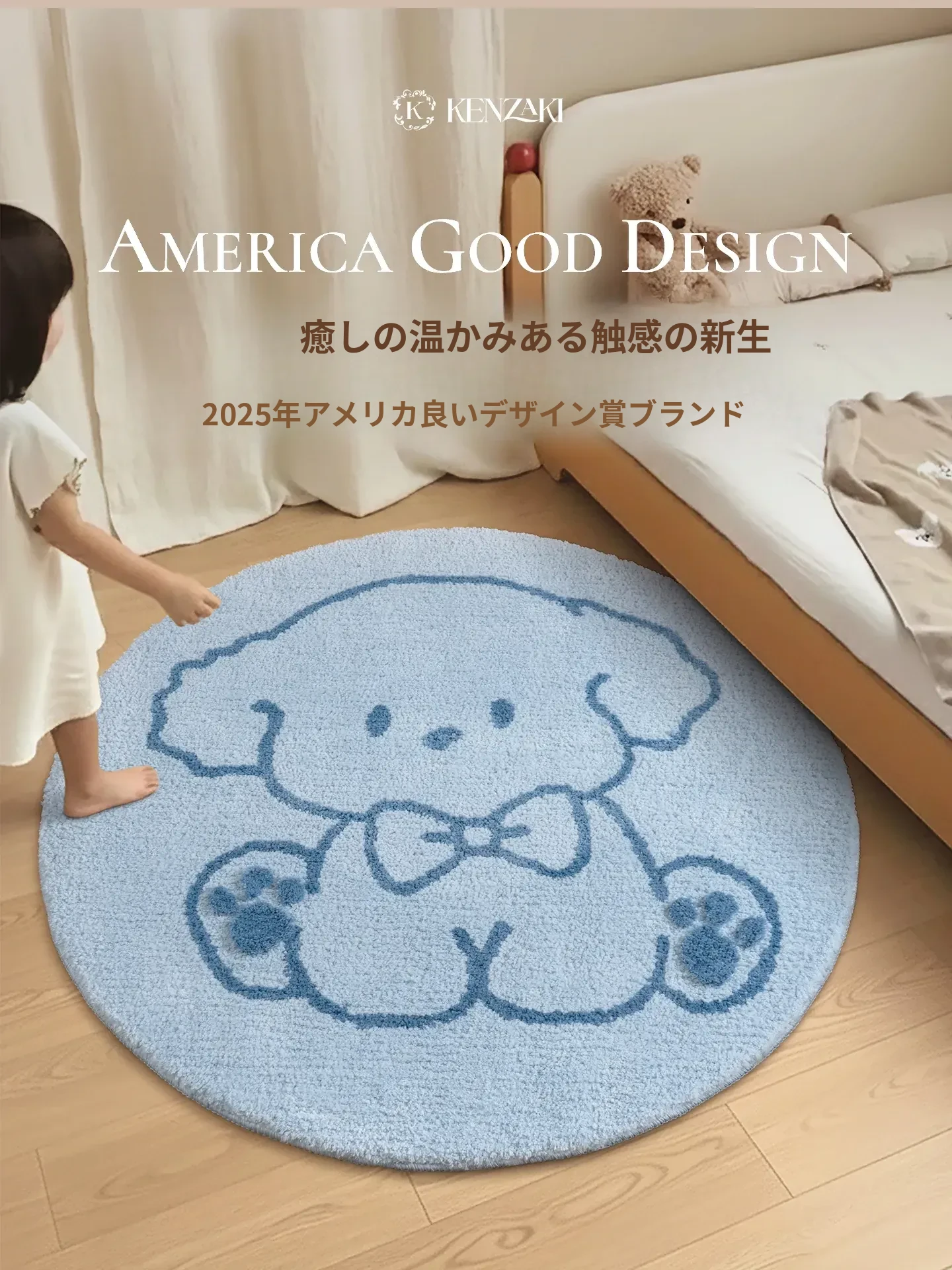 子供用ラグ カーペット 丸型 ベッドサイドマット 男の子・女の子向け お部屋にぴったり!かわいい青い犬のデザインで、軽やかで豪華な雰囲気。洗濯機で洗えるから、お手入れも簡単!